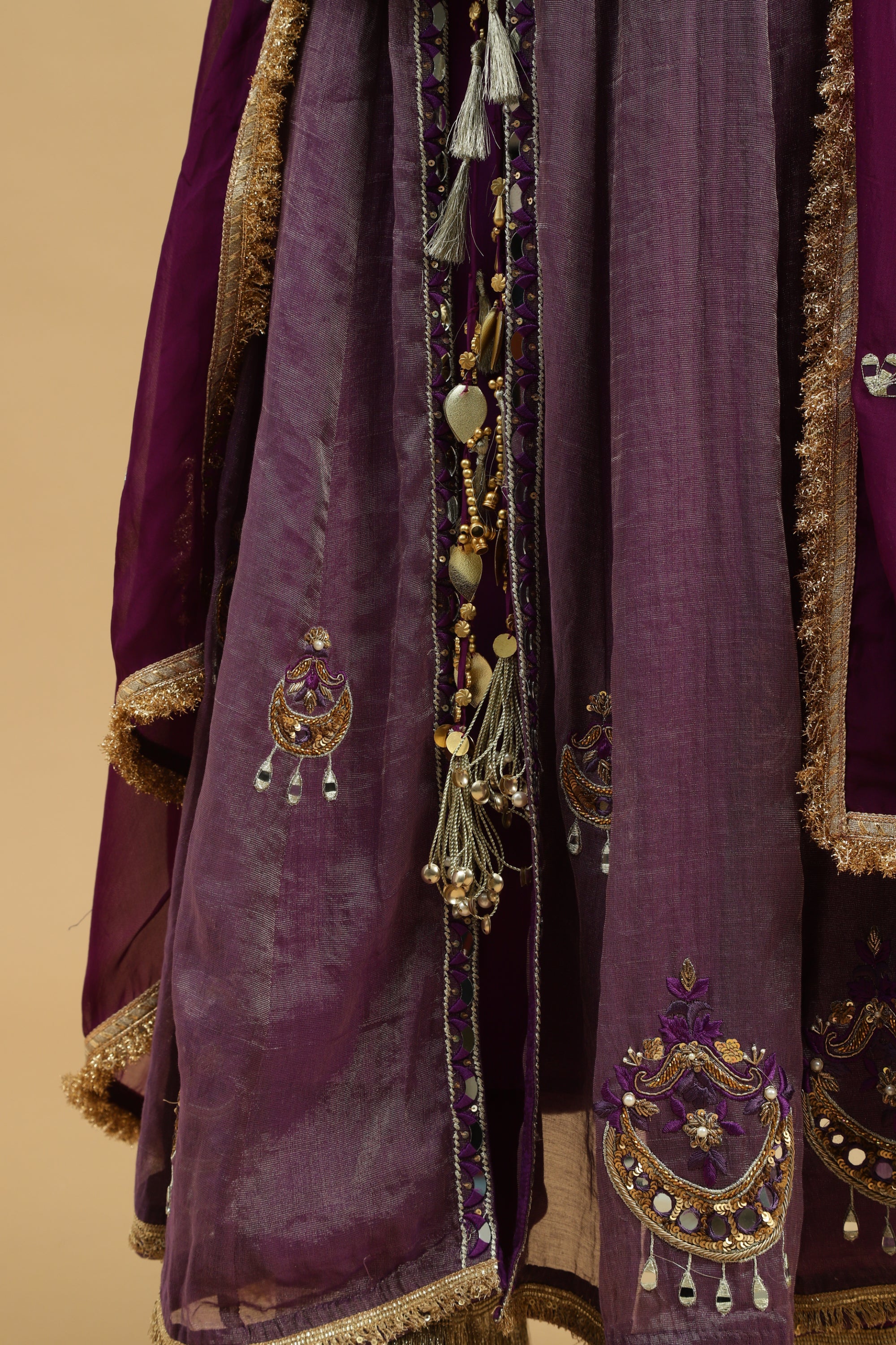 This stunning purple anarkali exudes timeless elegance, featuring intricate details and a flattering silhouette. The outfit comes with a detachable slip that enhances its graceful flow, making it the perfect choice for both formal and festive occasions. Paired with matching straight pants and a complementary dupatta, this ensemble offers a sophisticated look that balances tradition with modern flair. Ideal for weddings, receptions, and special celebrations, this ensemble effortlessly combines comfort and style. Elevate your wardrobe with this beautiful piece that celebrates the essence of Indian couture with a contemporary touch.