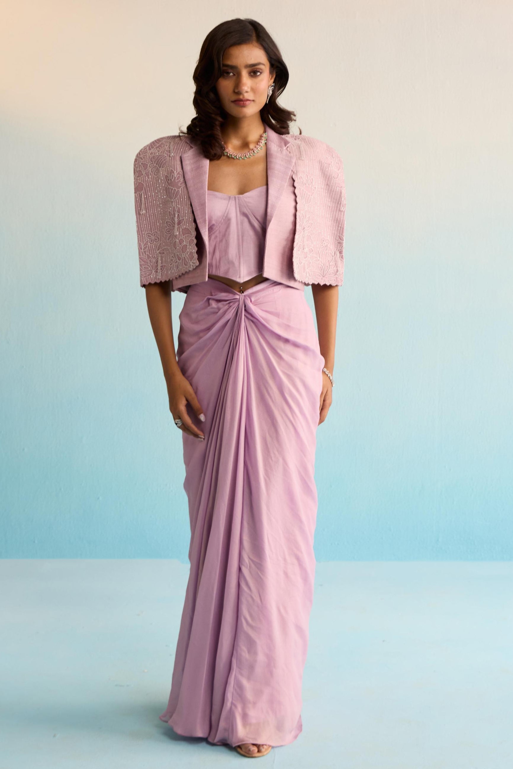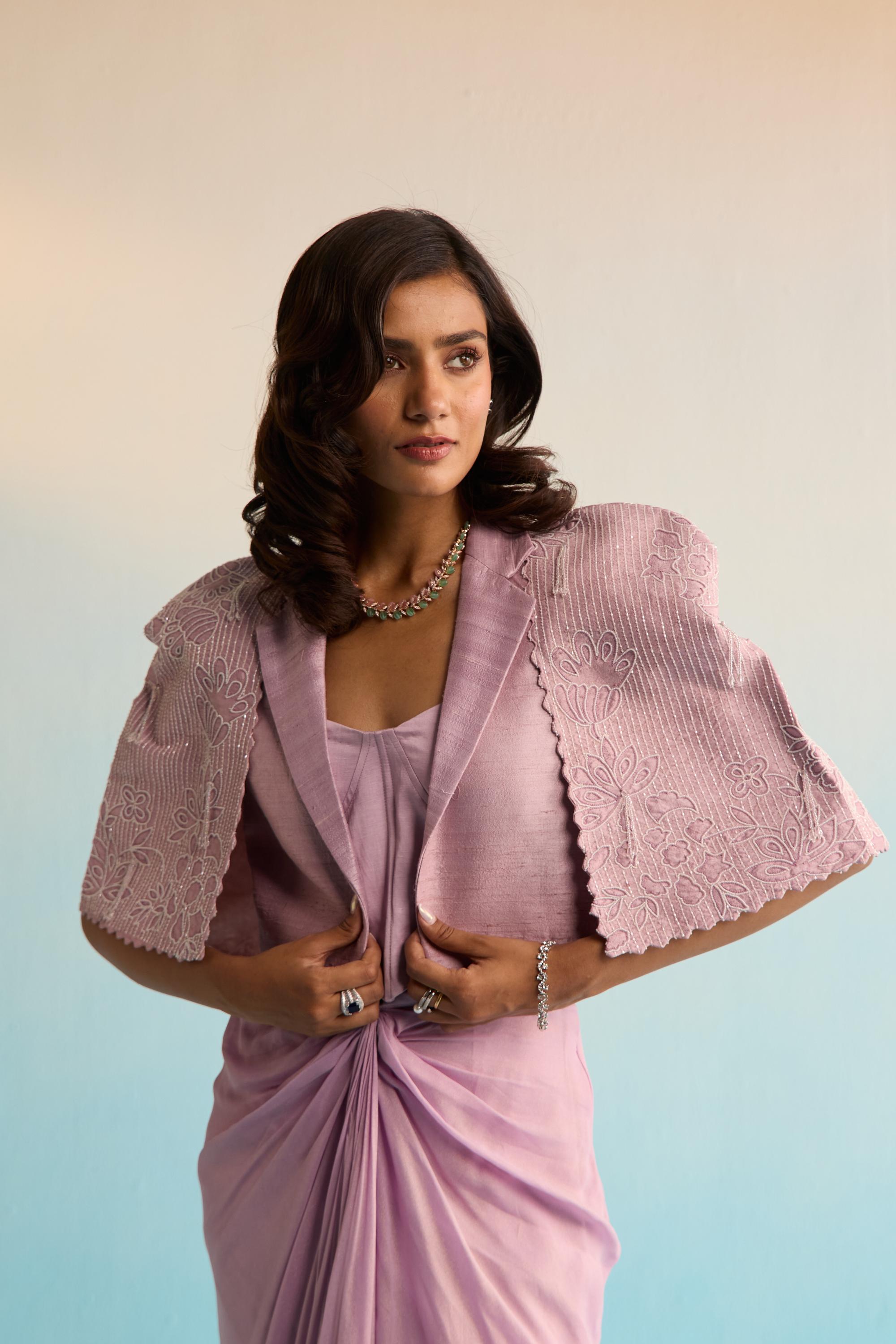 Regal and contemporary, the Purple Bahaar Velany Cape with Skirt is a celebration of modern elegance wrapped in rich tradition. Crafted in a luxurious purple hue, this ensemble features a delicately embroidered blouse, a fluid skirt, and a sheer cape that adds drama and grace in equal measure. Perfect for sangeet nights, wedding receptions, or festive soirées, the Purple Bahaar Velany Cape with Skirt is designed for the woman who commands attention with poise and timeless style.