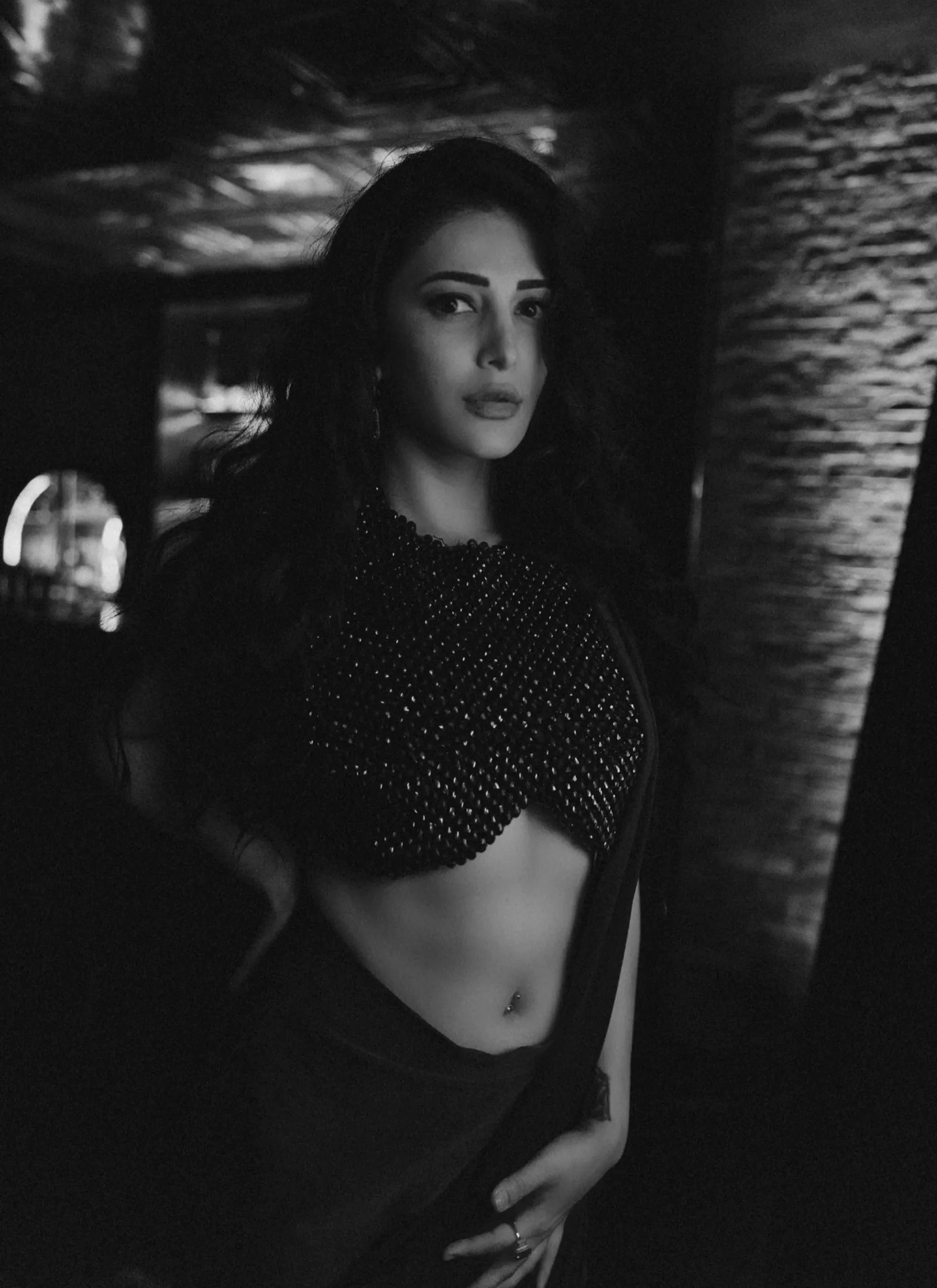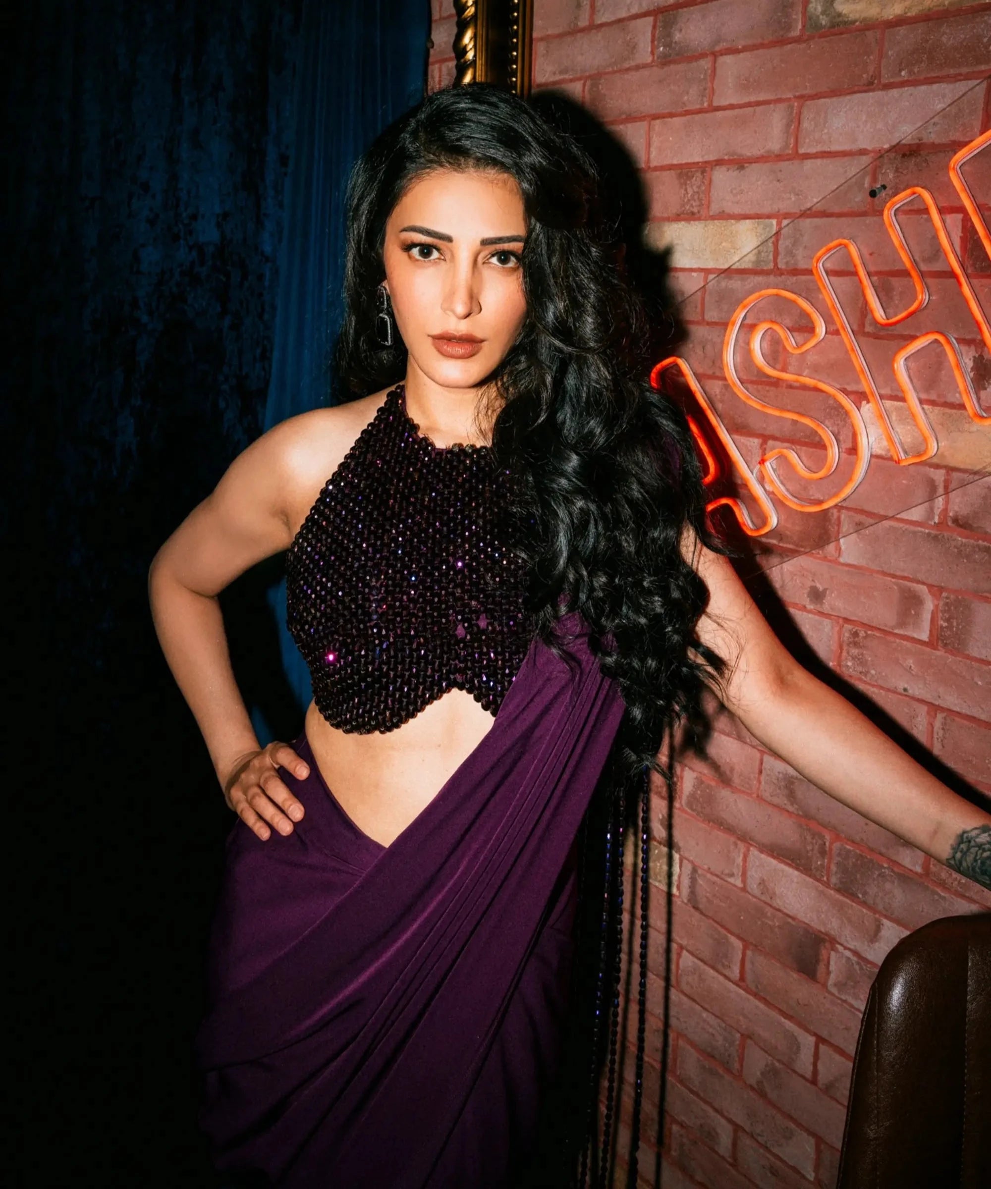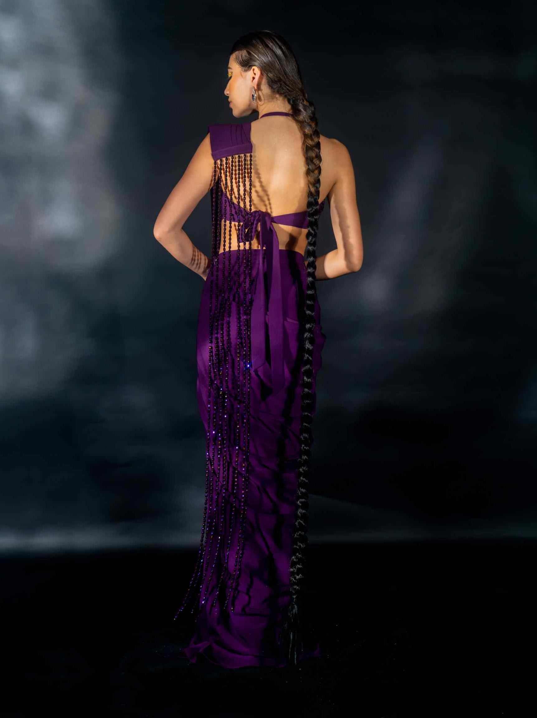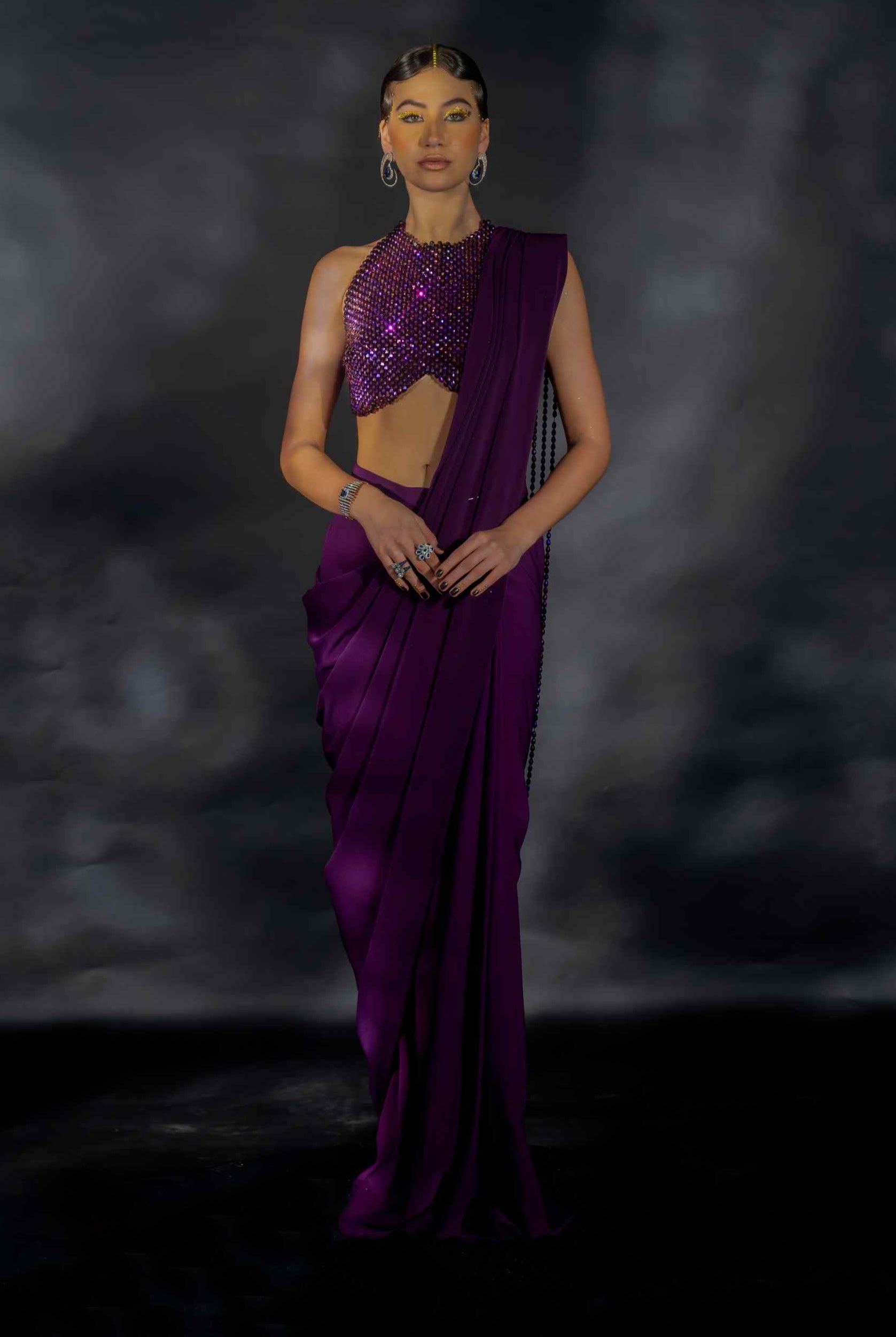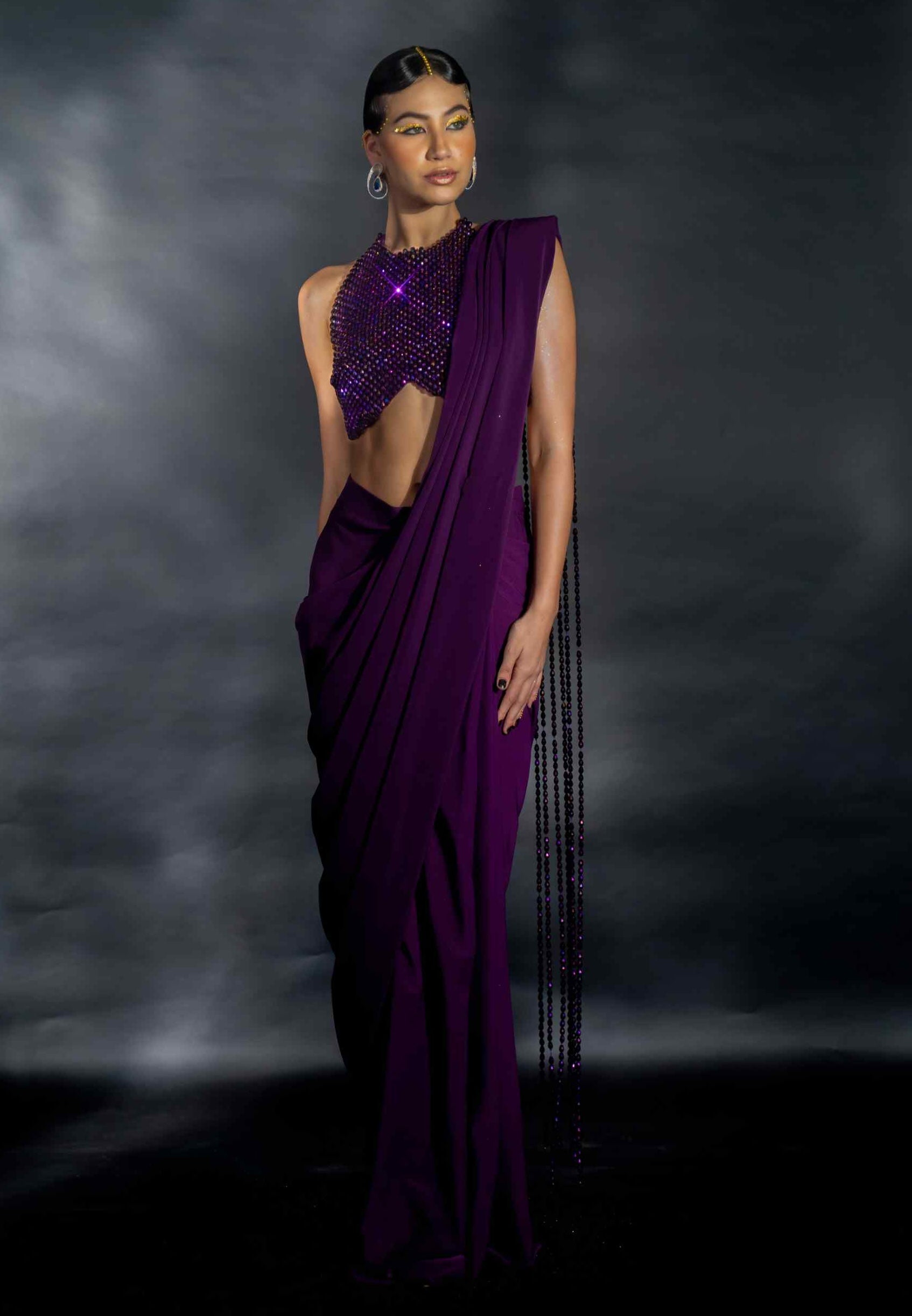 Elevate your style with our luxurious purple saree ensemble, featuring a bead-encrusted blouse and complemented by striking purple holographic bead strings. The blouse is meticulously adorned with rich purple beads, adding a touch of opulence and texture. Paired with a flowing purple saree, this outfit is further enhanced by holographic bead strings that catch the light and provide a captivating, modern twist. Perfect for weddings, galas, or special celebrations, this ensemble seamlessly blends traditional elegance with contemporary glamour for an unforgettable look.