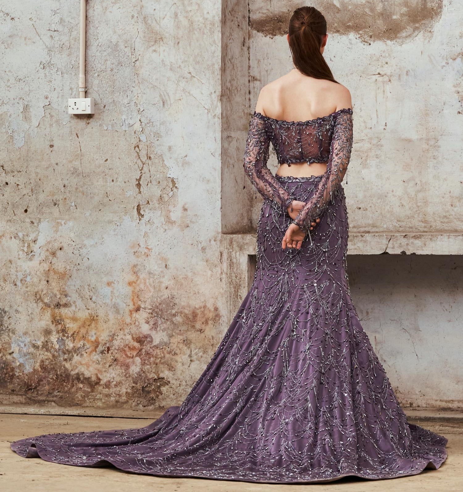This off-shouldered top and mermaid skirt set is beautifully hand-embroidered with delicate floral elements and handcrafted dangling strings, adding a touch of artistry. The cutwork edges and sheer details enhance the elegance, while the dramatic train brings a sense of grandeur and movement. Perfect for making a bold, yet delicate, statement at any special occasion, this ensemble blends sophistication with modern flair.