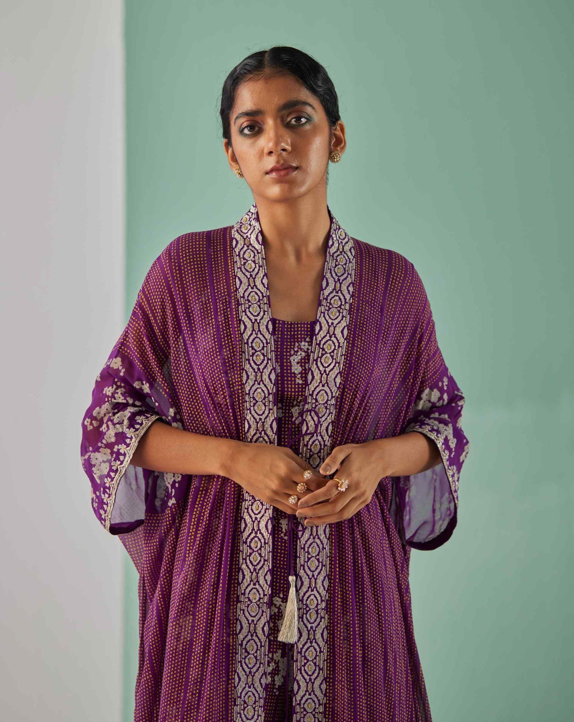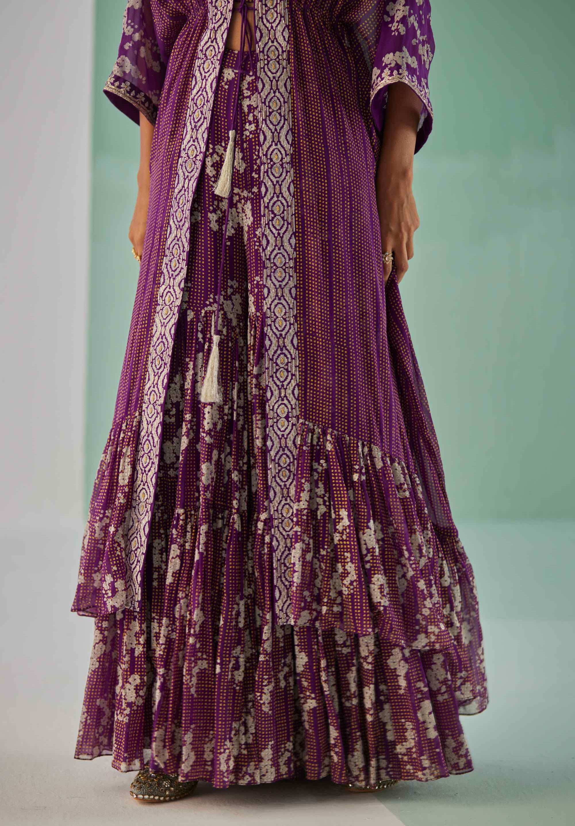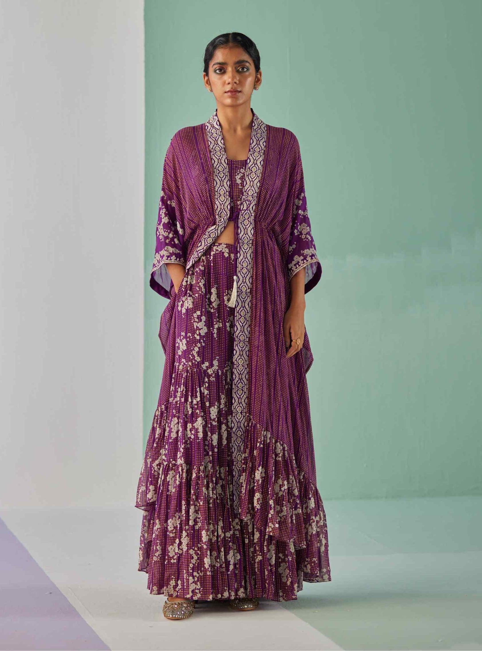Our purple custom block printed cape features a striking combination of yellow and beige prints, enhanced with luxurious mirror, dabka, and bead embroidery. This exquisite cape is paired with a coordinating printed blouse and a tiered sharara, creating a harmonious and elegant ensemble. Ideal for adding a touch of opulence and modern flair to your wardrobe, this set is perfect for special occasions and celebrations, ensuring you make a memorable impression with every wear.