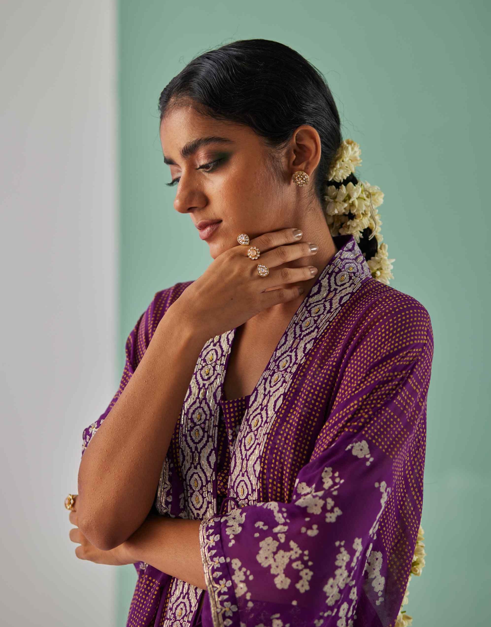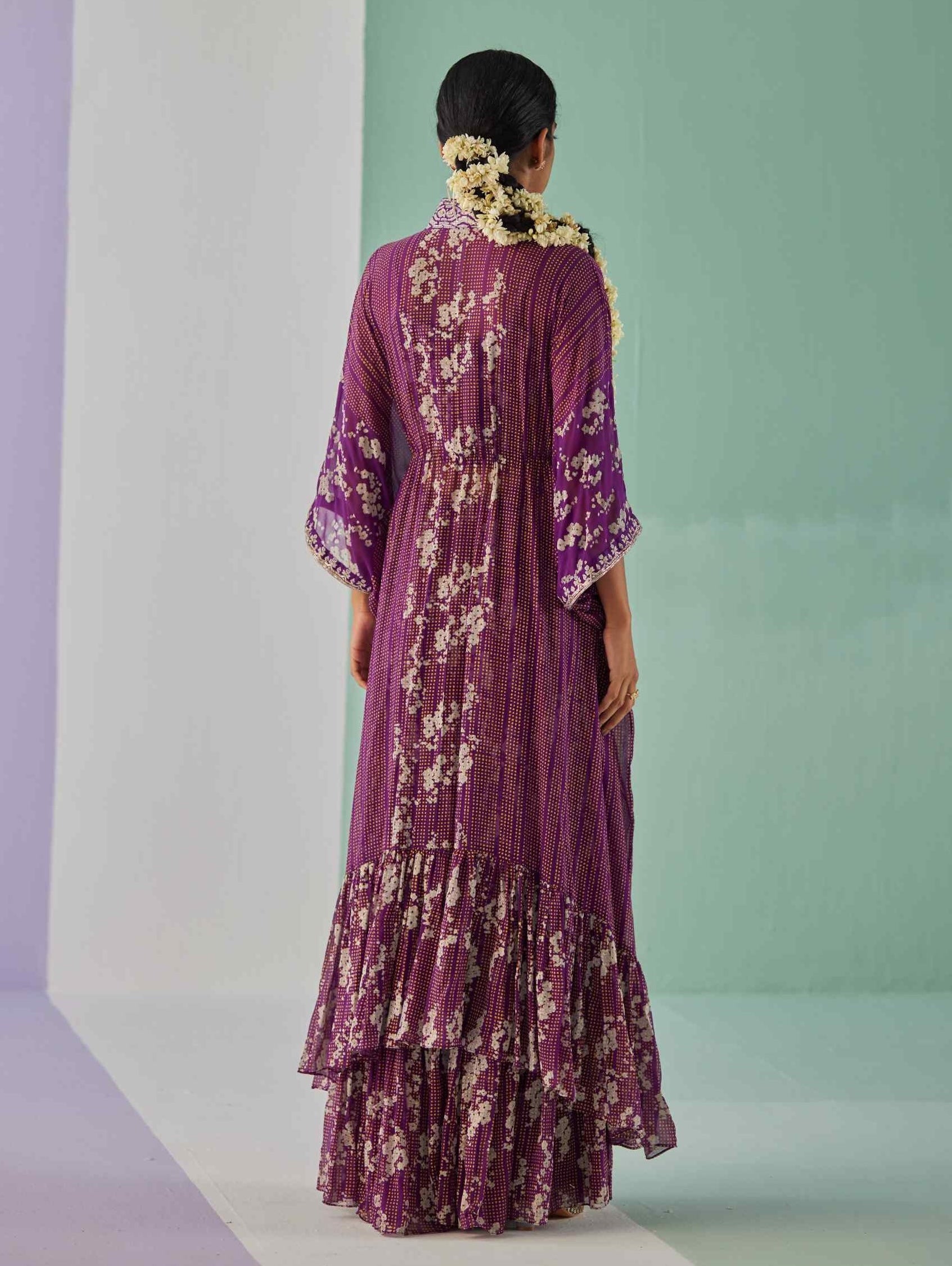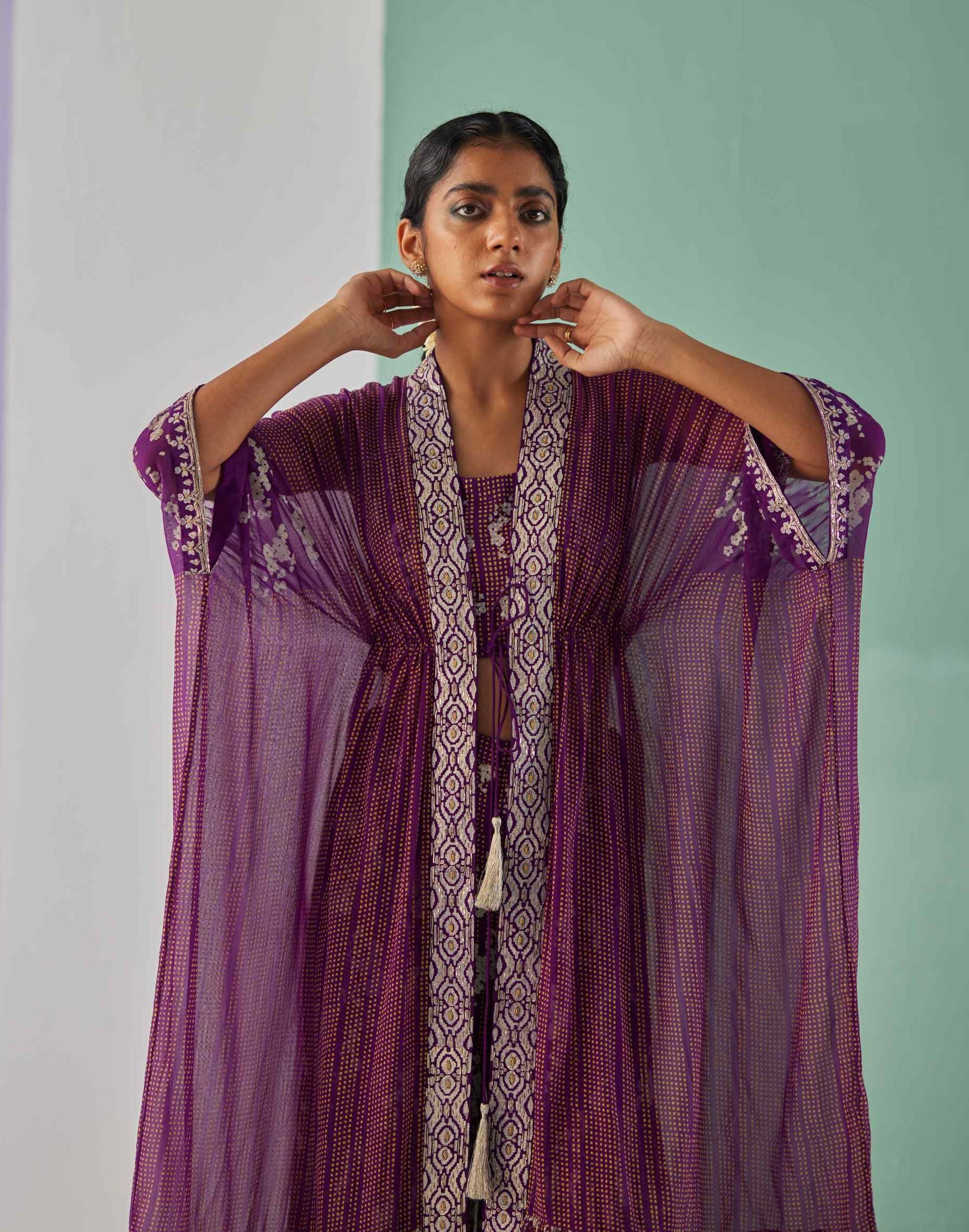 Our purple custom block printed cape features a striking combination of yellow and beige prints, enhanced with luxurious mirror, dabka, and bead embroidery. This exquisite cape is paired with a coordinating printed blouse and a tiered sharara, creating a harmonious and elegant ensemble. Ideal for adding a touch of opulence and modern flair to your wardrobe, this set is perfect for special occasions and celebrations, ensuring you make a memorable impression with every wear.