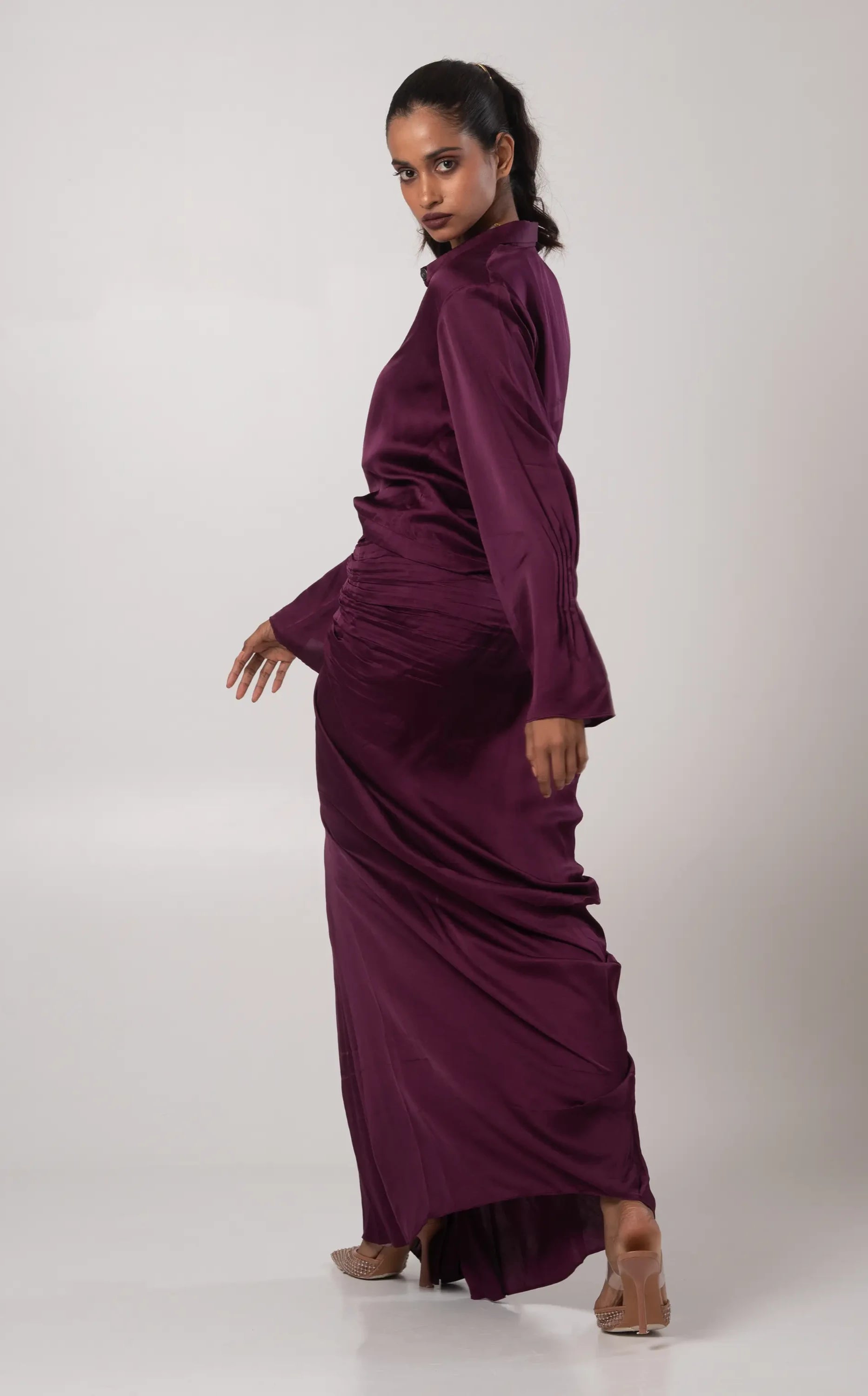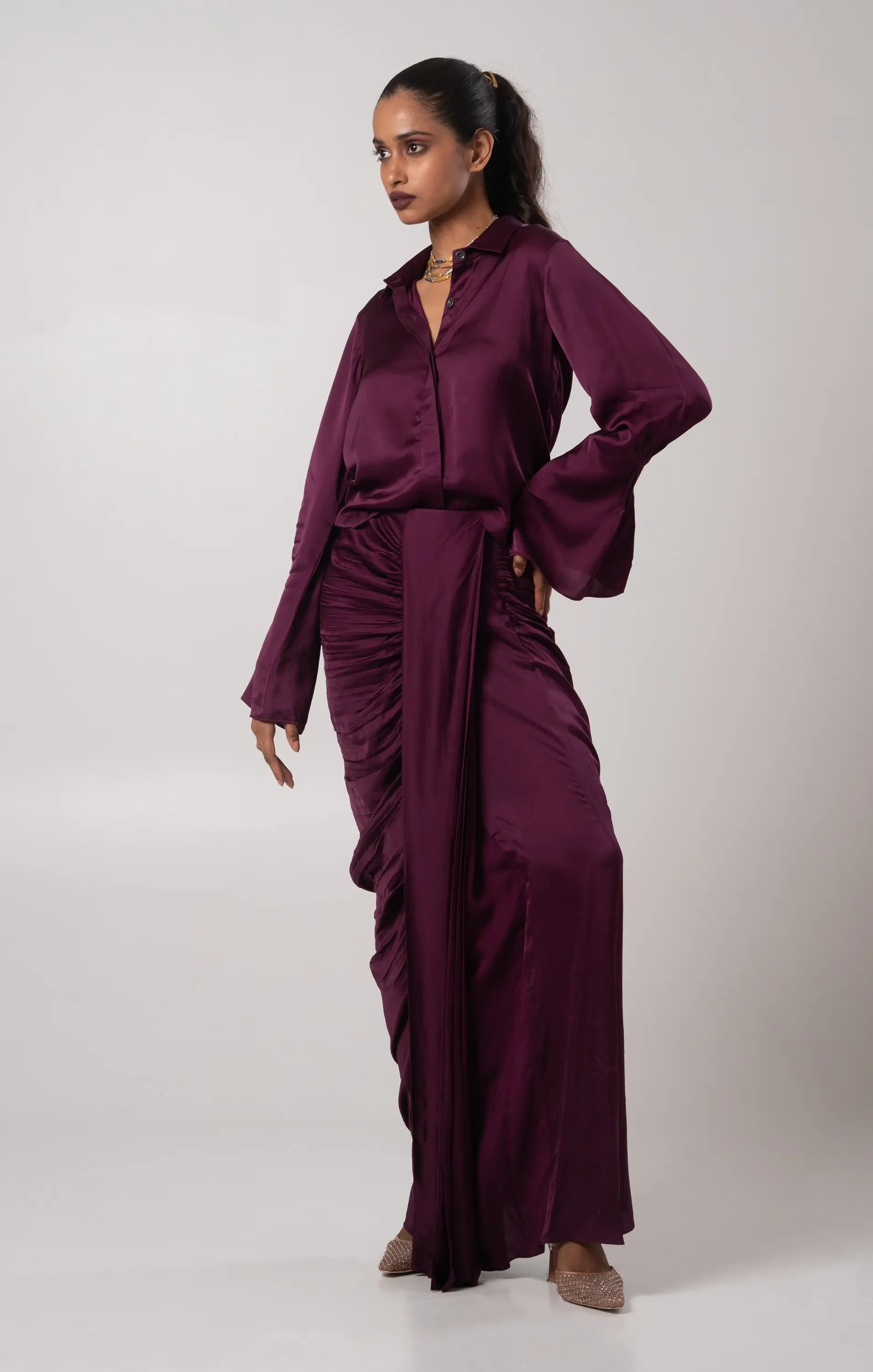 This chic cropped shirt features unique pleat detailing at the sleeves, adding texture and movement to its sleek, modern design. The short length creates a flattering silhouette, perfect for pairing with high-waisted bottoms or skirts. The shirt is complemented by a draped skirt that flows gracefully, offering an elegant and feminine look. The draping adds an element of fluidity and sophistication, making this ensemble perfect for both casual and semi-formal occasions. Ideal for those seeking a stylish yet comfortable outfit, this set effortlessly combines contemporary style with timeless appeal.