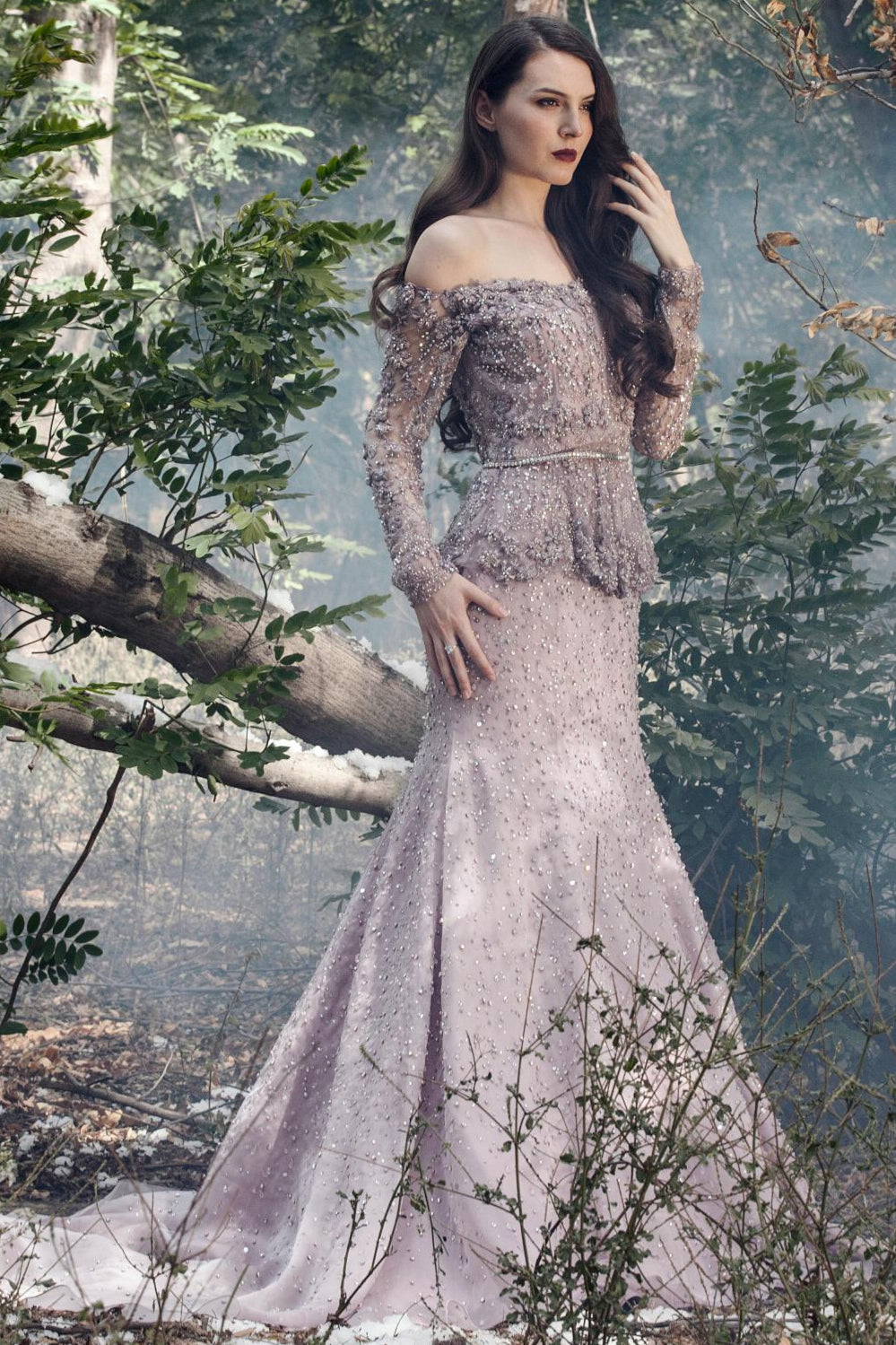 Indulge in ethereal elegance with this purple crystal and 3D flower-embellished peplum top and skirt set, a perfect fusion of romantic charm and modern sophistication. The rich purple hue adds a regal touch, while the intricately handcrafted 3D floral appliquŽs bring depth and texture to the ensemble. The peplum silhouette flatters the figure, creating a graceful yet contemporary aesthetic. Delicate crystal embellishments add a touch of shimmer, making this set an exquisite choice for wedding festivities, cocktail soirŽes, and grand celebrations.