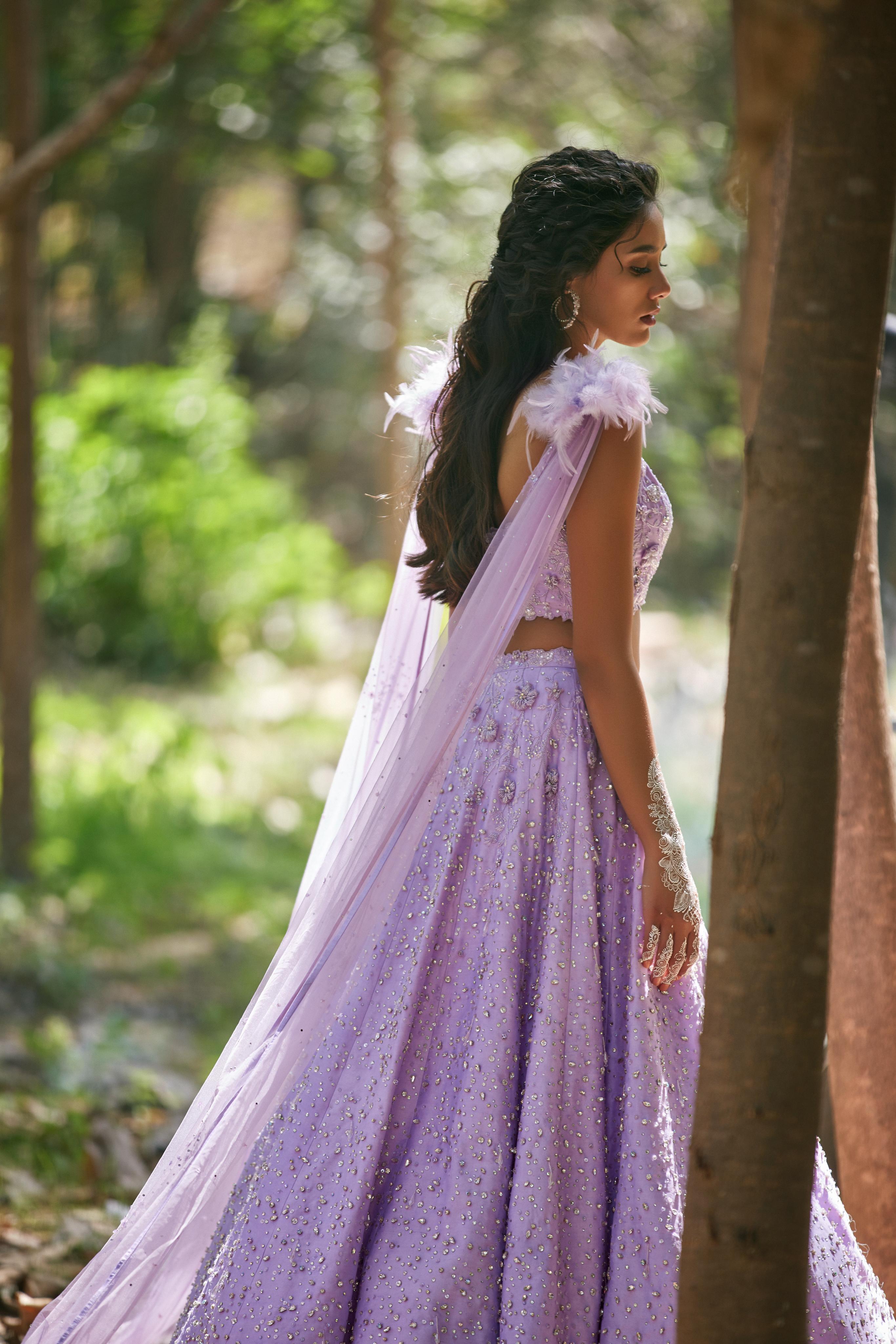 Step into a world of ethereal elegance with this purple crystal-embellished lehenga with feathers, a masterpiece of luxury and artistry. The deep purple hue radiates regal sophistication, while the intricate crystal embellishments add a mesmerizing sparkle. Delicate feather accents bring a touch of drama and movement, creating a statement-worthy silhouette perfect for weddings, receptions, and grand soirŽes. Designed for those who love opulent couture, this lehenga set ensures an unforgettable presence.
