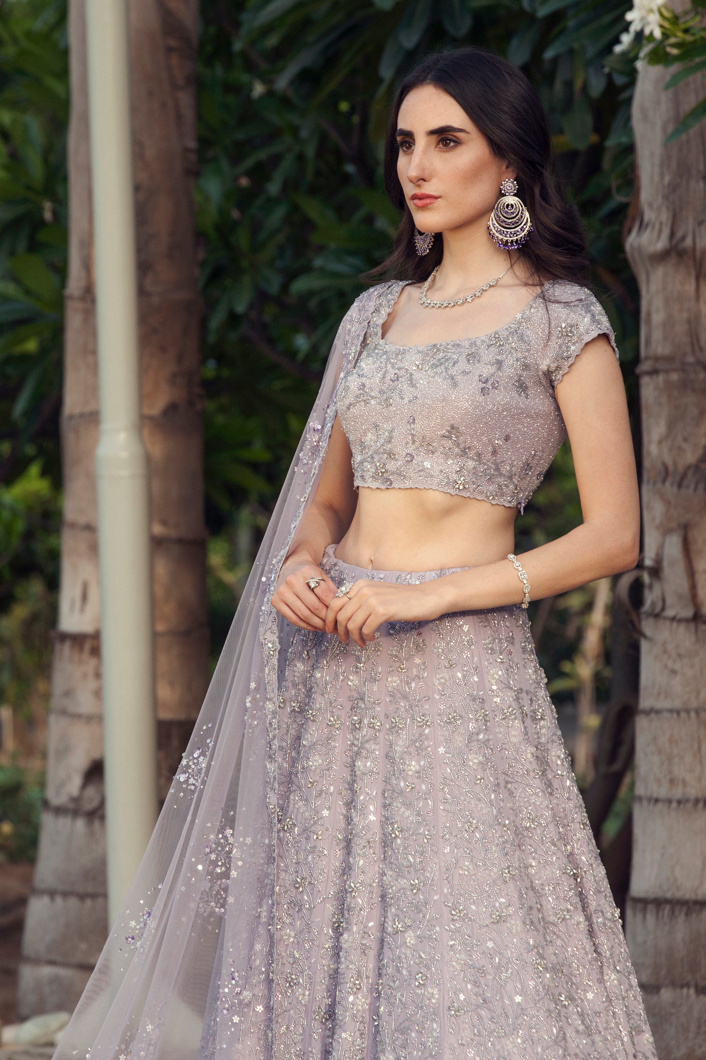Radiate elegance in this purple crystal-embellished lehenga set, a stunning fusion of sophistication and contemporary charm. The rich blue hue exudes a regal allure, while the intricate crystal embellishments add a mesmerizing shimmer, ensuring a captivating presence at weddings, receptions, and grand festive celebrations. Crafted for those who appreciate refined luxury, this lehenga set embodies timeless beauty with a modern edge.