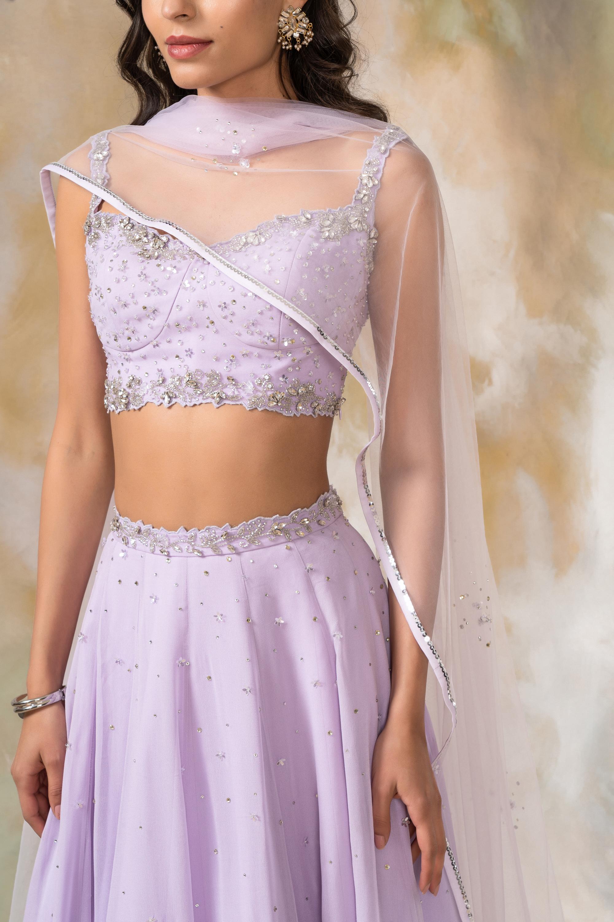 Dazzle in opulence with this purple crystal and sequin lehenga set, a breathtaking fusion of intricate embellishments and regal elegance. The rich purple hue exudes sophistication, while the shimmering sequin work and crystal detailing create a mesmerizing interplay of light and texture. Designed for grand celebrations, receptions, and festive soirŽes, this lehenga set ensures a striking silhouette that captivates with every step.