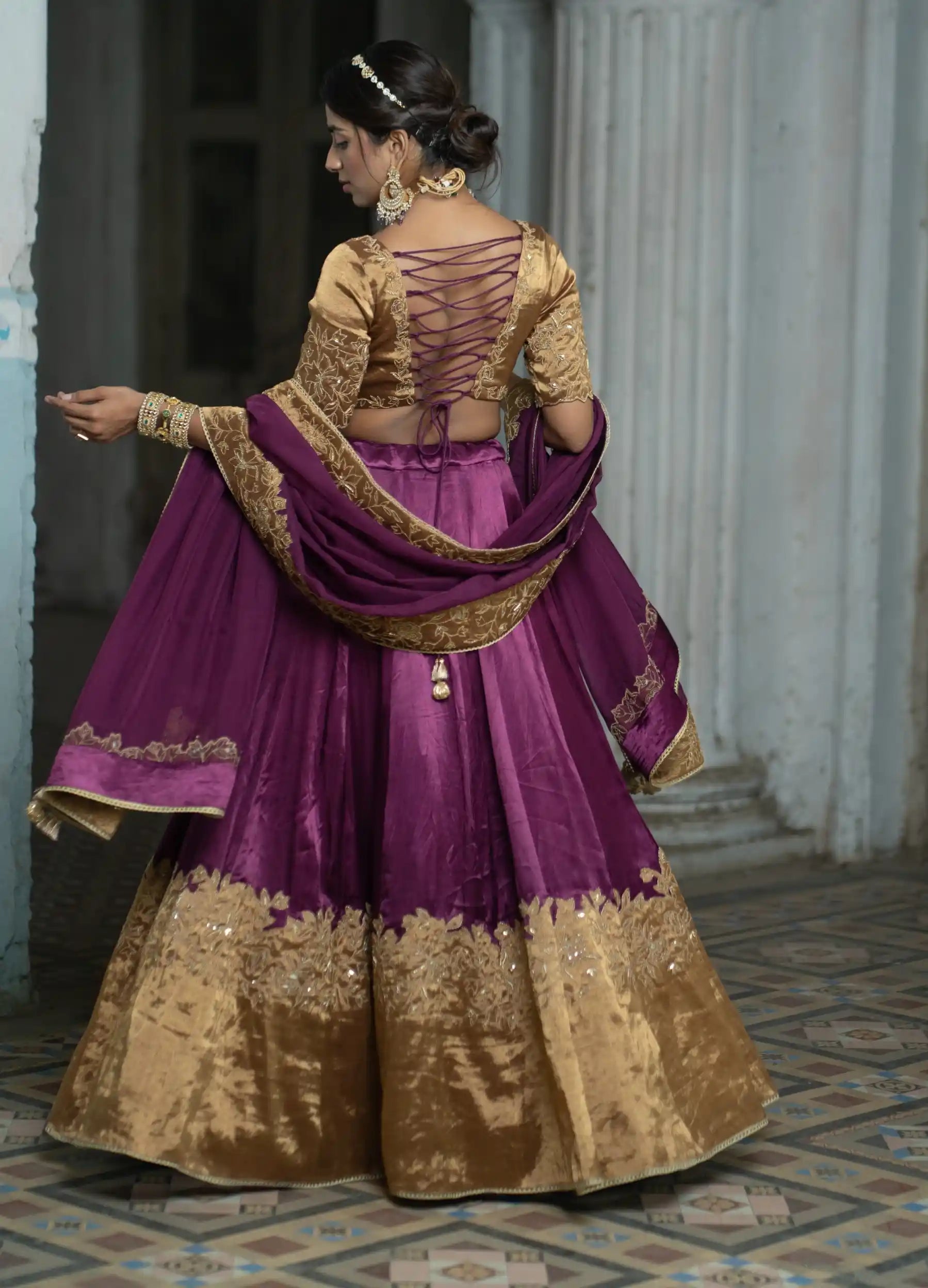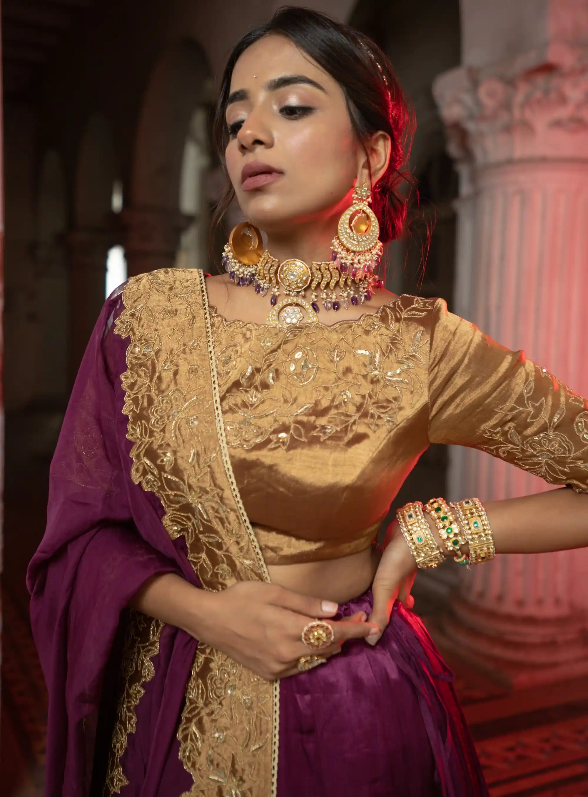 This stunning ensemble features a purple lehenga adorned with intricate cut-work embroidery, creating a striking and elegant design. The lehenga is complemented by a dark gold blouse, adding a touch of opulence and contrast. The outfit is completed with a matching dupatta that enhances the overall look with its graceful drape. Perfect for special occasions, this combination of rich purple and dark gold, along with detailed embroidery, offers a sophisticated and memorable appearance.