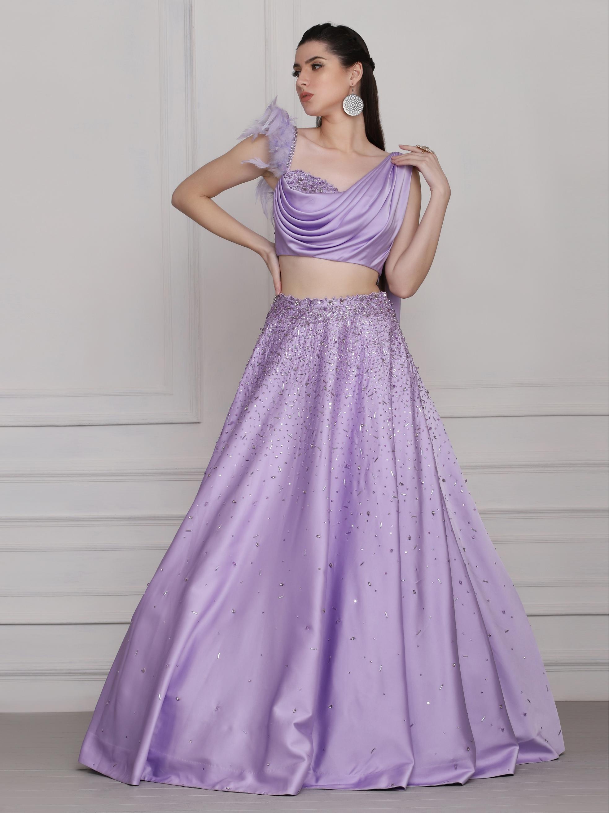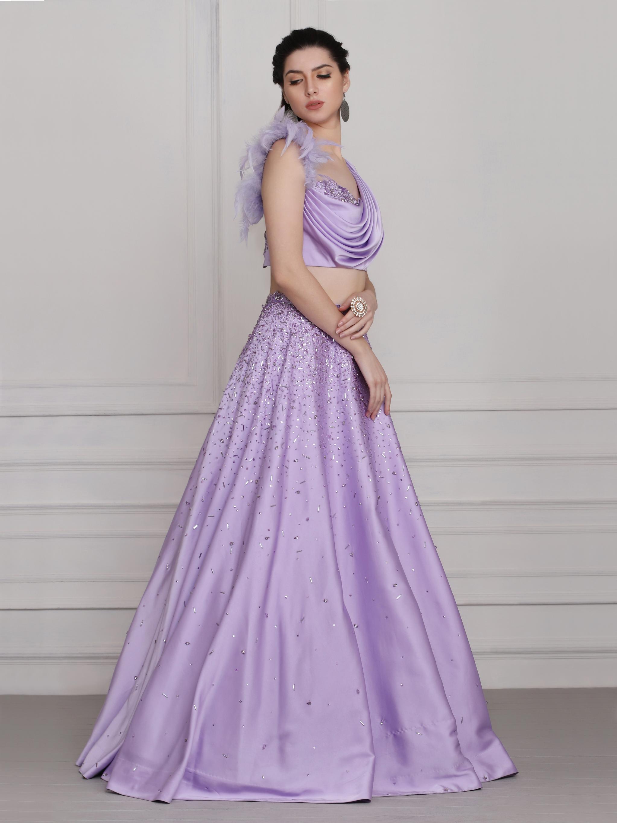 Embrace effortless sophistication with this purple draped blouse and skirt set, a perfect fusion of contemporary elegance and timeless charm. The fluid draped blouse adds a touch of modern glamour, while the sleek, flowy skirt creates a striking yet graceful silhouette. The rich purple hue enhances the ensembleÕs regal appeal, making it an ideal choice for cocktail soirŽes, festive celebrations, and wedding receptions. Designed for those who love refined luxury, this set ensures a statement-making presence with minimal effort.
