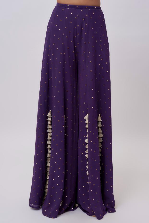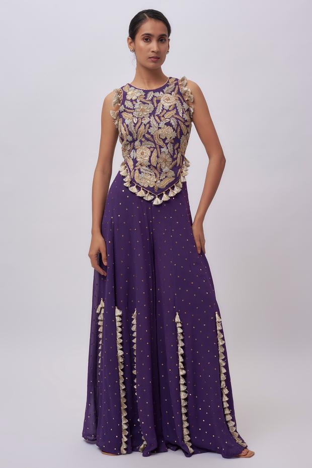 Striking the perfect balance between regal charm and modern edge, this purple ensemble is a true showstopper. The intricately embroidered blouse catches the light with every move, while the flowing sharara adds depth and drama. Bold yet graceful, it's designed for those who love to make an entrance. Whether it's a festive gathering or a special celebration, this set ensures you're the highlight of the evening.