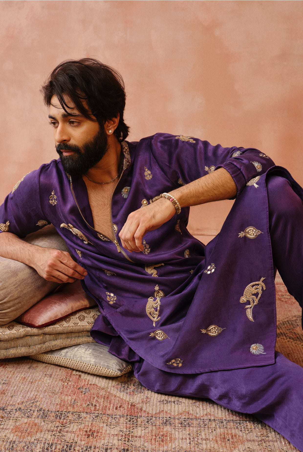 Make a bold statement with this purple satin embroidered bomber kurta, designed to blend traditional elegance with modern style. The luxurious satin fabric features intricate embroidery that adds a touch of sophistication, making it perfect for both festive occasions and casual outings.