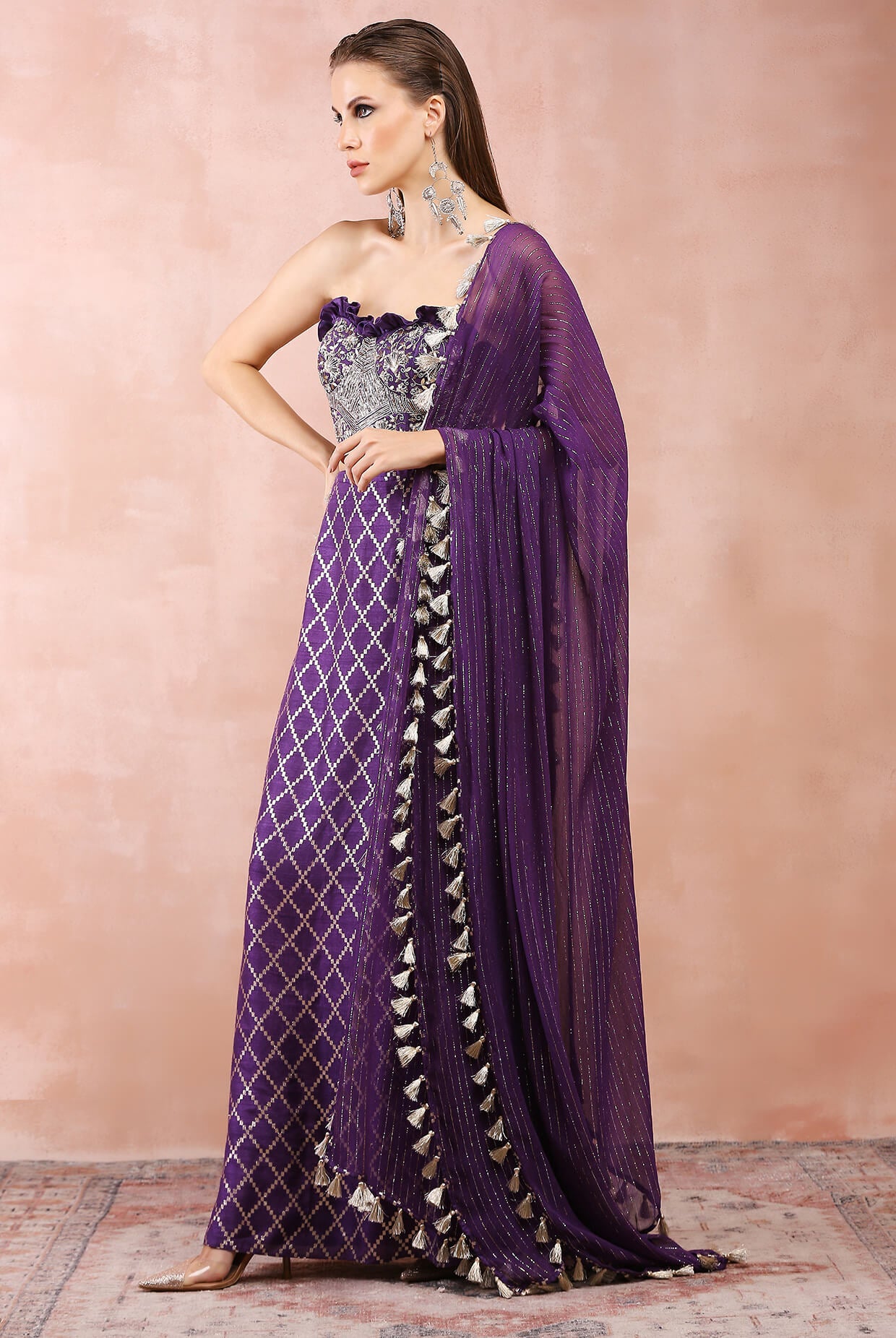 Unveil sophisticated charm with our Purple Satin Embroidered Corset Bustier, designed to accentuate your silhouette with its luxurious satin finish and detailed embroidery. Paired with a flowing Chex Dola Silk Skirt that offers both elegance and comfort, this ensemble is enhanced by a shimmering Lurex Georgette Dupatta. Perfect for upscale events and special occasions, it effortlessly combines classic opulence with modern flair, ensuring you stand out with grace and style.