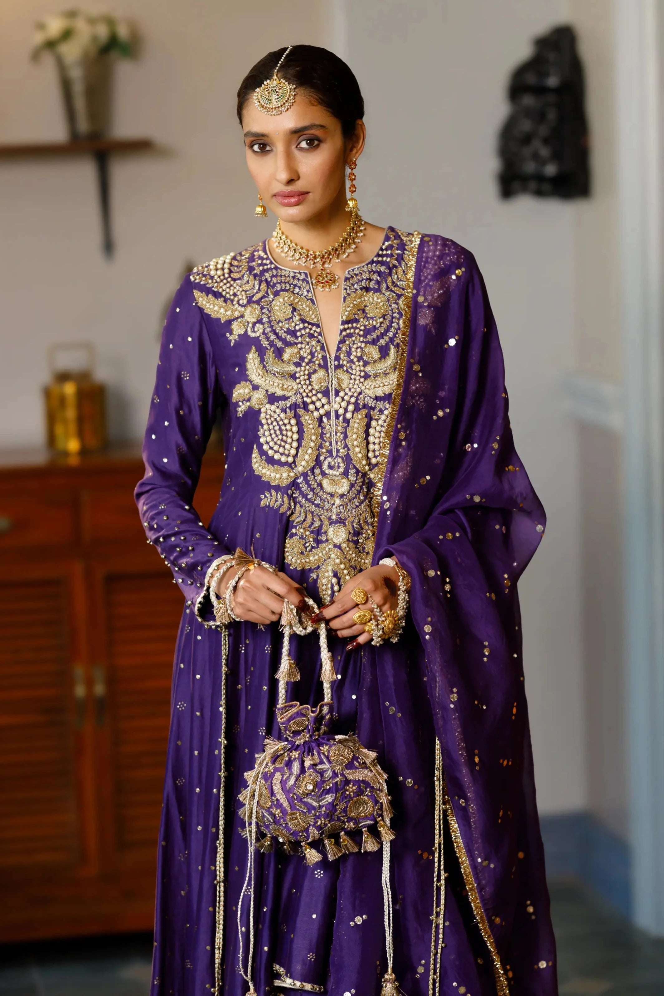 The Zinat Purple Embroidered High-Low Anarkali paired with a classic churidar and a matching dupatta offers a refined and graceful look. The intricate embroidery on the Anarkali adds a luxurious touch, while the high-low hemline creates a flattering silhouette. The churidar complements the ensemble, and the dupatta elevates the look with a perfect finish. Ideal for weddings, festivals, and formal occasions, this set blends traditional charm with modern elegance.