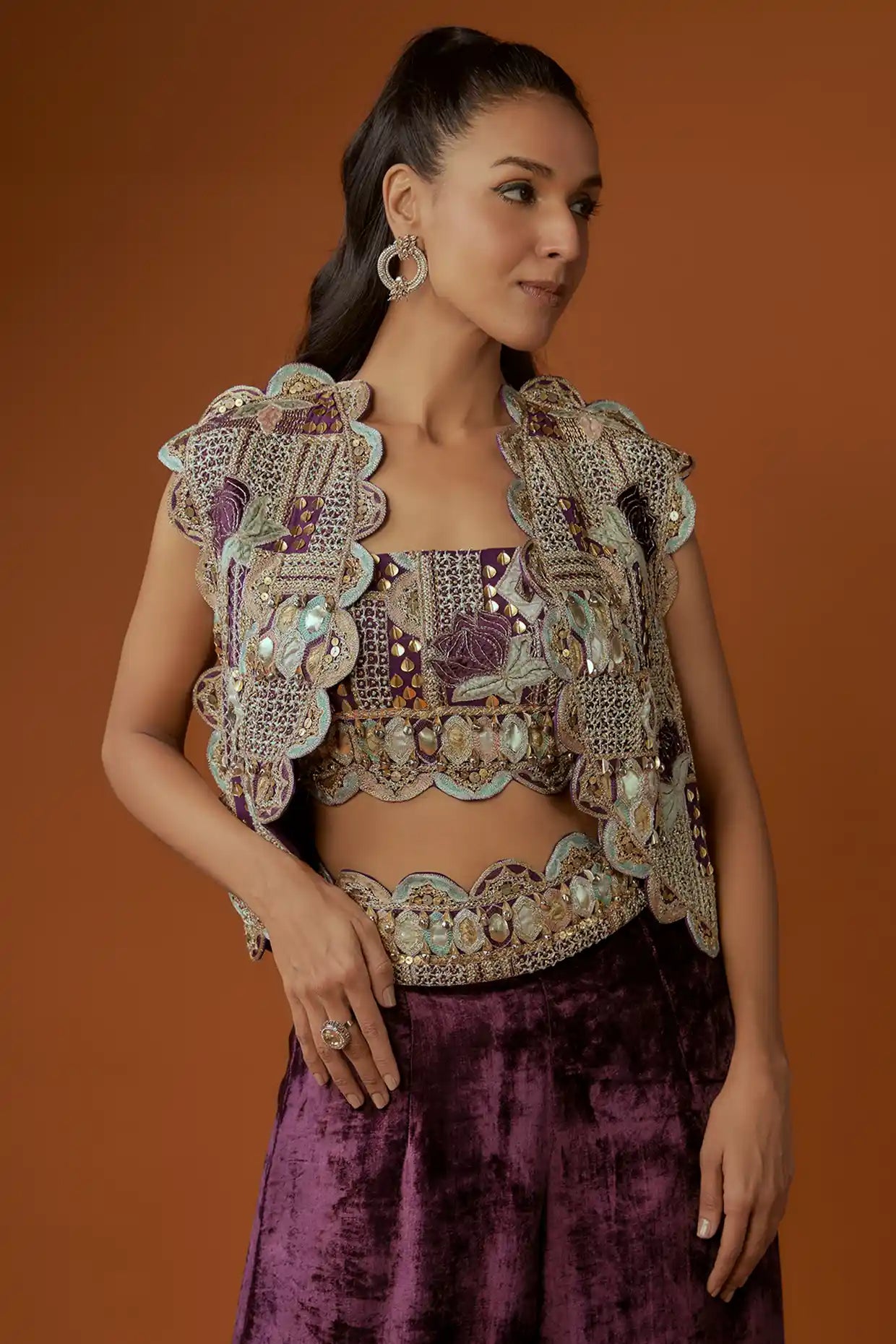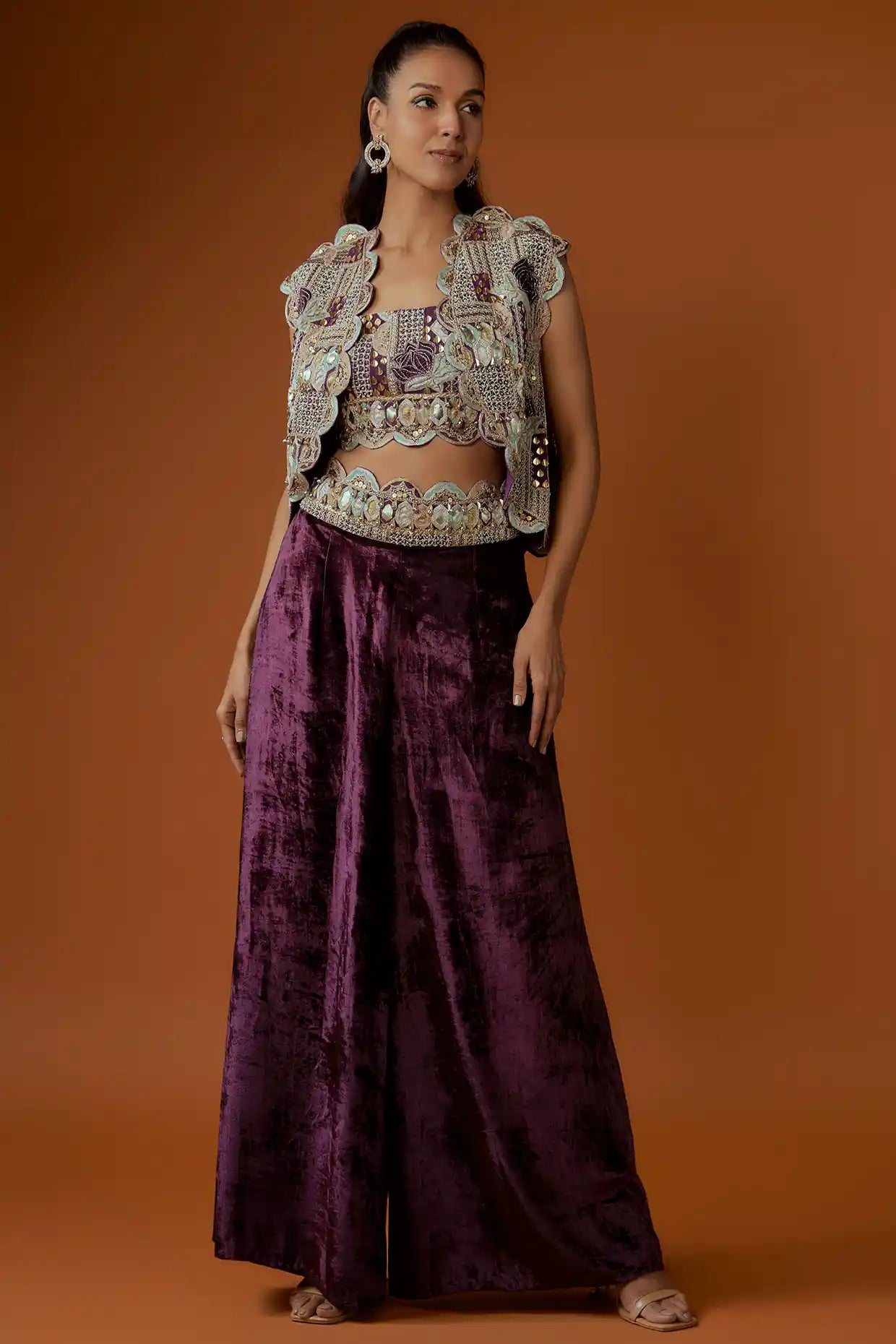 Make a statement with this stunning purple georgette embroidered scallop jacket, featuring a beautifully crafted front embroidered bustier paired with luxurious velvet palazzo pants. The intricate embroidery on the jacket adds a touch of elegance, while the scalloped edges enhance the overall silhouette. The plush velvet palazzo offers both comfort and sophistication, making this ensemble perfect for festive occasions or glamorous events. With its blend of rich textures and vibrant color, this outfit ensures you shine with confidence and style.