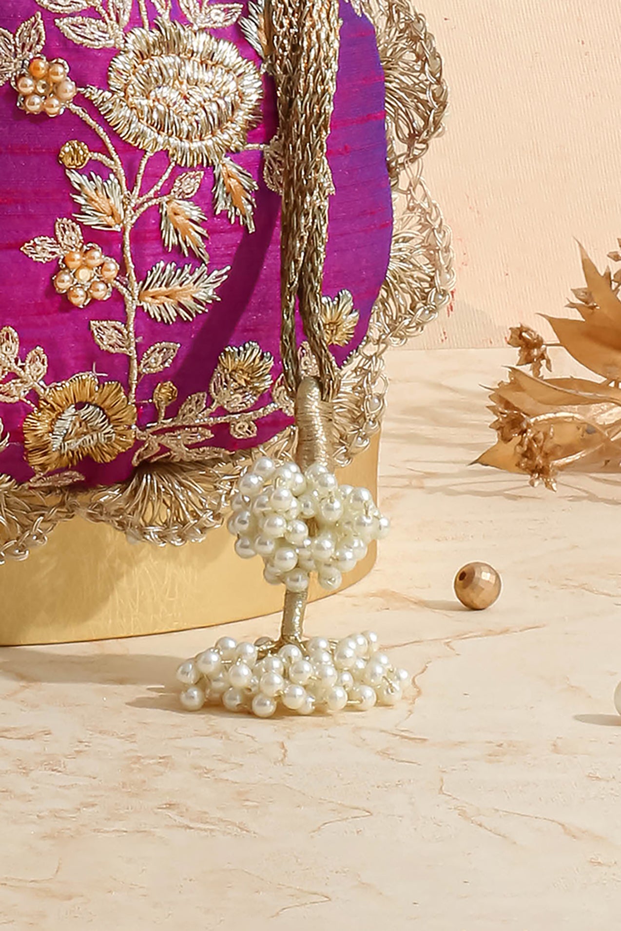 Fabric: Embroidered poly silk, poly satin lining, woven golden thread drawstrings and handle,ÿscallop lace and pearl tassels