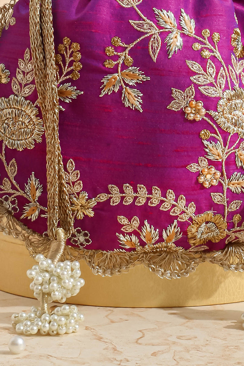 The Purple Embroidered Scallop Potli Bag is a stunning blend of regal charm and detailed craftsmanship. Adorned with intricate embroidery and elegant scalloped edges, this rich purple potli adds a touch of sophistication to any festive or bridal ensemble. Featuring a traditional drawstring closure and ample space, it's both functional and fashion-forward. Perfect for weddings, sangeets, or special occasions, it's an ideal accessory for those who appreciate timeless elegance with artistic flair.