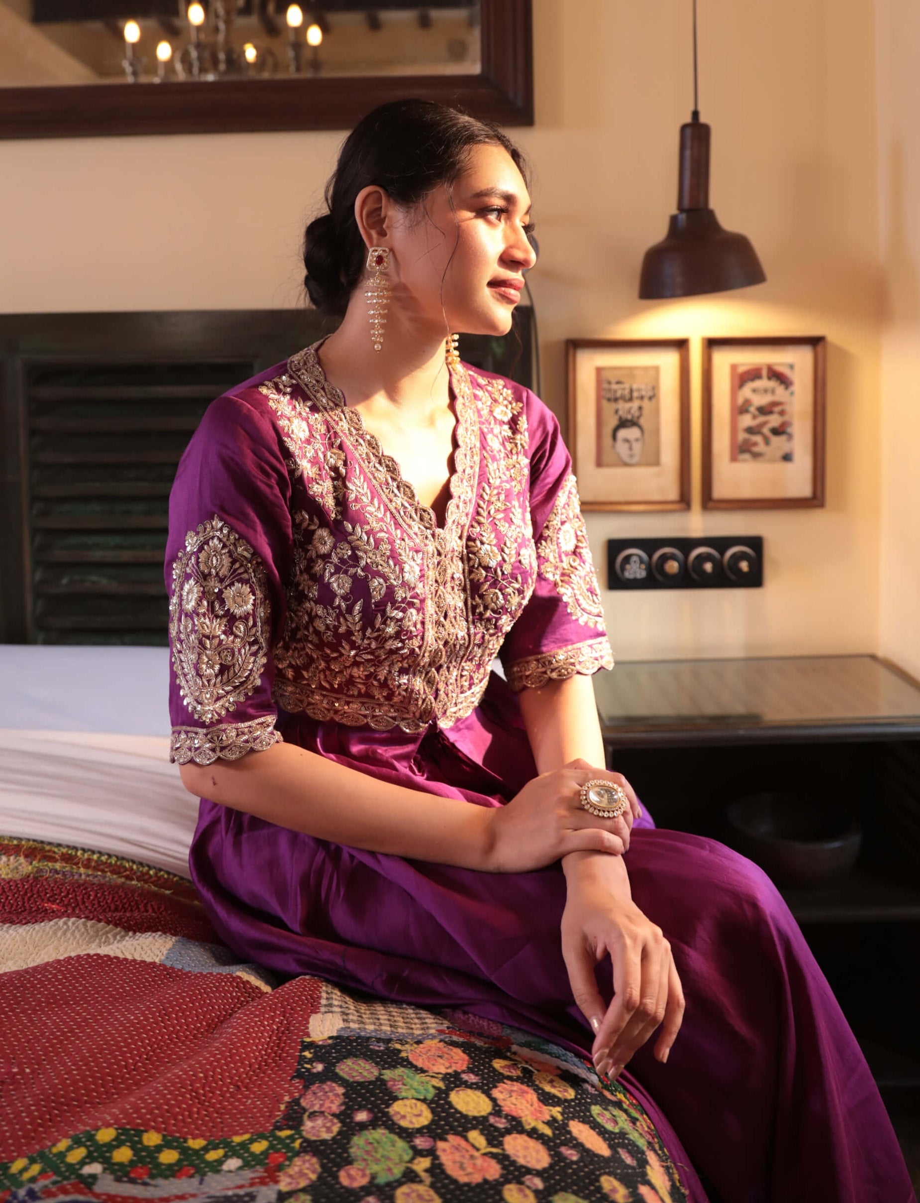 The gown’s purple organza fabric offers a light, airy feel with a rich, vibrant hue, while the asymmetrical design provides a modern and dynamic silhouette. The pure maal work, renowned for its exquisite and delicate embroidery, enhances the gown’s luxurious appeal and adds a layer of intricate beauty.