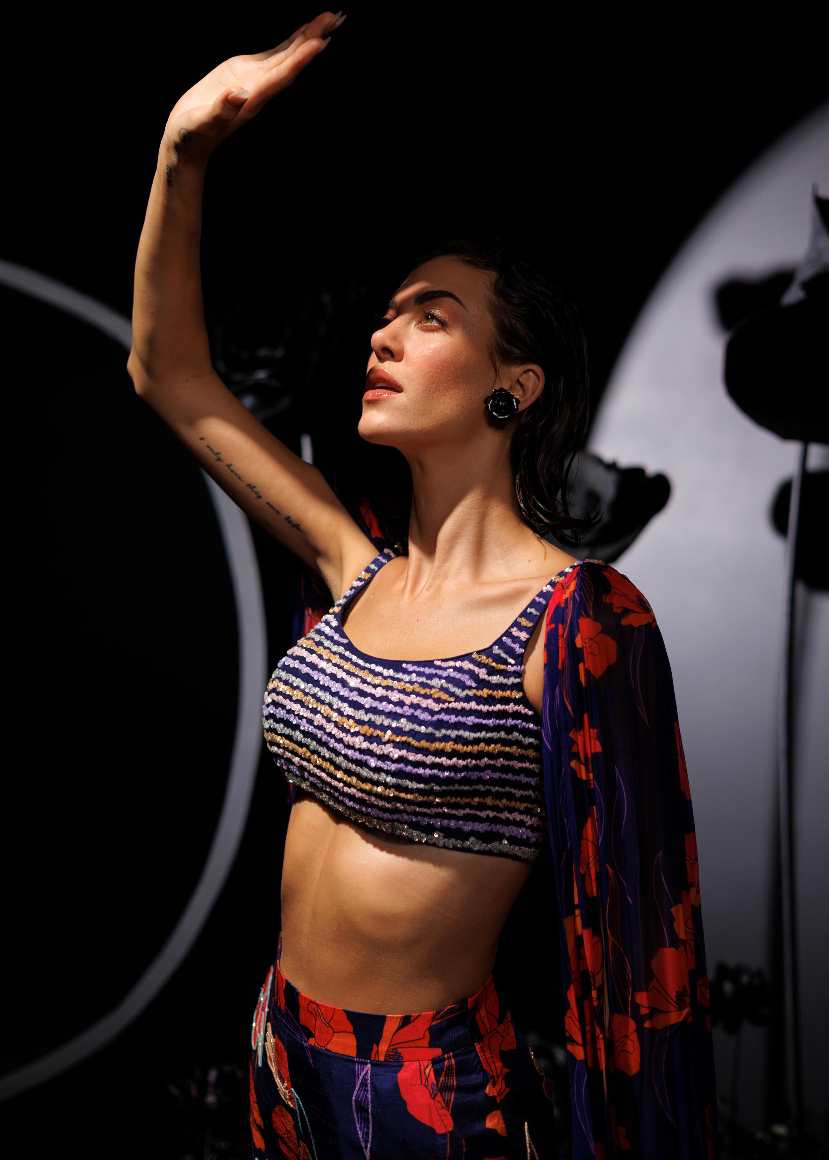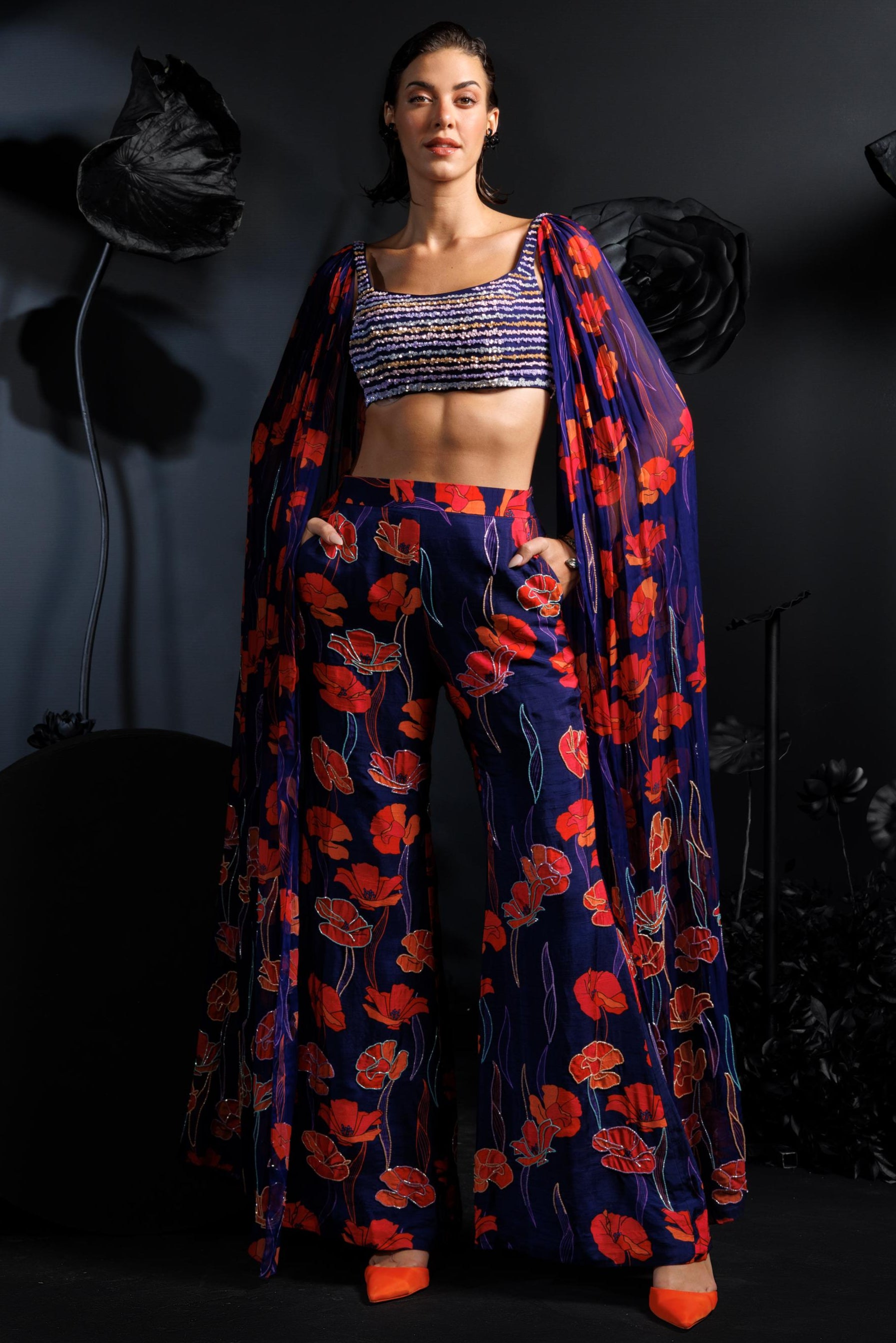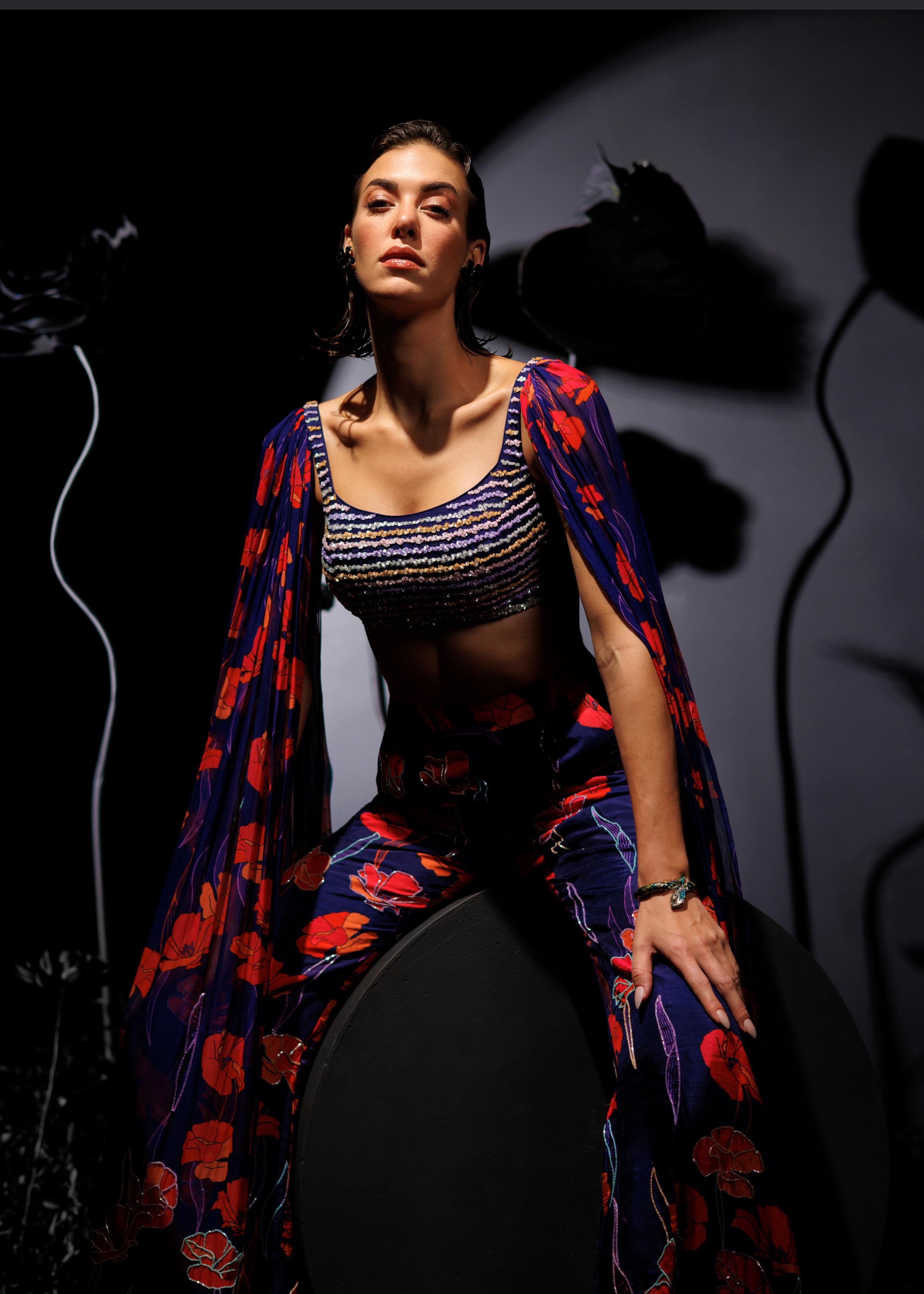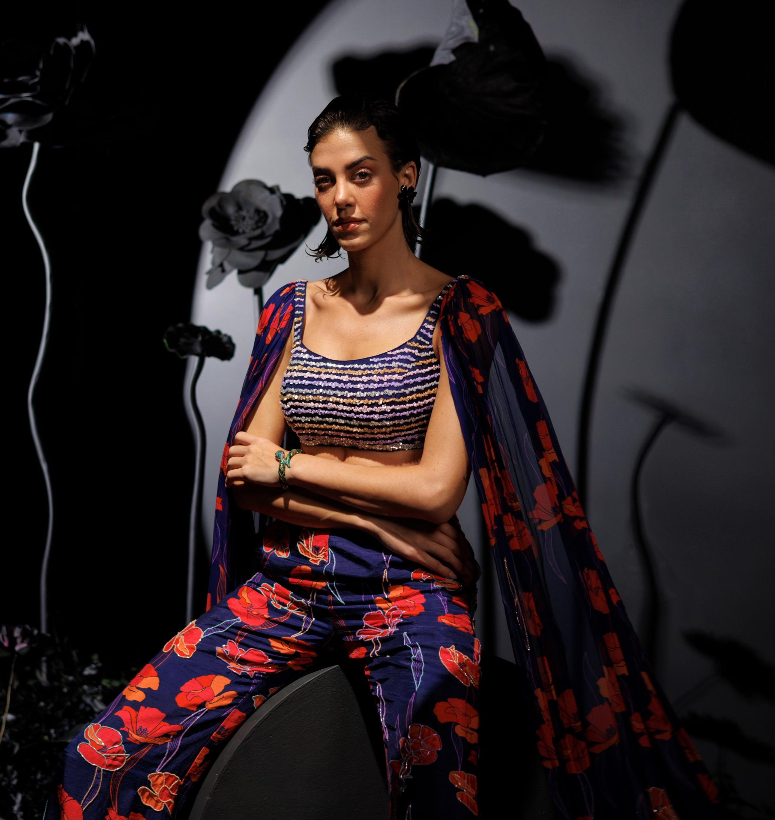 The Firstbloom-with Pants ensemble from Nautanky is an avant-garde statement piece designed for modern high-fashion events. This sleeveless floral print blouse features intricate hand-embroidery, sequins, and beads, paired with flared pants for a chic, bold look. The deep purple and red color combination adds to its striking appeal, making it perfect for a Sangeet, cocktail party, or reception. Crafted from soft silk and organza, this outfit ensures both sophistication and comfort, redefining elegance for special occasions.