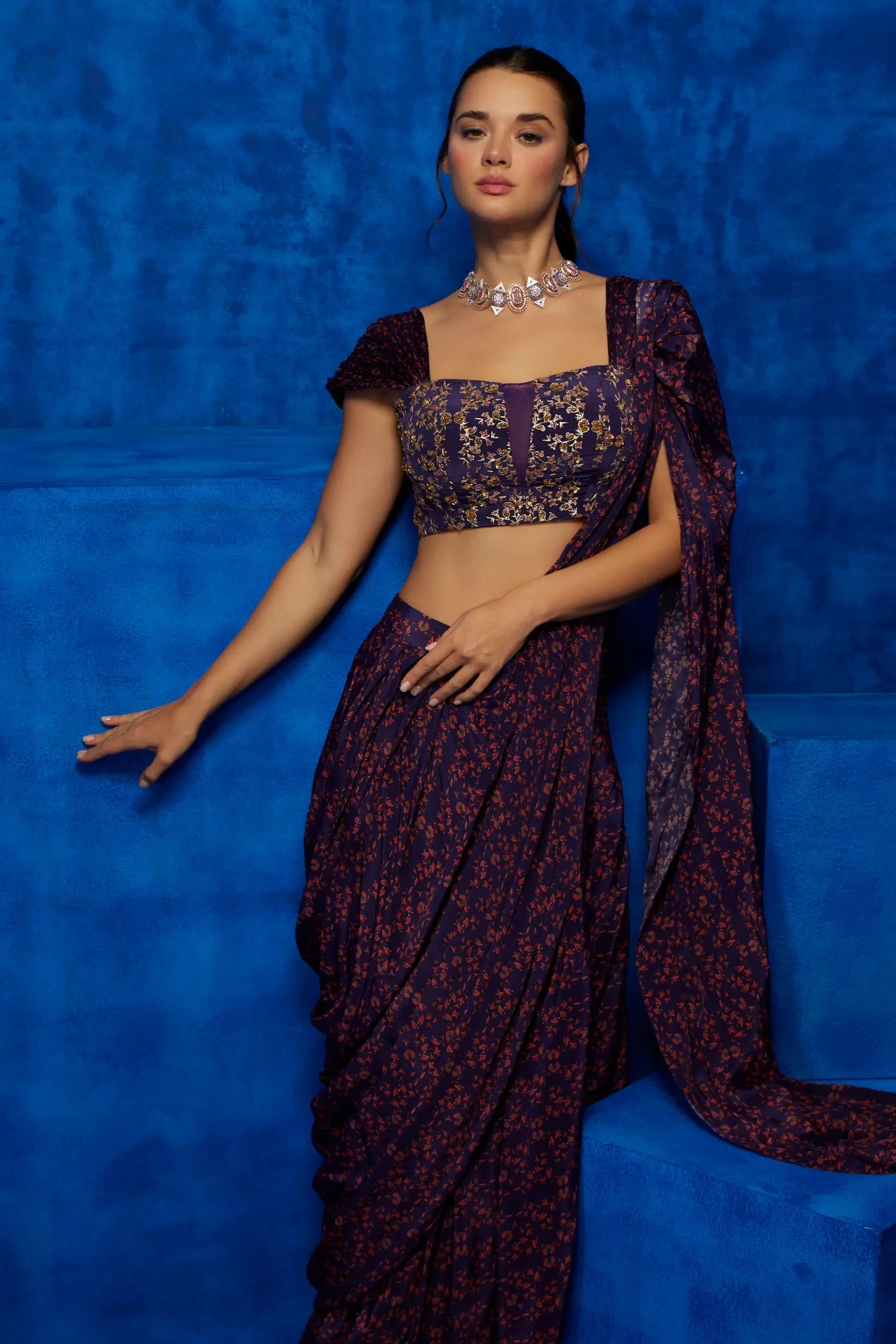 Grace any occasion with this purple floral printed drape saree. The rich purple hue, combined with delicate floral prints, offers a fresh and modern twist on a traditional classic. The draped design ensures effortless elegance, making it perfect for weddings, festive celebrations, or evening events. With its sophisticated charm and contemporary flair, this saree is sure to turn heads and leave a lasting impression.