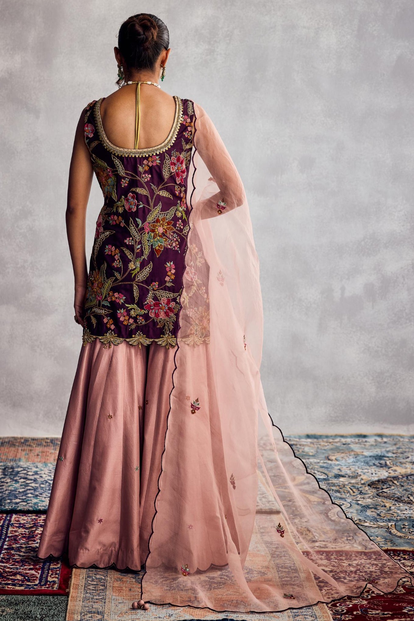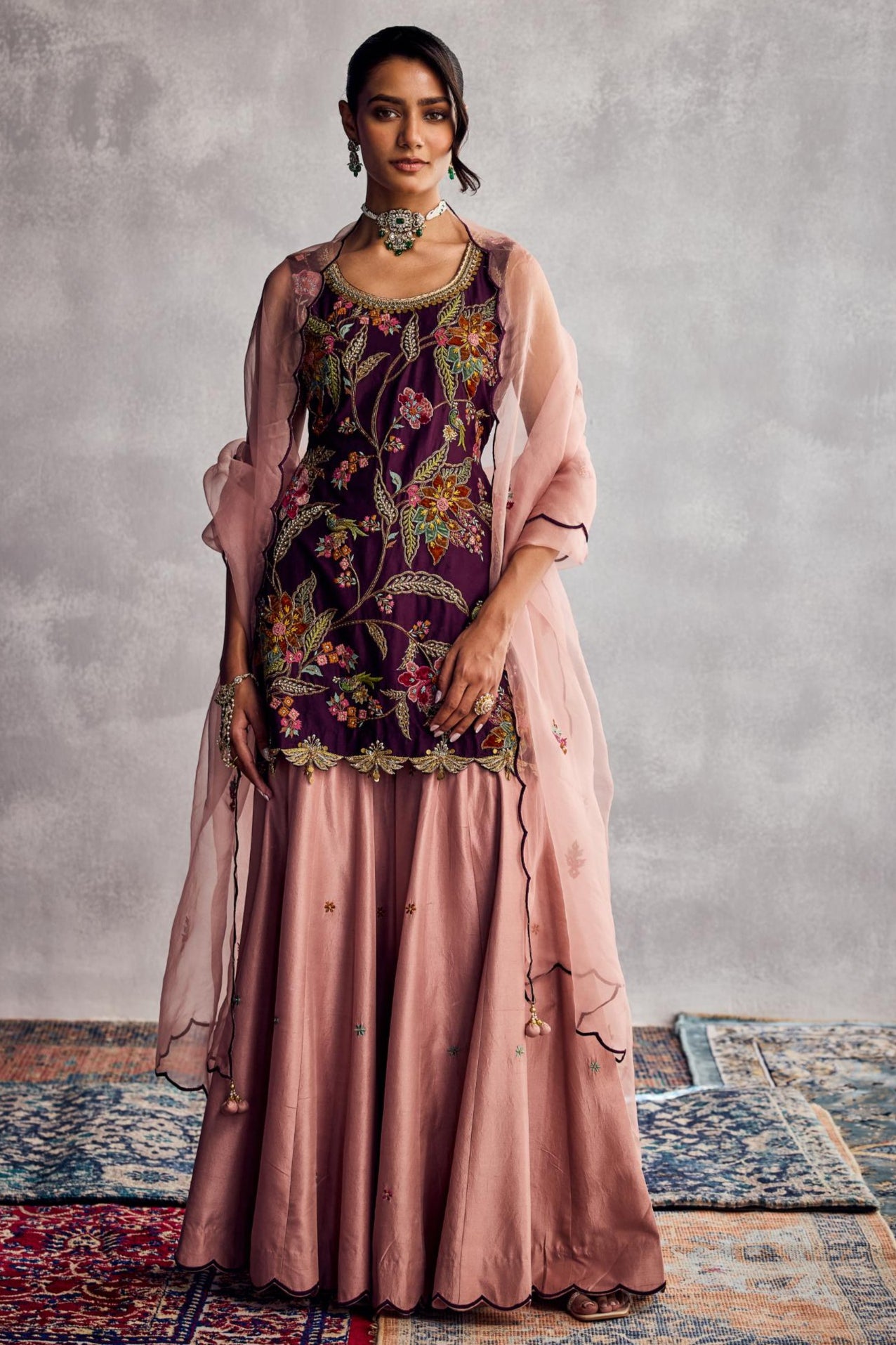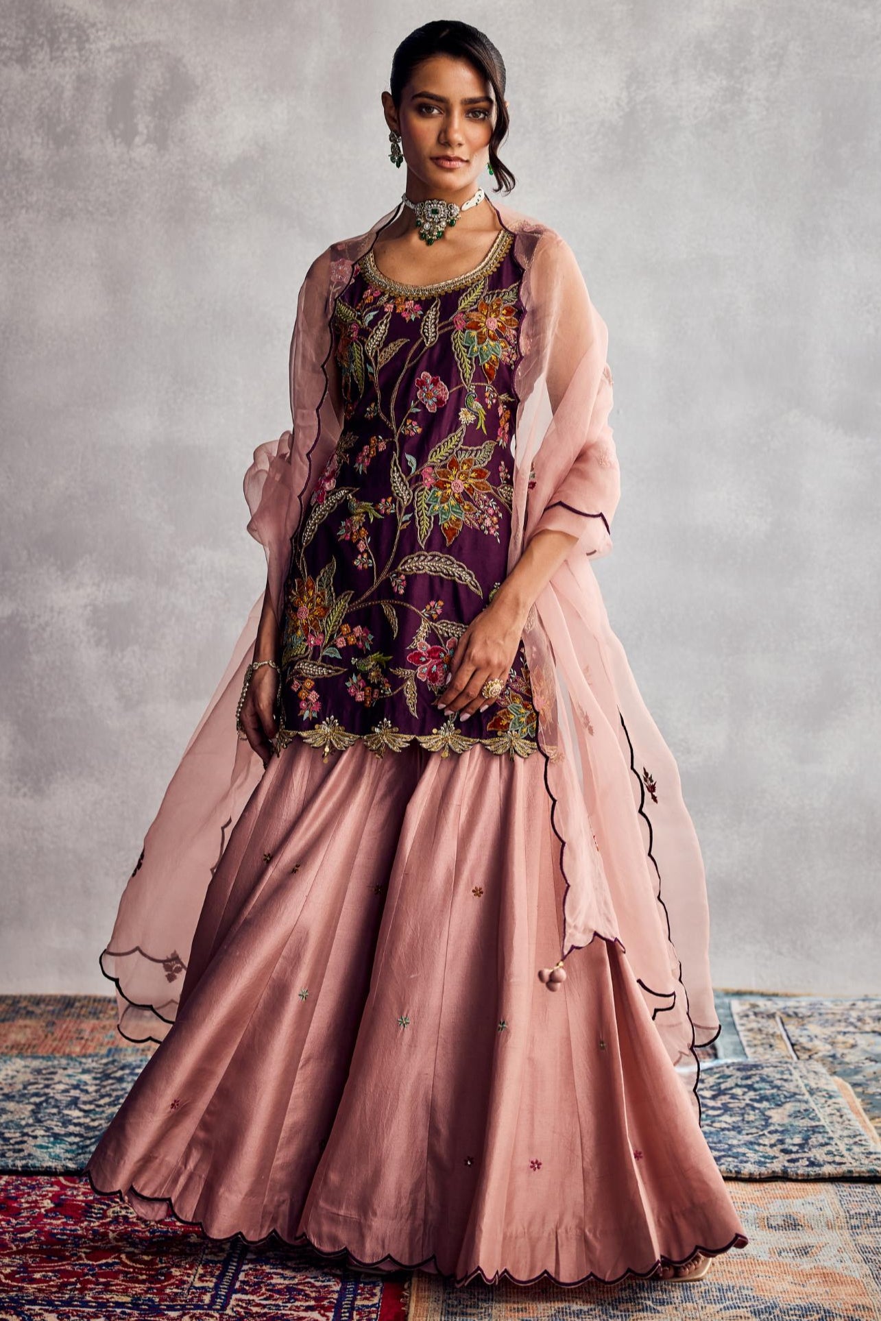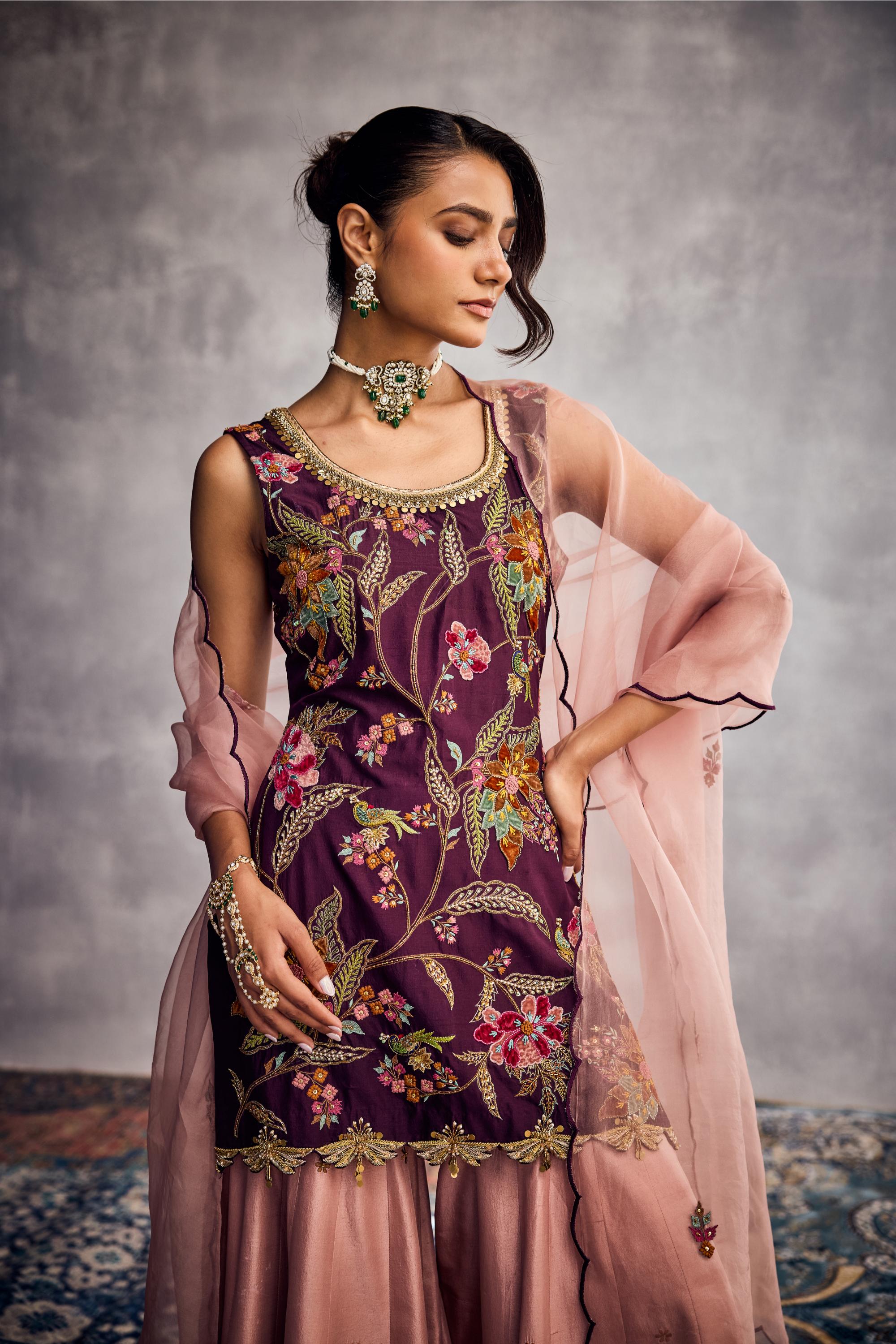Regal with a touch of whimsy, the Purple Forever Vows Sharara Set is designed for the modern romantic who isn’t afraid to stand out. In a rich, enchanting shade of purple, this set exudes royalty while embracing playful movement and grace. The flared sharara pants offer a dramatic silhouette, balanced beautifully by intricate detailing and a contemporary cut. Ideal for sangeet nights, festive soirées, or intimate ceremonies, this ensemble blends tradition and trend in perfect harmony. A bold expression of love, style, and individuality.