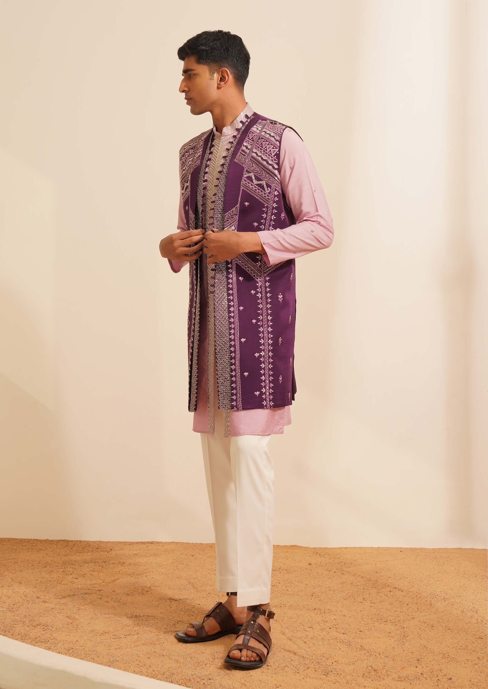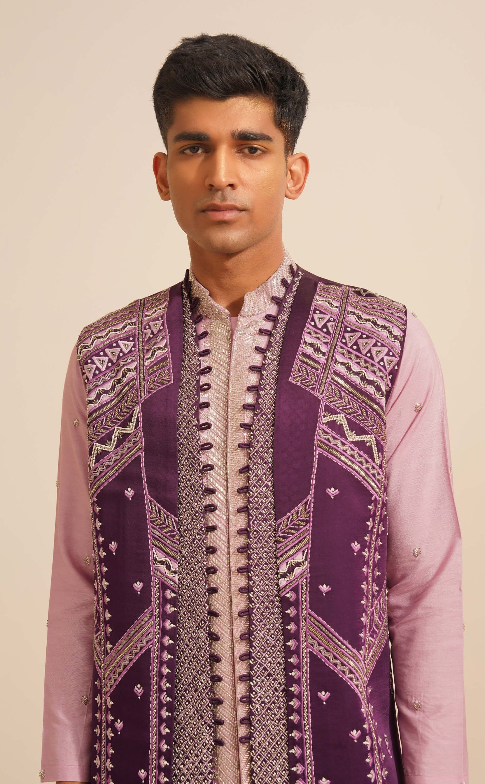 Introducing our exquisite purple open Indo-jacket, designed to captivate with its extended placket featuring sophisticated loop details and intricate hand embroidery throughout. This luxurious piece combines traditional craftsmanship with modern elegance, offering a rich and vibrant addition to your wardrobe. Ideal for making a statement at any special event, this Indo-jacket blends meticulous detailing with timeless style, ensuring you stand out with grace and sophistication. Perfect for those who appreciate refined artistry and contemporary flair.