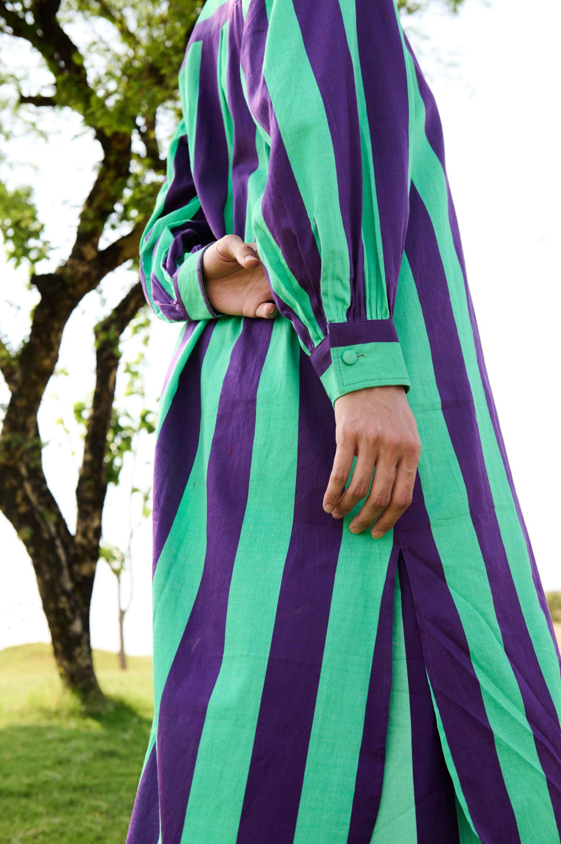Discover the Iris Coord Set, a perfect blend of style and comfort crafted from our premium linen-cotton fabric. This set features a button-down long tunic in a striking purple and green stripe print, paired with relaxed pajama pants for ultimate ease and sophistication. Ideal for lounging at home or casual outings, the Iris Coord Set combines a vibrant, eye-catching design with the soft, breathable qualities of high-quality linen-cotton, offering both elegance and comfort.