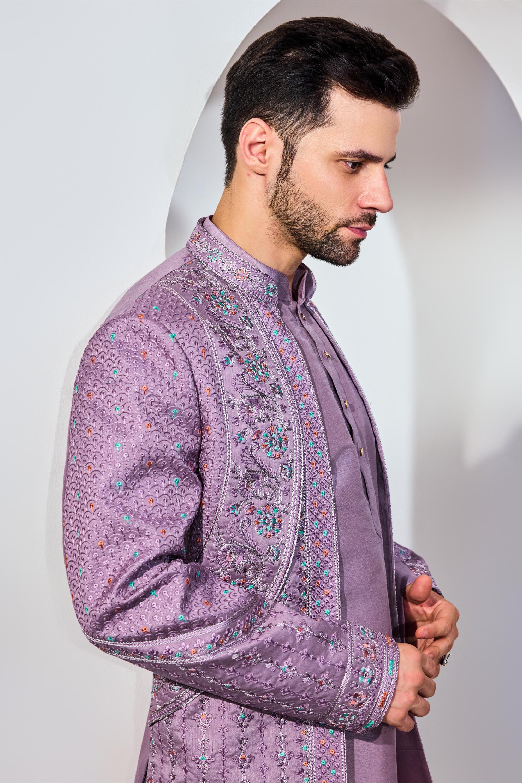 Striking and regal, the Purple Indo with Kurta and Pant set brings a bold hue and structured elegance to festive dressing. The deep purple Indo-western jacket is tailored for a sharp silhouette and layered over a coordinated kurta and pants, creating a look that balances heritage with modern finesse. Ideal for weddings, receptions, or cultural celebrations, this ensemble is designed for the contemporary man who isn’t afraid to stand out with refined confidence and timeless style.
