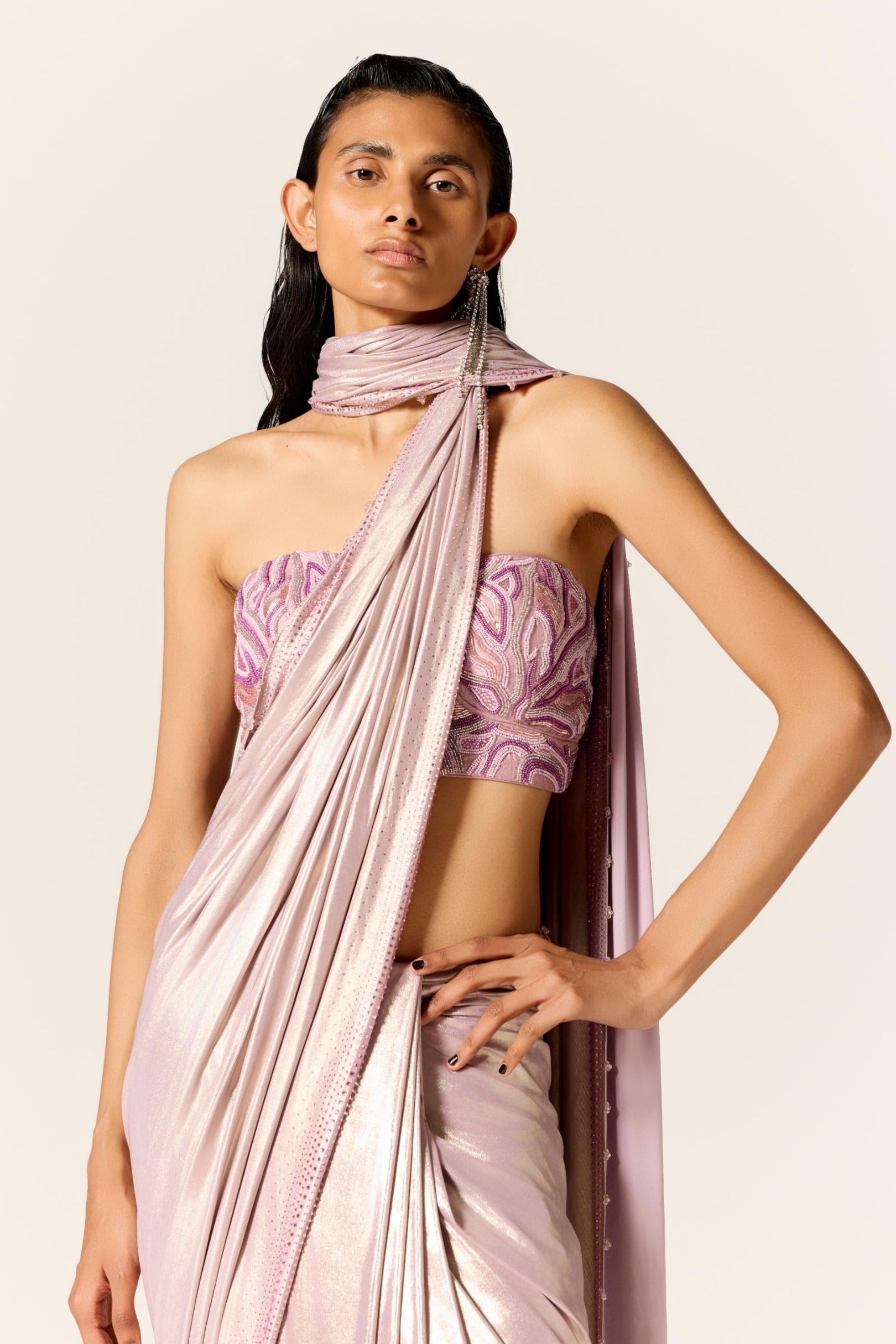 The Purple Izar Eminence Saree is a regal and refined ensemble that exudes timeless elegance. Draped in a rich purple hue, it features subtle detailing and fluid fabric that flows with grace. The saree strikes a perfect balance between tradition and modernity, ideal for evening events or festive occasions. Its sophisticated tone and elegant drape make it a captivating choice. A true statement of understated luxury.