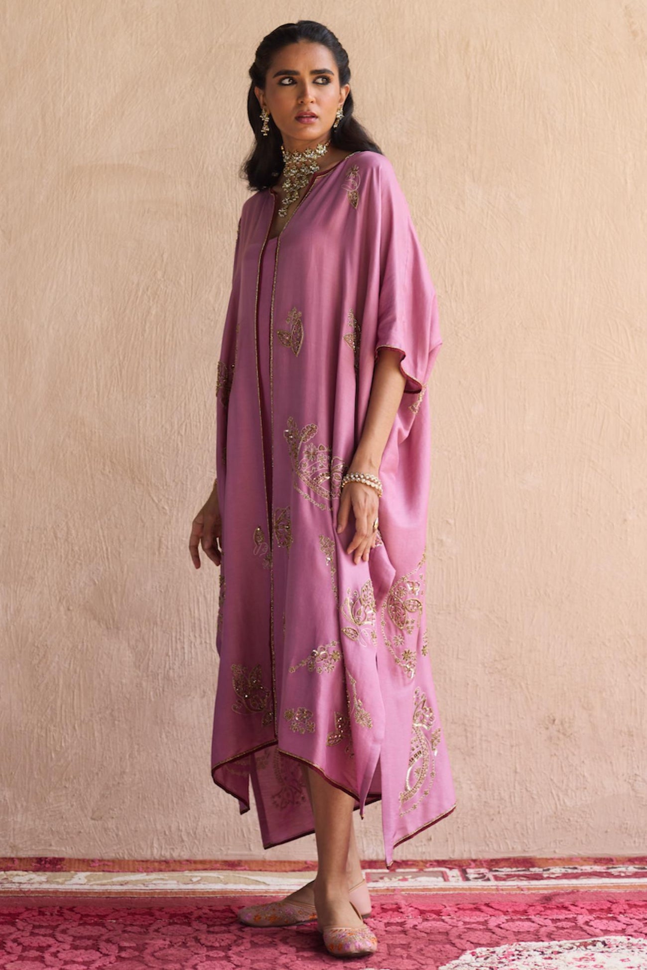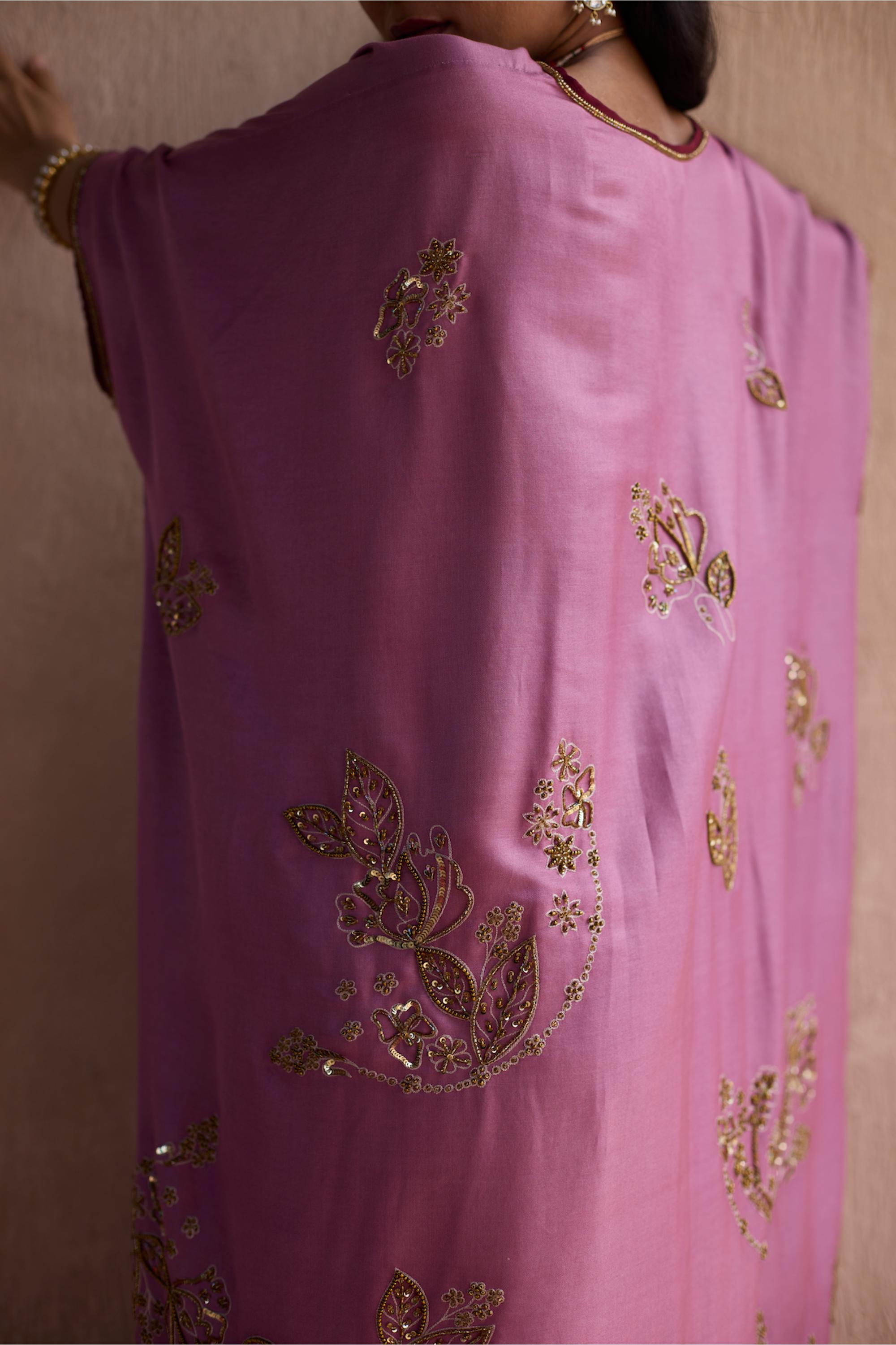The Purple Kaftan Jacket Set exudes laid-back elegance with a regal twist. Its fluid silhouette drapes effortlessly, while the rich purple hue lends a bold, expressive character. The jacket adds structure and dimension, making it perfect for both intimate gatherings and festive affairs. Style it with statement earrings and soft waves for a modern boho-chic look. It's comfort, confidence, and couture, all in one ensemble.