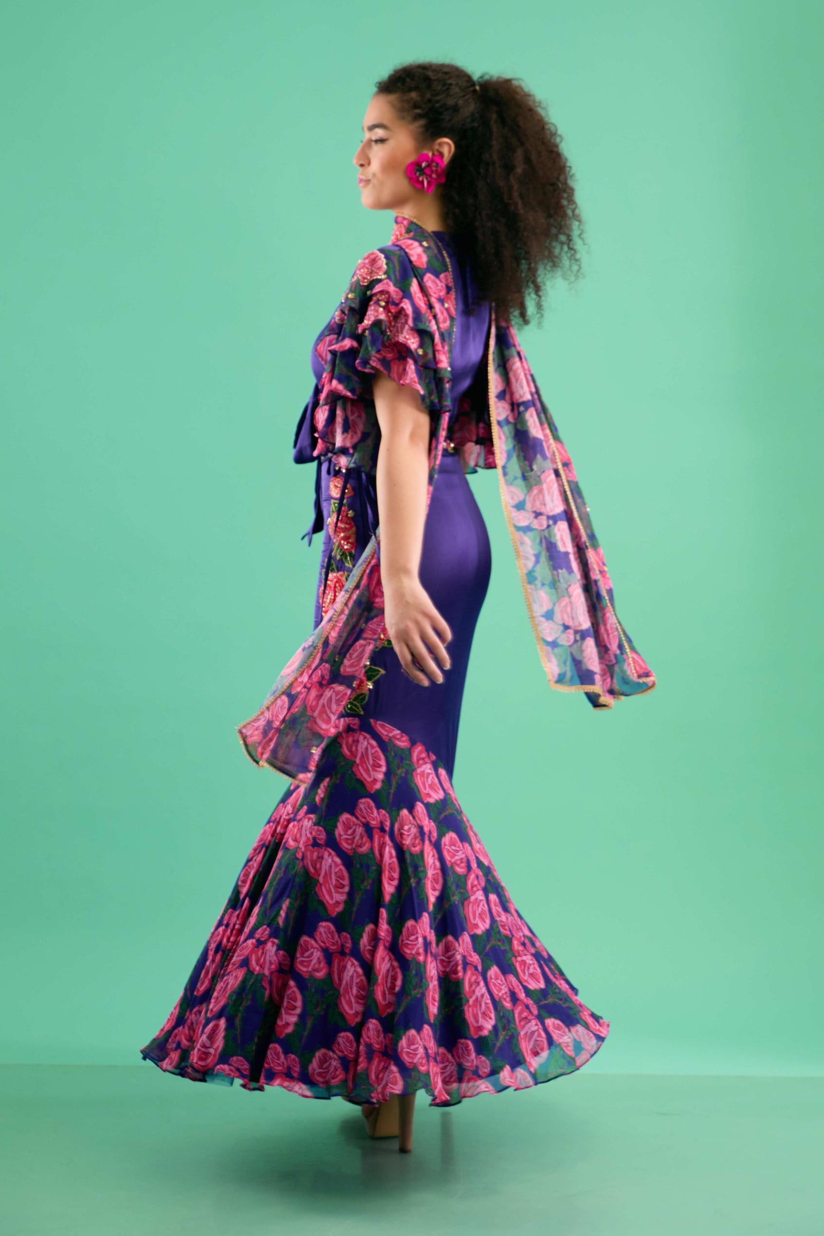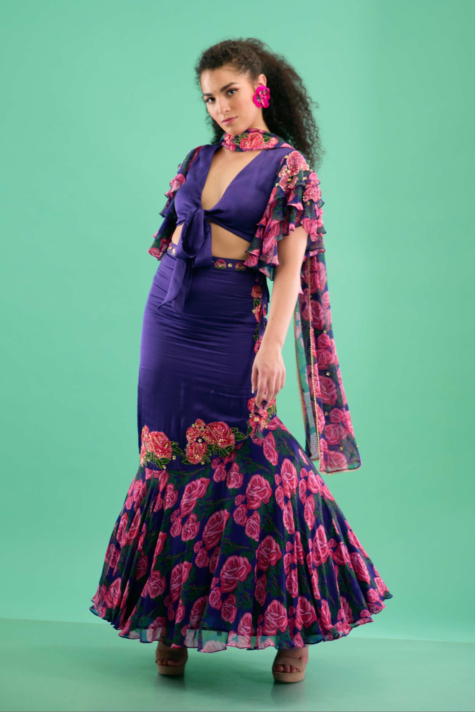 Purple lehenga with twist of frills & blouse with flared sleeves