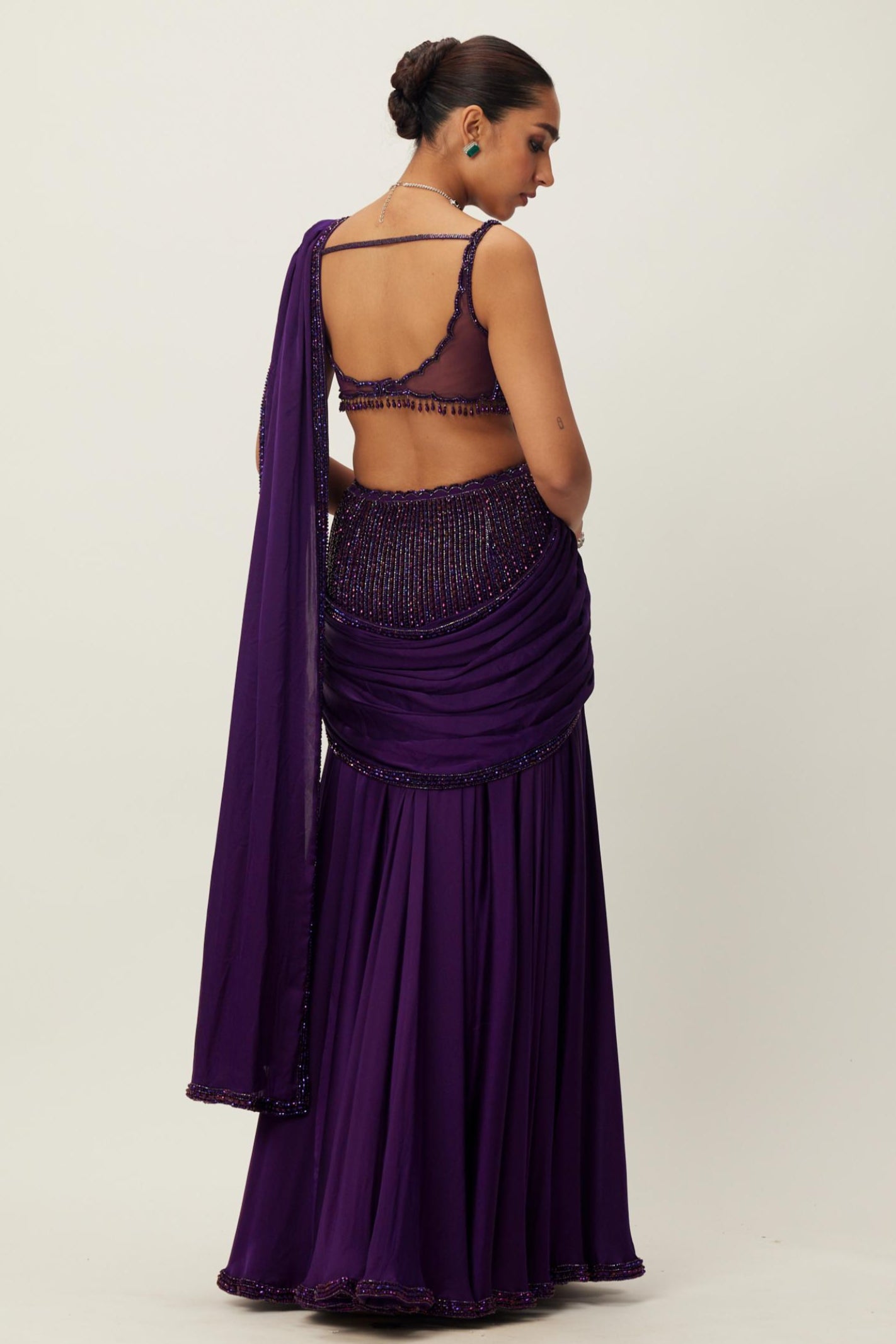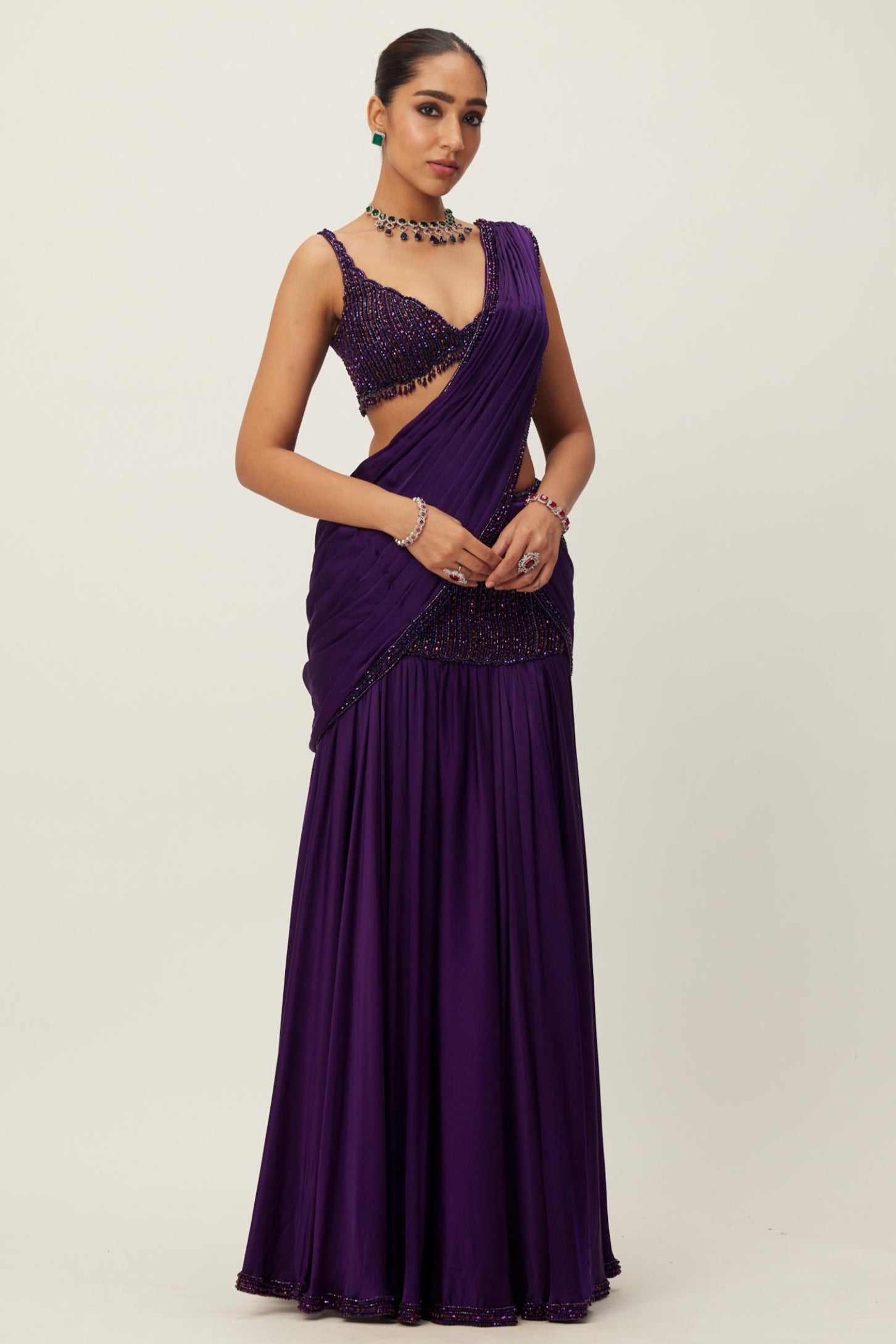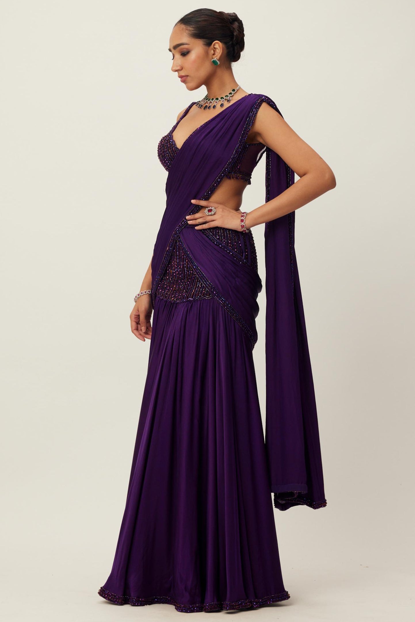 Effortlessly glamorous the Purple Maya Pre-Draped Crystal Beaded Saree Set redefines elegance with modern ease. Crafted in a rich purple hue this pre-draped saree features intricate crystal beadwork that catches the light with every move. The fluid drape is perfectly balanced by a structured blouse offering a ready-to-wear silhouette that’s perfect for receptions cocktail nights or destination celebrations. Designed for the woman who loves timeless tradition with a contemporary twist this ensemble brings sparkle without the fuss.
