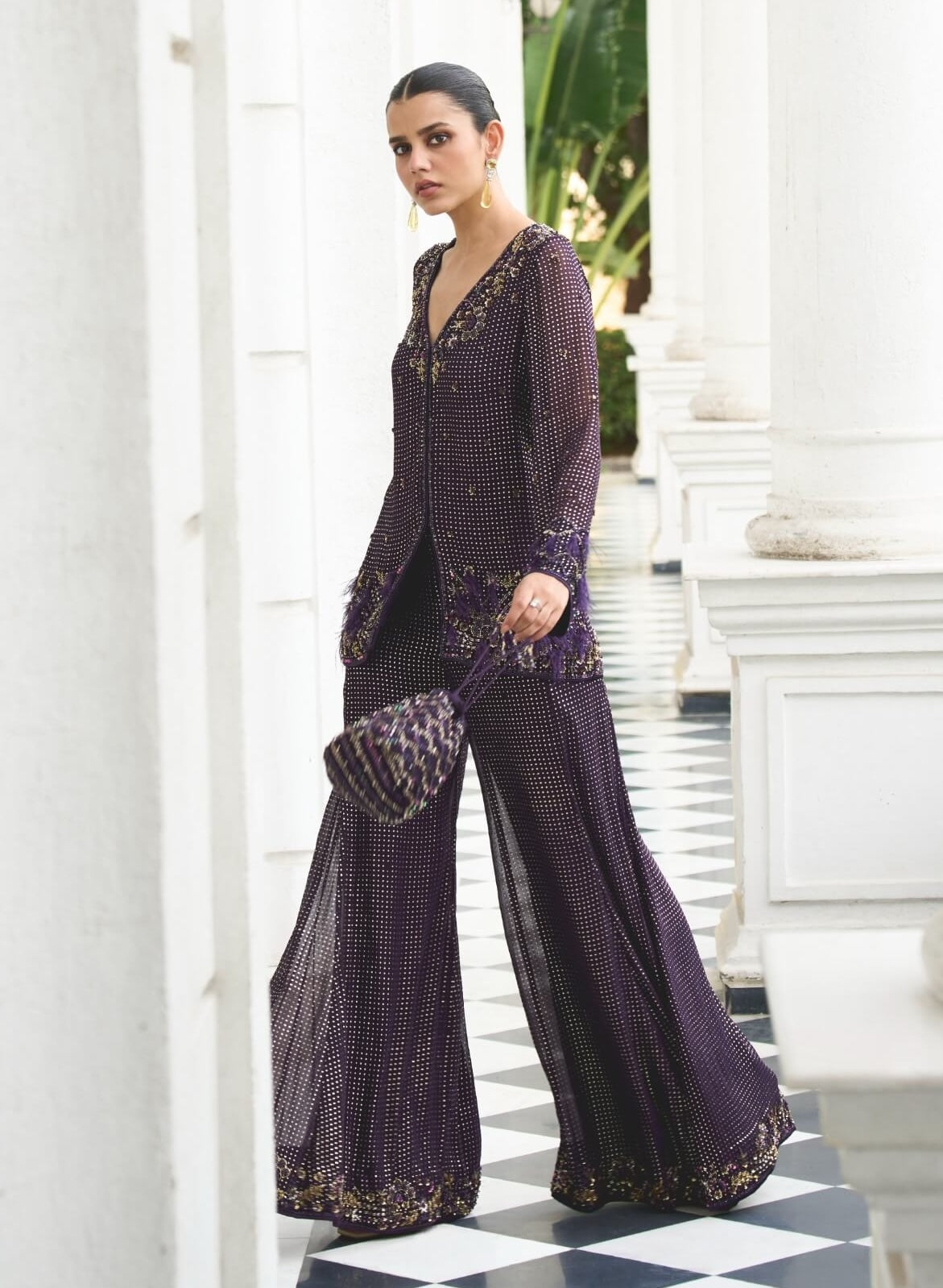 Elevate your style with our purple mukaish georgette co-ord set, a perfect blend of modern elegance and intricate craftsmanship. This stunning ensemble features delicate hand embroidery at the neck, hemline, and sleeves, creating a sophisticated look that exudes charm. The addition of feathers adds a playful yet chic touch, making this outfit ideal for special occasions.