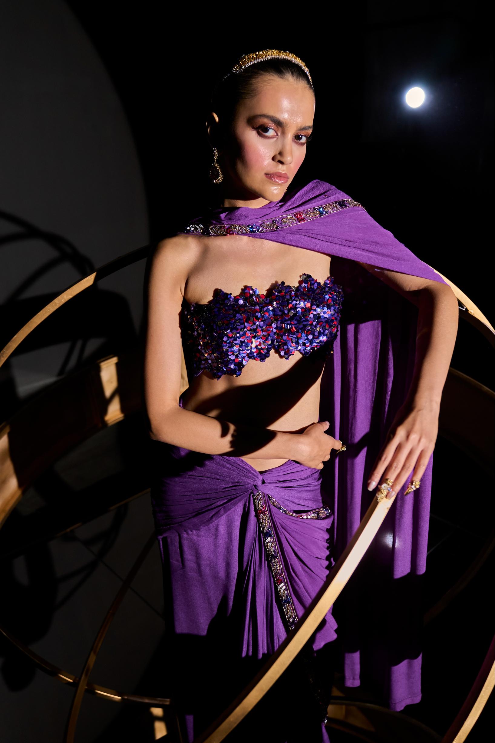 The Purple Multicolored Artemis Pre-Stitched Sari redefines traditional elegance with a modern twist. Featuring a rich purple base adorned with multicolored accents, this pre-stitched sari is a breathtaking fusion of vibrant hues and timeless sophistication. The intricate design and fluid drape create an effortlessly chic look, making it the perfect choice for weddings, festive celebrations, or elegant soirees.