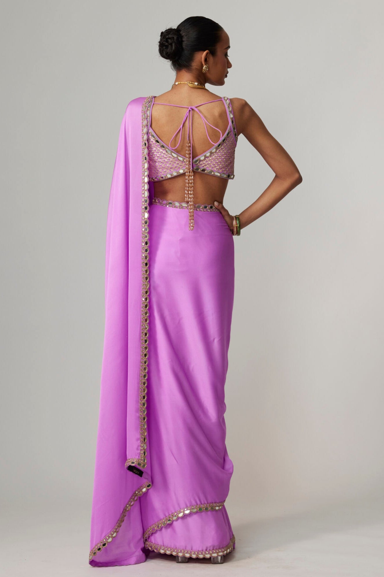 Elegant and expressive the Purple Noorani Saree Set is a timeless ode to tradition with a modern flair. Crafted in a luxurious purple tone the saree is adorned with delicate embroidery and subtle multicolor detailing that adds richness and depth to the drape. Paired with a structured blouse this ensemble is perfect for weddings evening celebrations or festive occasions. Designed for the woman who carries heritage with sophistication this look blends classic artistry with contemporary styling.