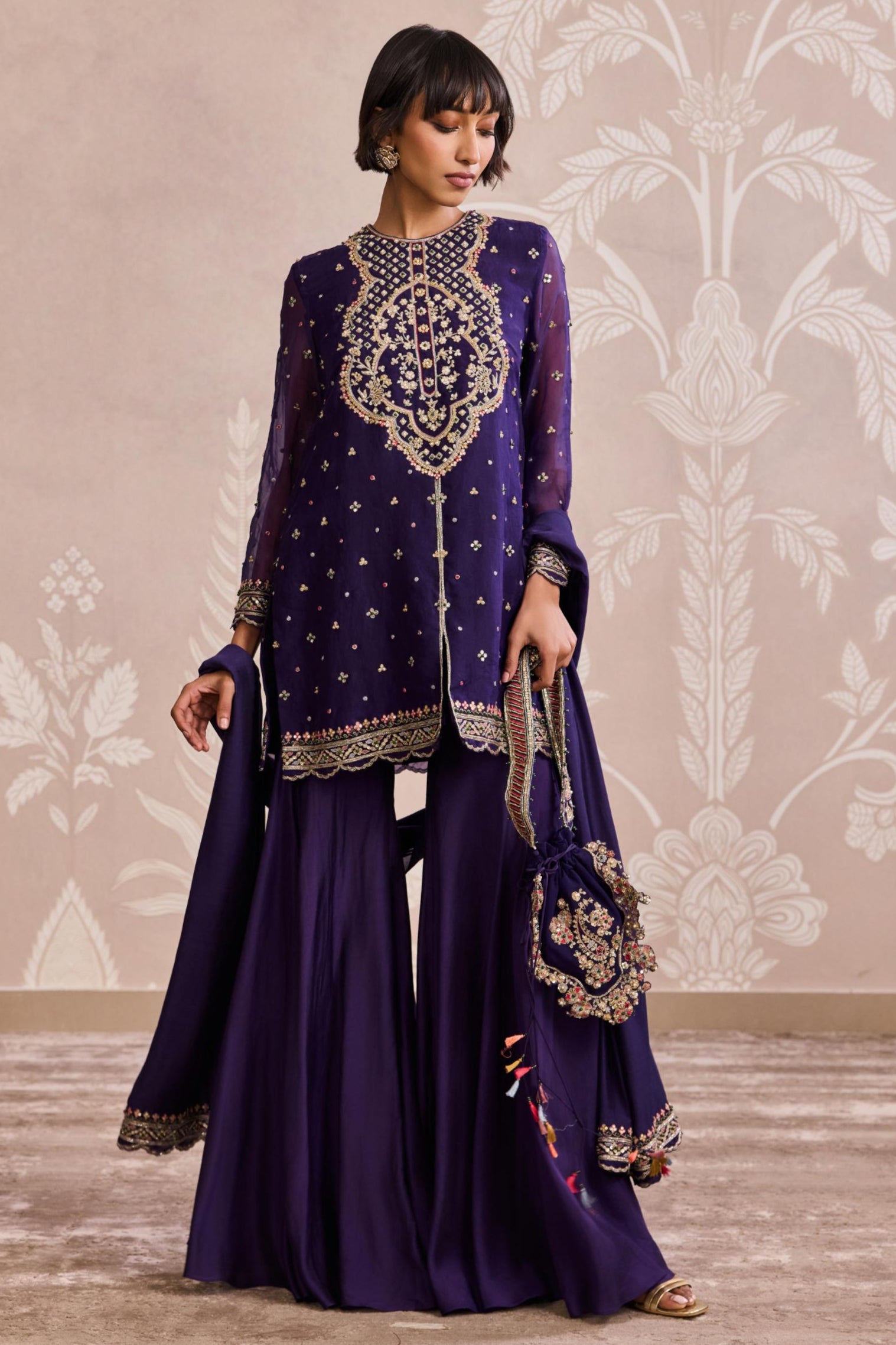 Drenched in royal hues, the Purple Nooreh Ever After Dupatta Gharara Set is a celebration of tradition with a touch of glamour. The rich fabric shimmers subtly while the gharara's flared silhouette evokes a sense of old-world charm. Paired with a finely detailed kurta and a diaphanous dupatta, the ensemble strikes the perfect balance between grandeur and grace. Ideal for festive gatherings or intimate weddings, it's a timeless pick for the modern muse.