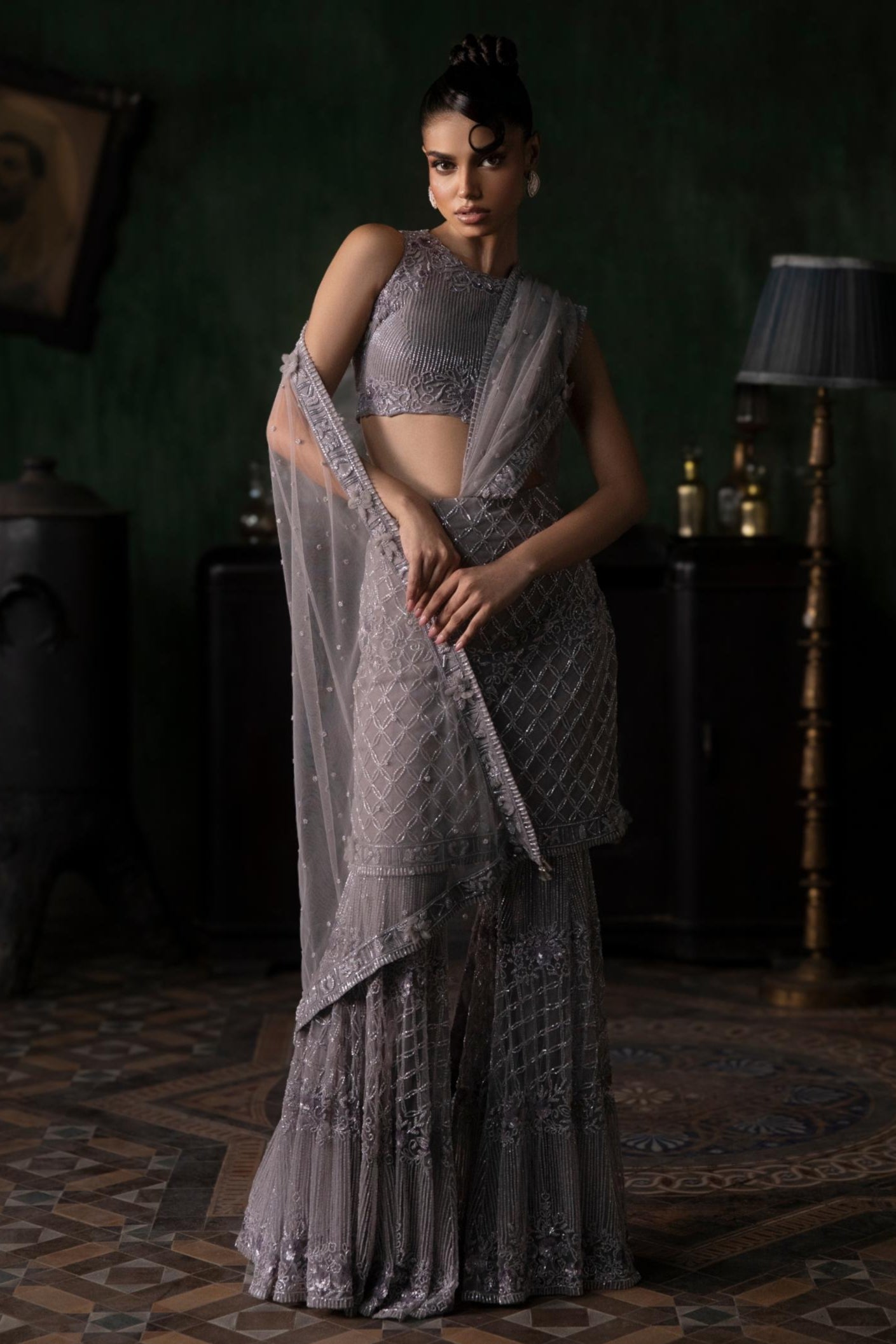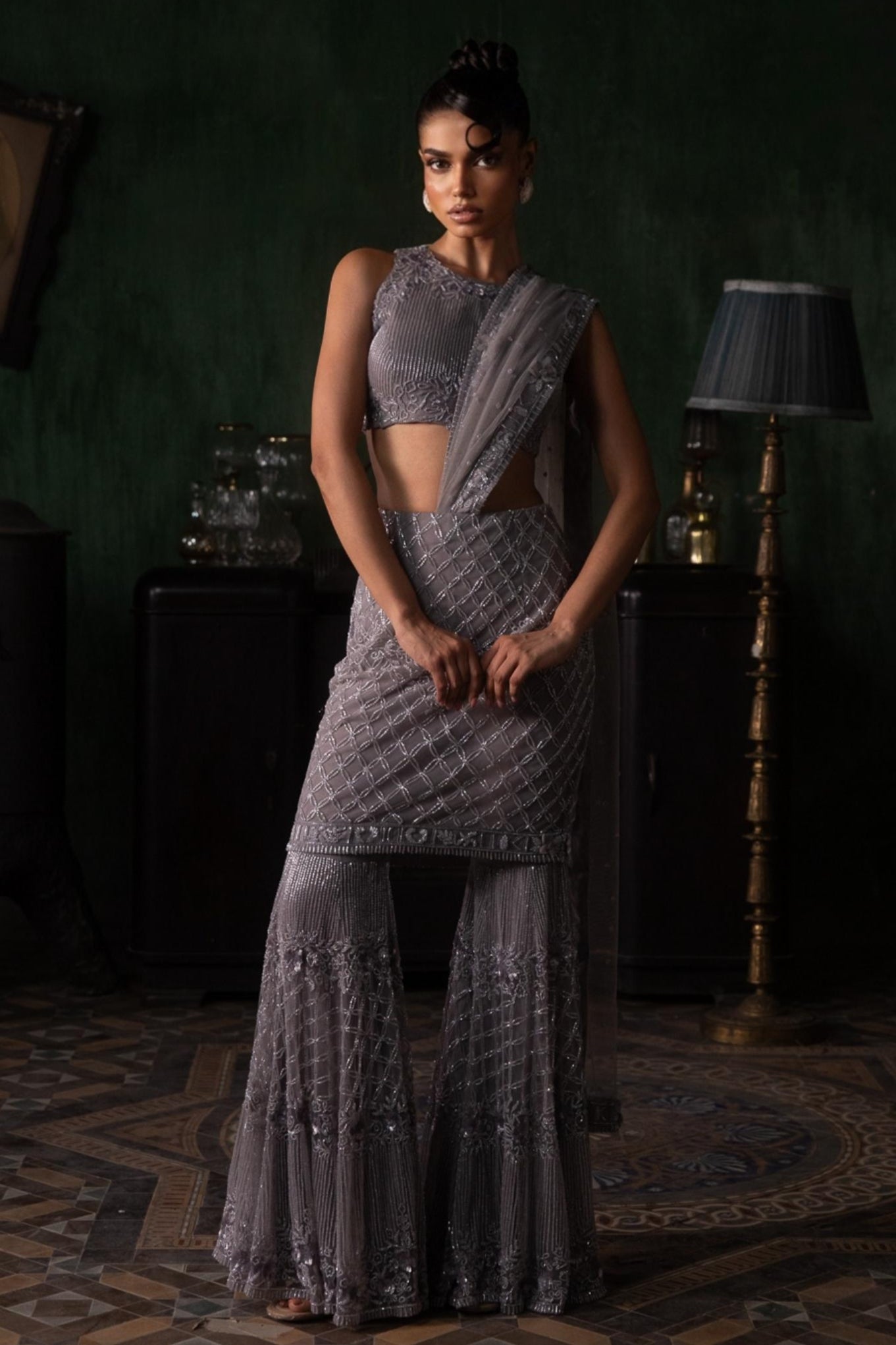 The Purple Oraan Skirt Sharara Sari Set channels regal femininity with a fusion twist. Featuring a pre-draped sari silhouette over flared sharara pants, it offers fluid movement with an architectural edge. The rich purple tone is elevated with tonal embroidery and subtle shimmer, creating a perfect balance of tradition and innovation. Ideal for sangeet nights or contemporary weddings, it’s elegance reimagined for the modern muse. A showstopper for every festive edit.