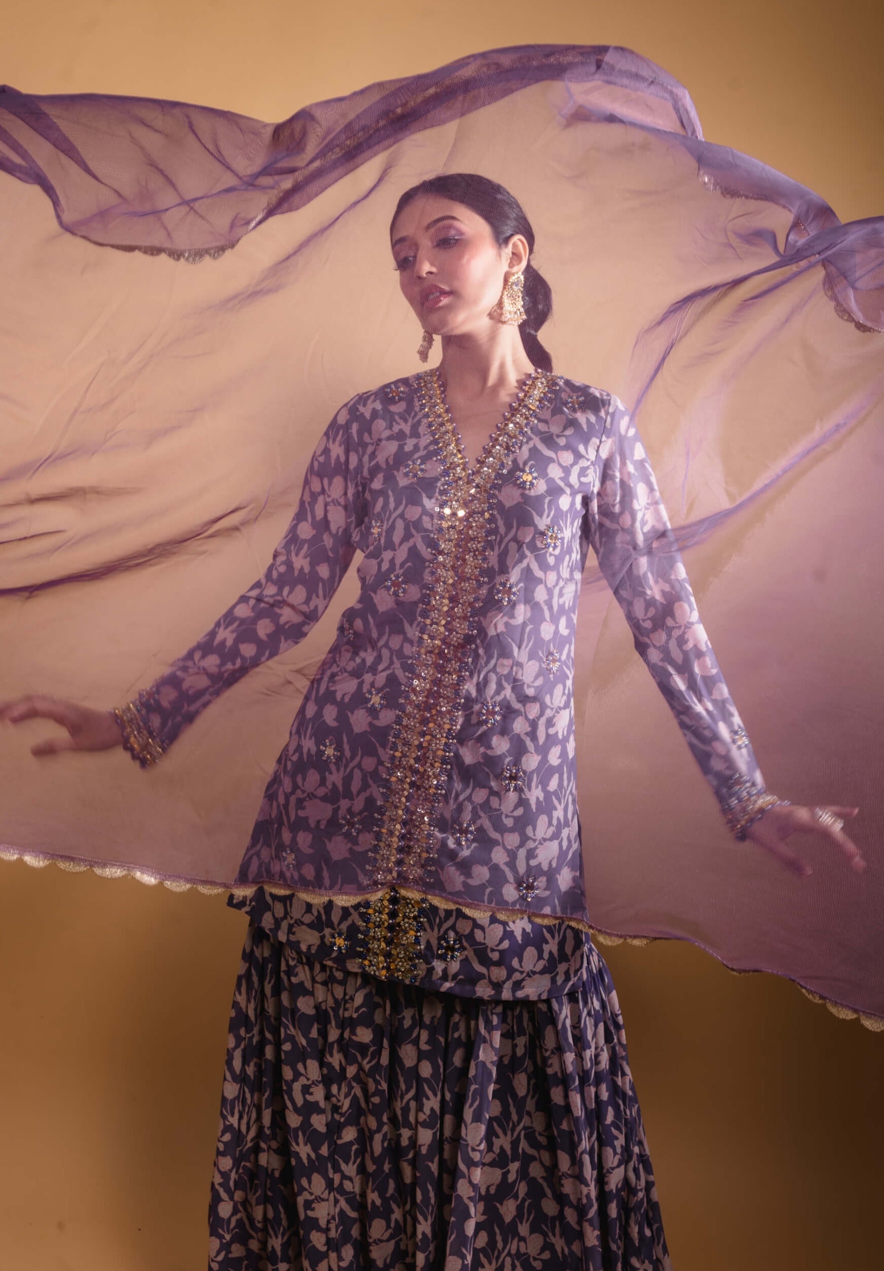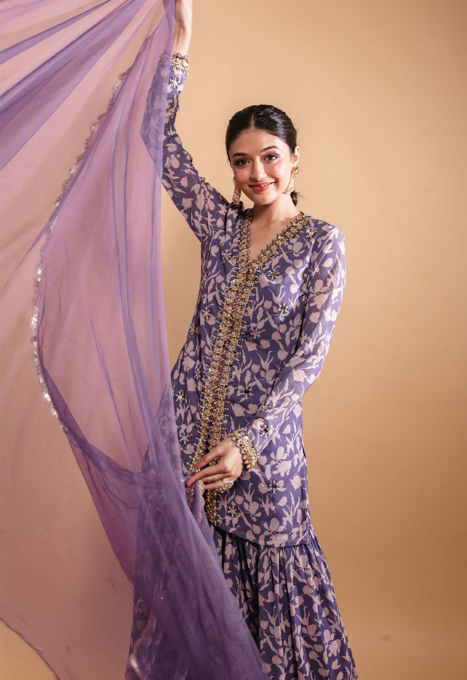 Discover sophistication in our purple print georgette embroidered short top paired with graceful sharara pants and a delicate soft net dupatta. Perfect for weddings and special occasions, this ensemble seamlessly blends intricate embroidery with modern elegance, ensuring a chic and memorable look.