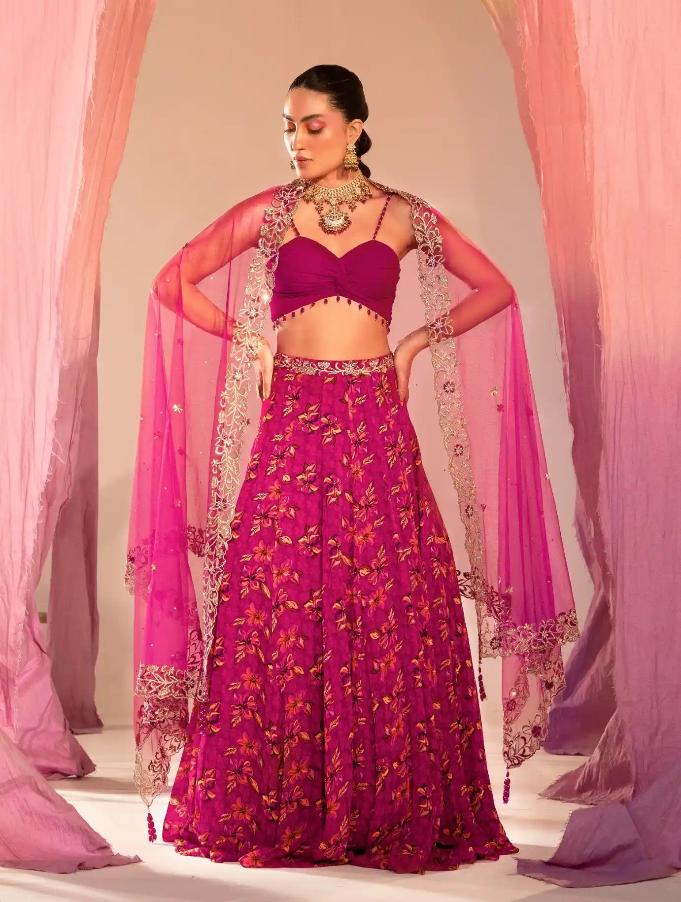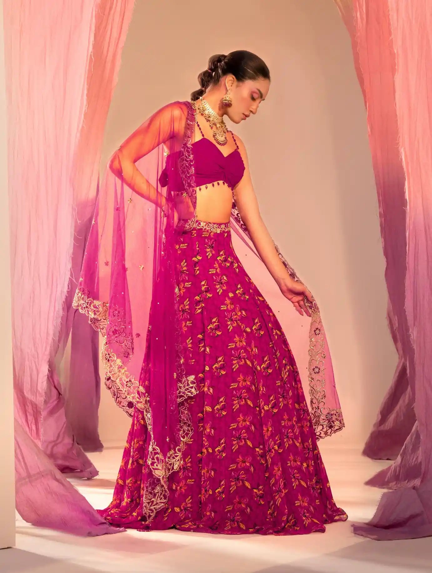 Make a statement with our purple ruching blouse paired with a vibrant printed lehenga and an exquisite embroidered dupatta. This elegant set features flattering ruching that enhances your silhouette, while the striking prints and intricate embroidery add a touch of sophistication. Perfect for weddings or festive celebrations, it’s a stunning choice that combines style and grace!