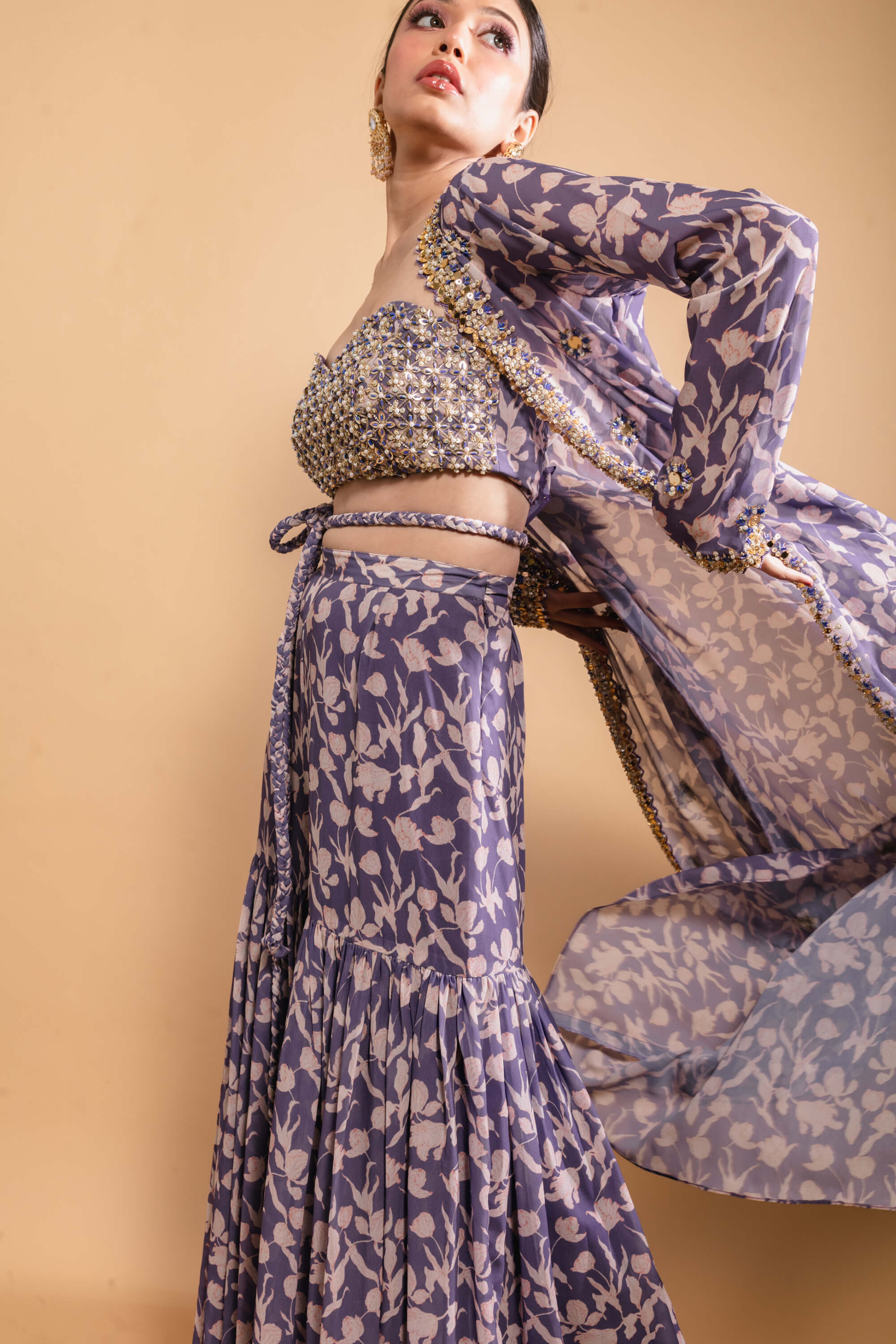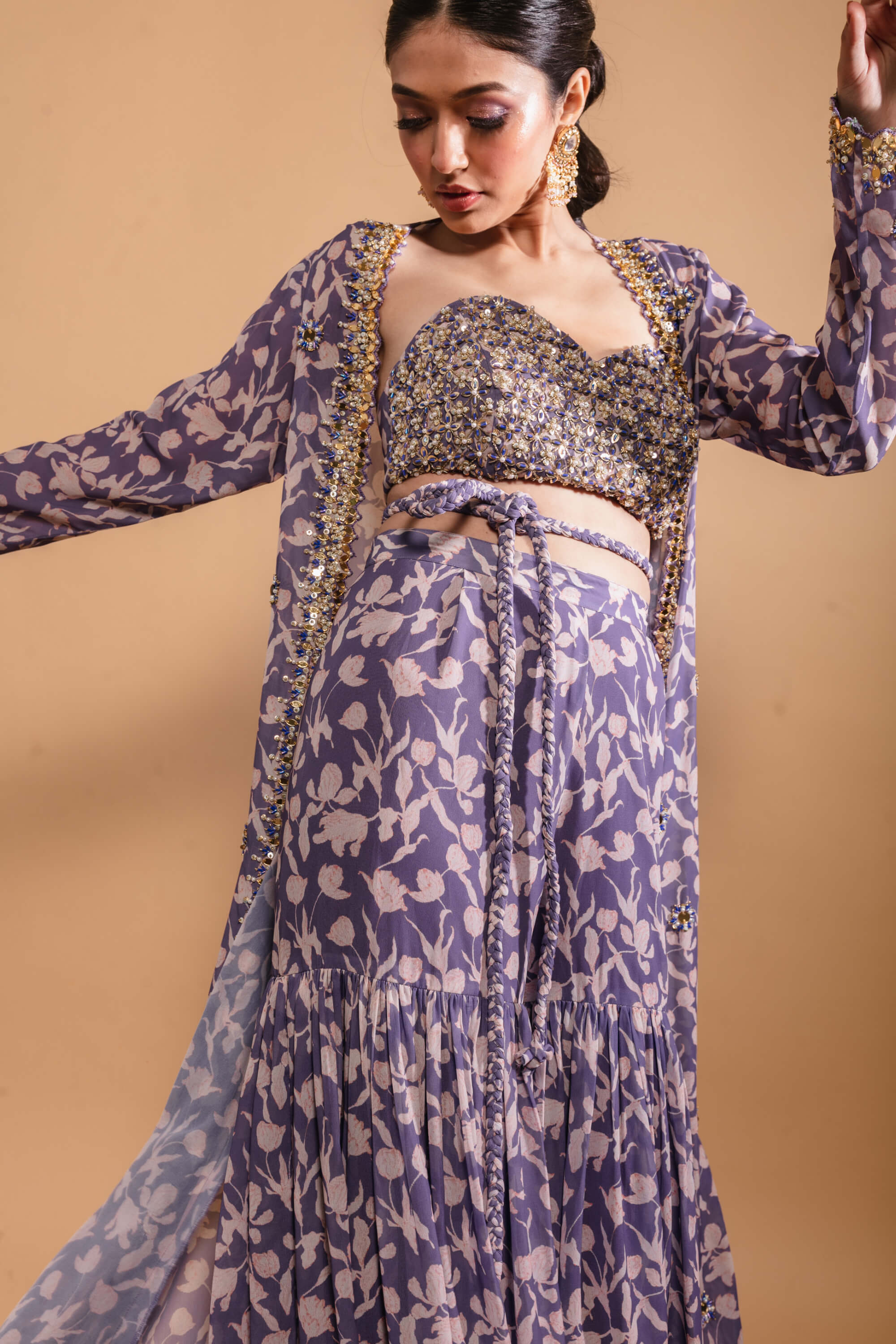 Embrace elegance with our purple print georgette embroidered jacket, beautifully paired with an intricately detailed embroidered bustier, flowing sharara pants, and a stylish braided belt. Perfect for weddings and special occasions, this ensemble combines traditional craftsmanship with contemporary style for a sophisticated and memorable look.