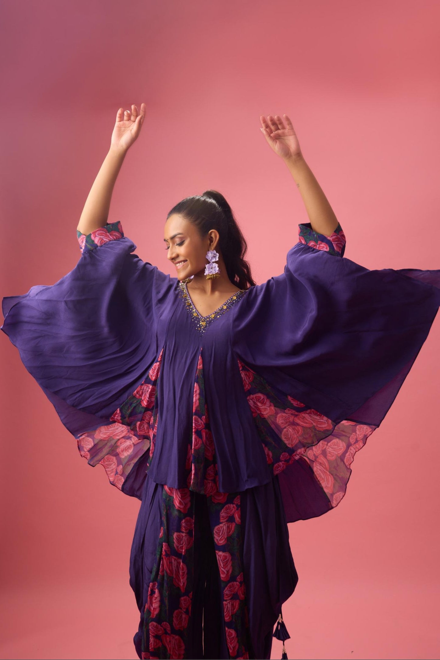 This purple printed kaftan top with godet detailing, paired with a dhoti and printed dupatta, offers a beautiful fusion of vibrant color and contemporary design. The rich purple hue, combined with the intricate print, creates an eye-catching and elegant look, while the godet cut adds a graceful, flowing silhouette to the kaftan. The dhoti provides a modern, comfortable fit, and the printed dupatta adds a touch of texture and dimension, completing the ensemble. Ideal for festive occasions, cultural events, or casual gatherings, this outfit seamlessly blends tradition with modern style.