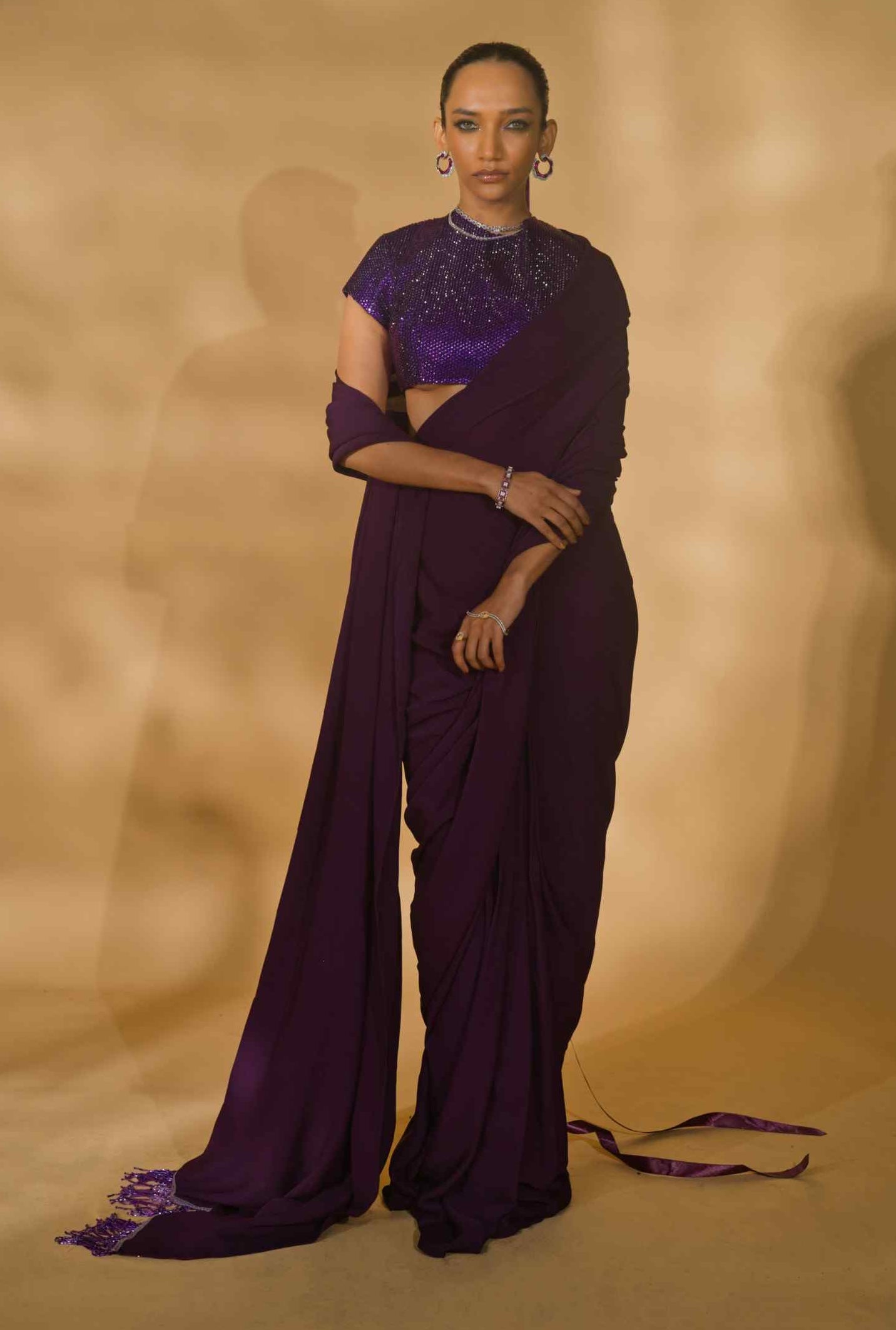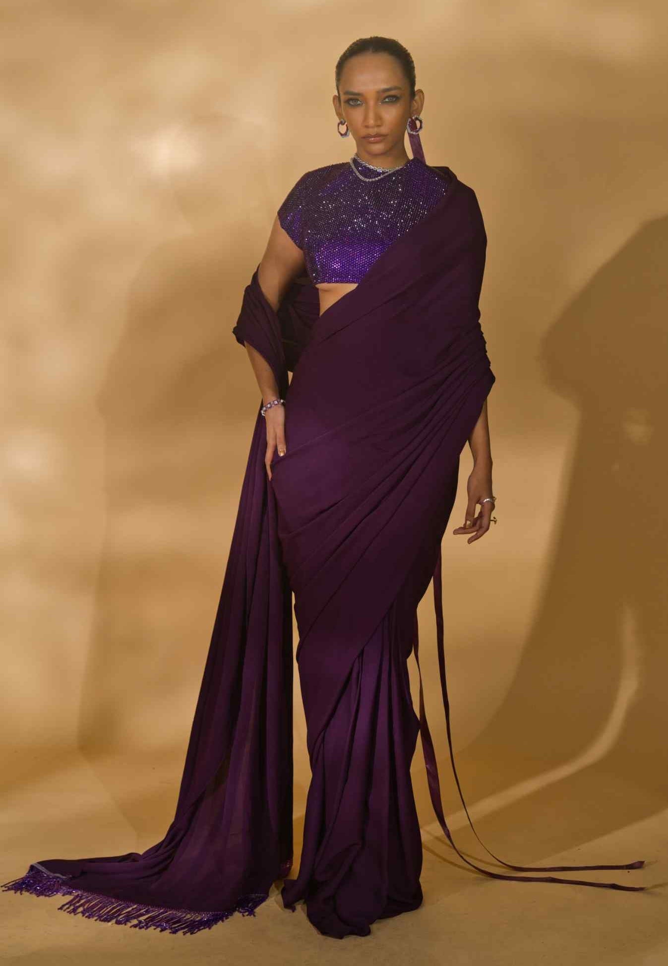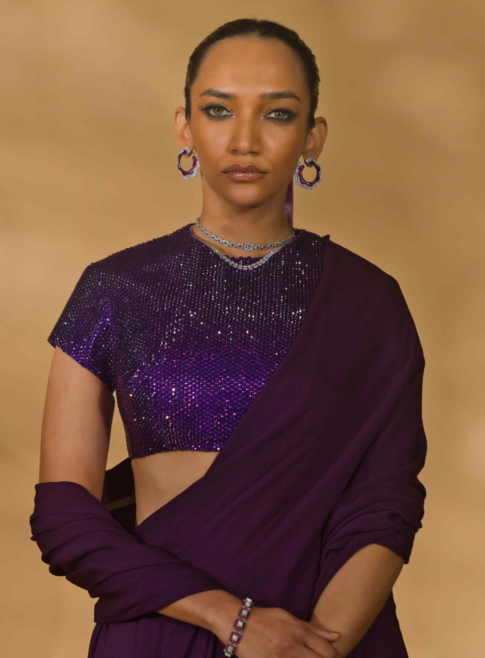 Elevate your elegance with our rhinestone-encrusted basic blouse, perfectly paired with a pre-stitched georgette saree. The blouse features delicate rhinestone detailing that adds a subtle touch of sparkle and sophistication. Complemented by the pre-stitched georgette saree, which offers effortless draping and fluid movement, this ensemble combines modern convenience with classic style. Ideal for formal events, receptions, or special occasions, this outfit seamlessly blends contemporary glamor with timeless grace, ensuring you shine with every occasion.