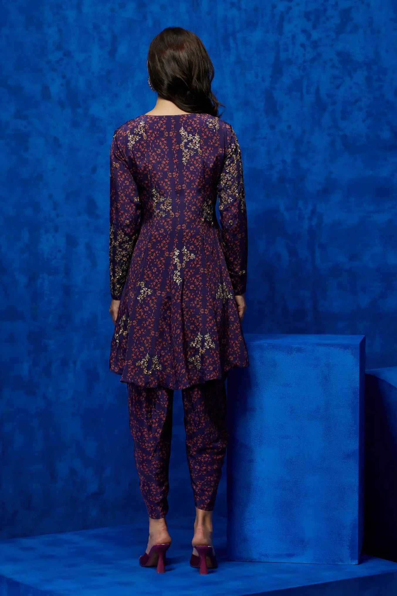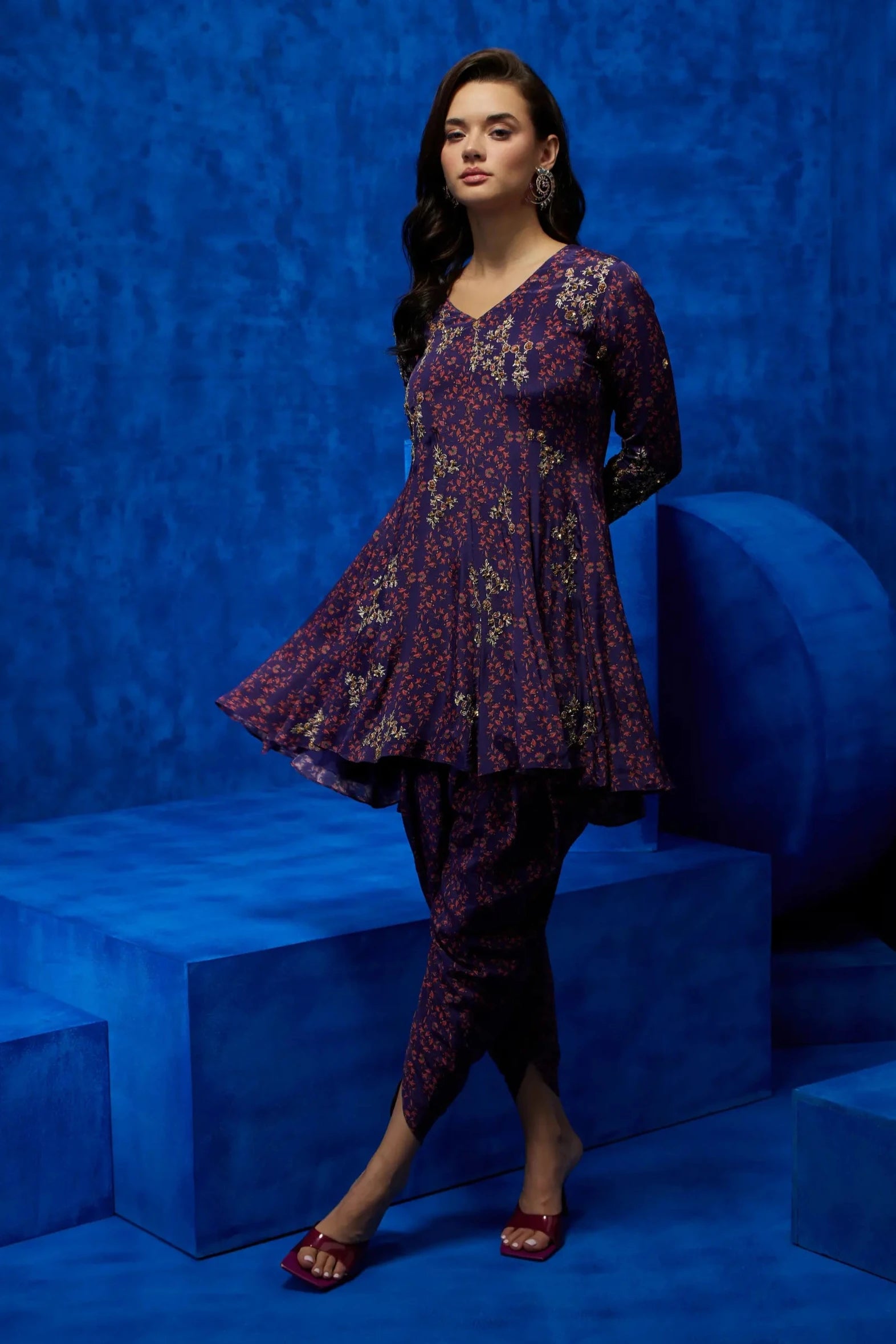 Elevate your casual style with this purple short tunic with draped pants. The rich purple hue of the tunic offers a vibrant pop of color, while the draped pants create a relaxed yet sophisticated silhouette. Perfect for day-to-night wear, this set combines comfort, versatility, and modern flair, making it ideal for casual outings, brunches, or chic weekend events.