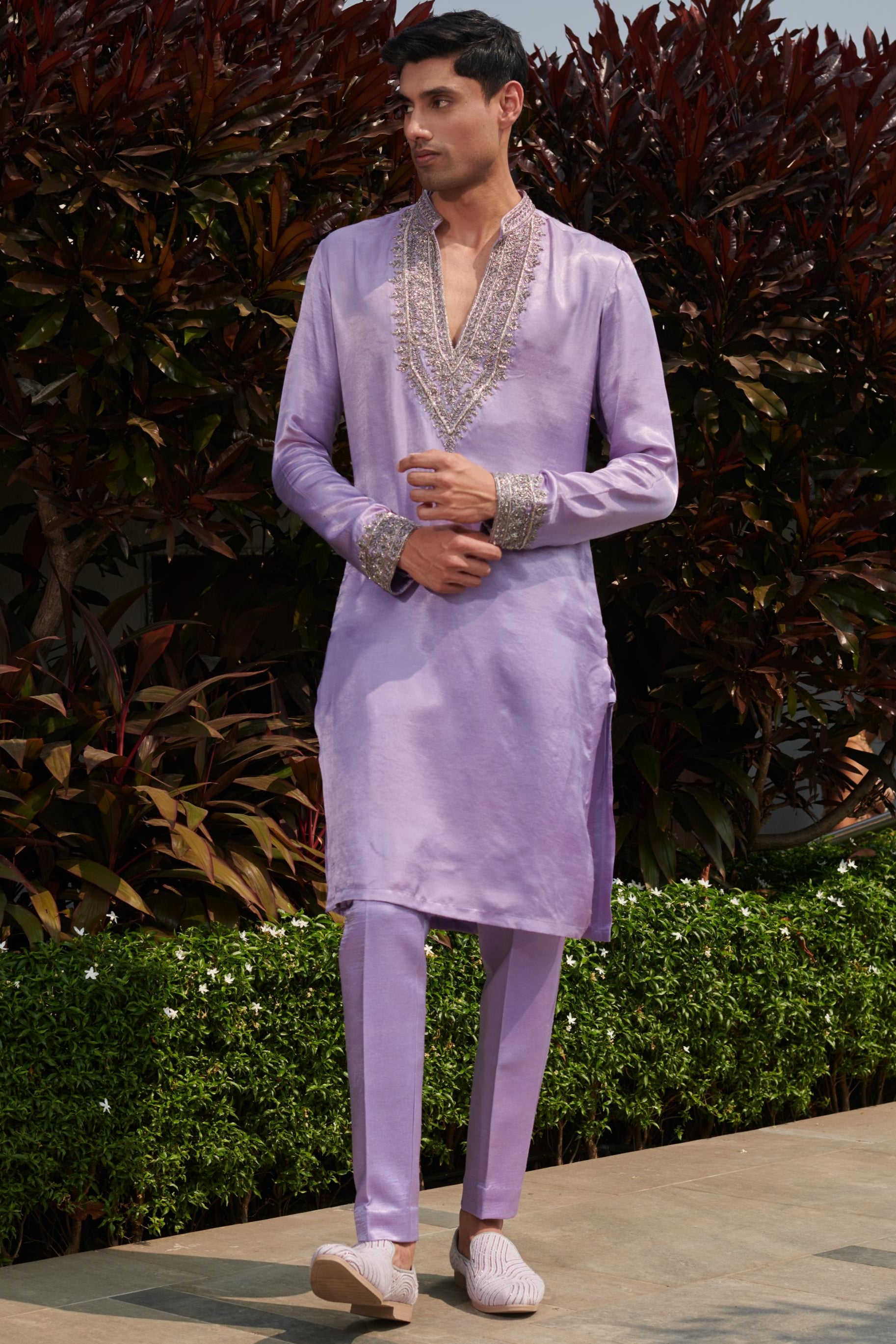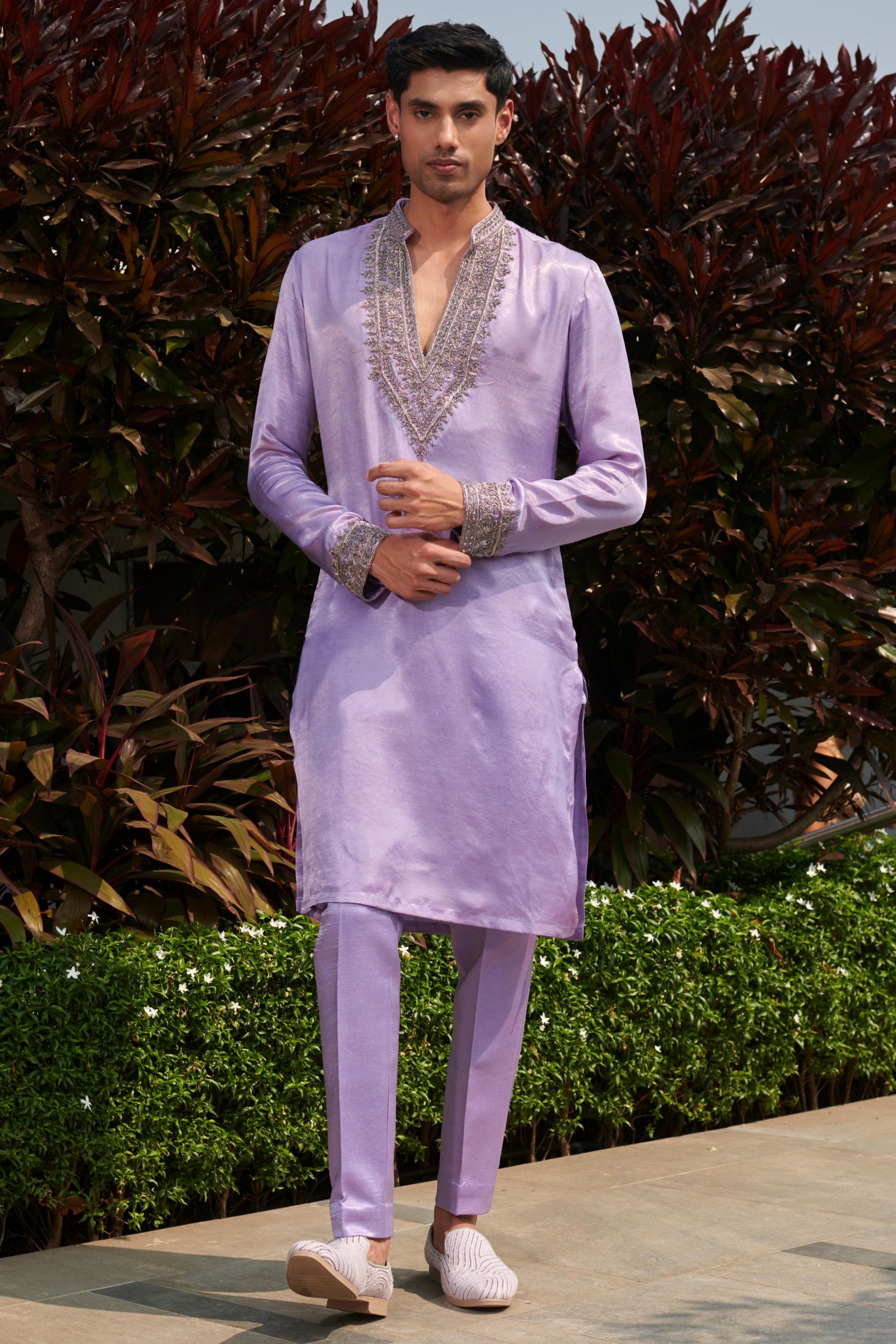 A statement of refined elegance this purple silk kurta features a sleek straight-cut silhouette silver embroidery along the neckline and full-length sleeves. Paired with tailored slim-fit pants this ensemble is ideal for both festive and formal occasions.