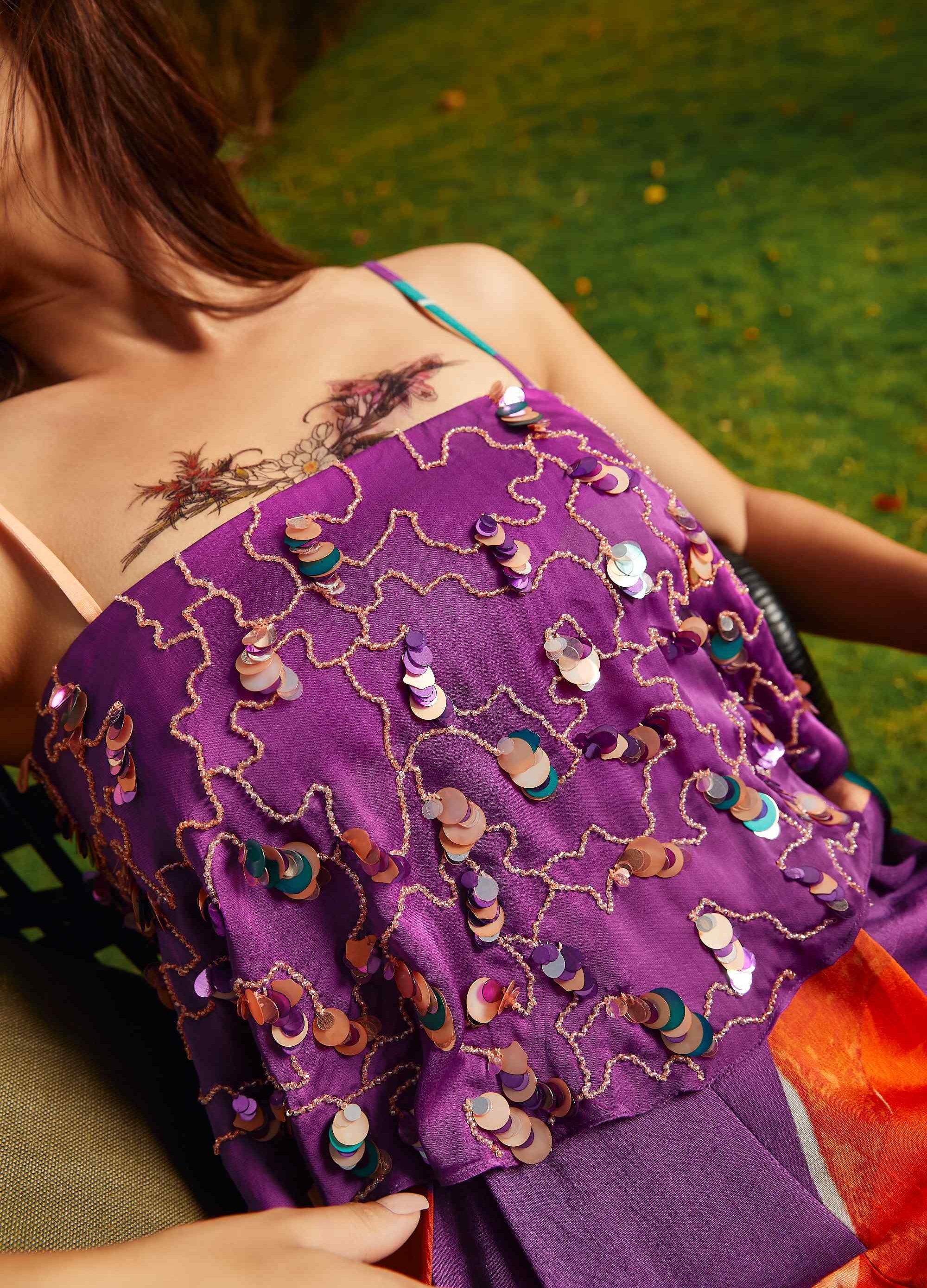 Step into sophistication with our silk printed jumpsuit, featuring elegant box pleat detailing for a flattering, structured silhouette. The look is elevated by an intricate hand-embroidered overlay, adding a touch of artisanal charm and refinement. Perfect for making a stylish statement at any event, this jumpsuit combines luxurious fabric with exquisite craftsmanship for a contemporary yet timeless appeal.