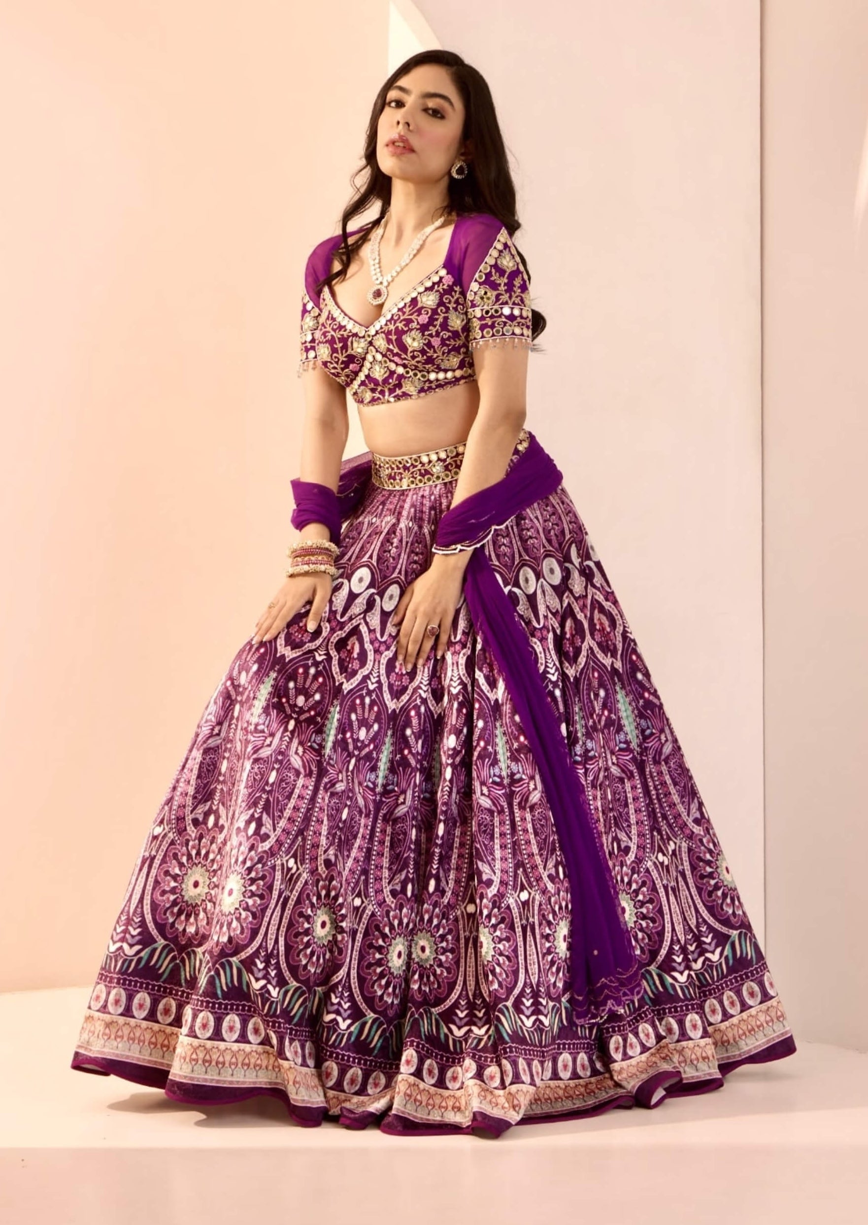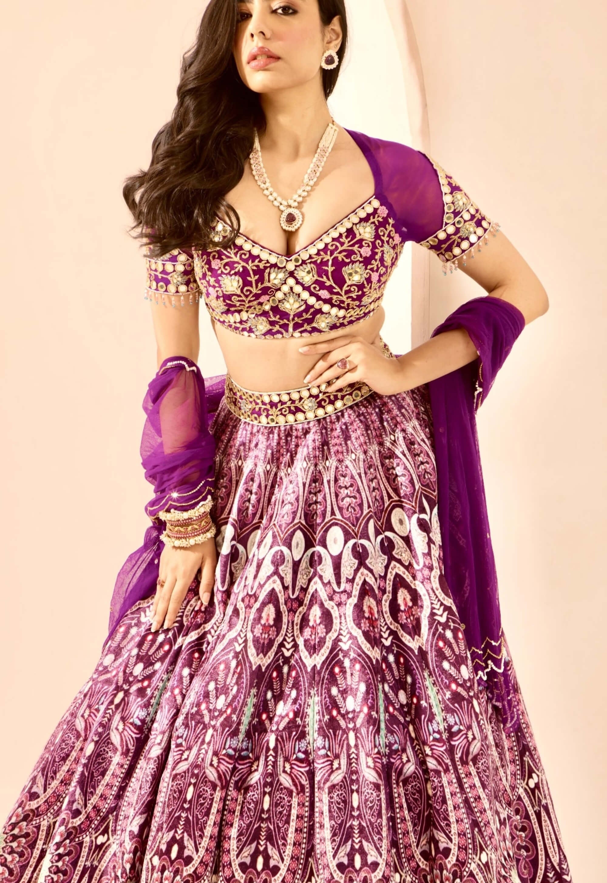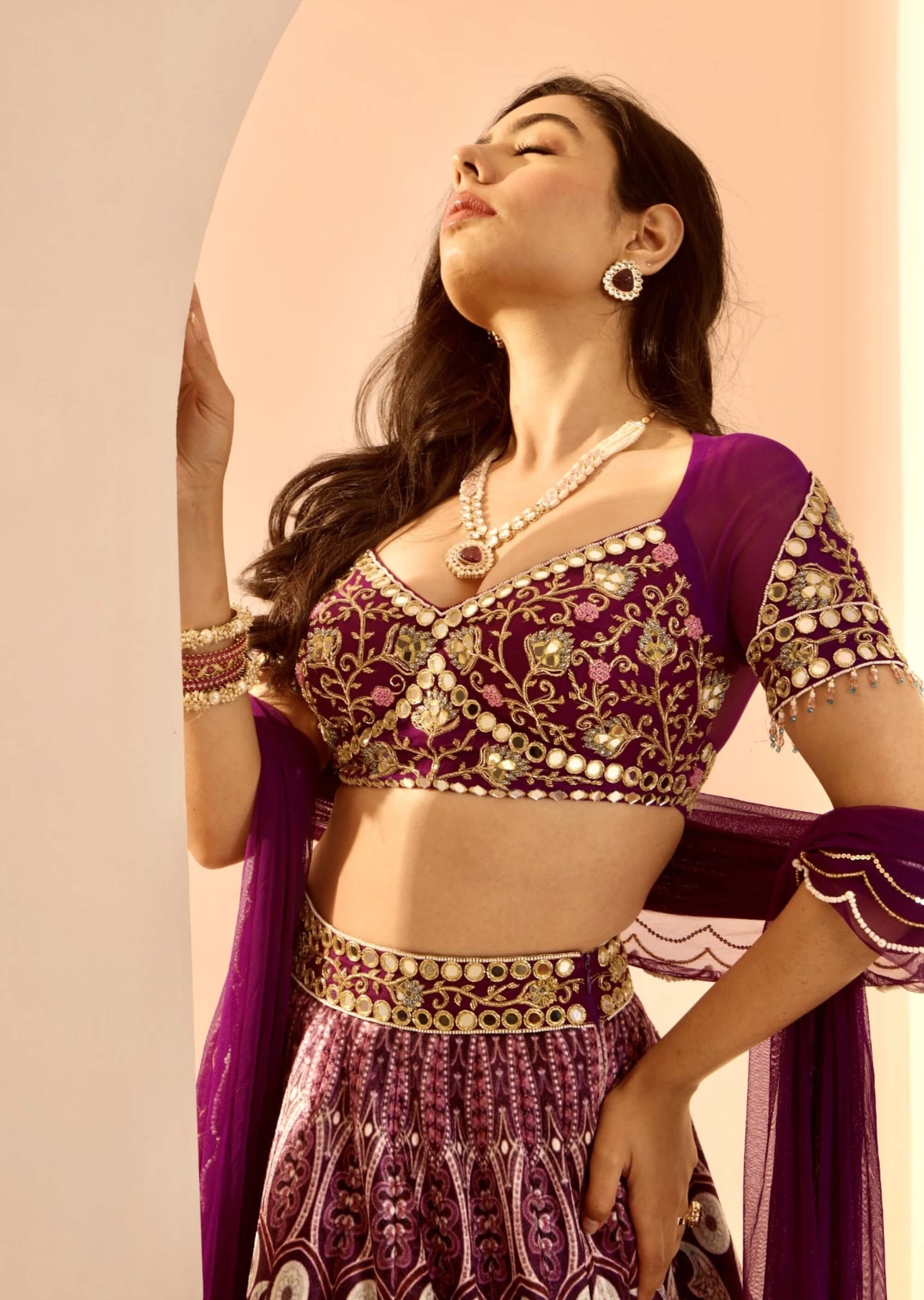 Regal and radiant, the Purple Sitara Embroidered Lehenga Set captures the spirit of celebration with its intricate craftsmanship and luxurious silhouette. Adorned with detailed embroidery and set in a rich purple tone, this lehenga set is perfect for sangeets, receptions, or evening festivities. The flattering blouse and gracefully flared skirt create a striking presence, making it a standout piece in your festive wardrobe.