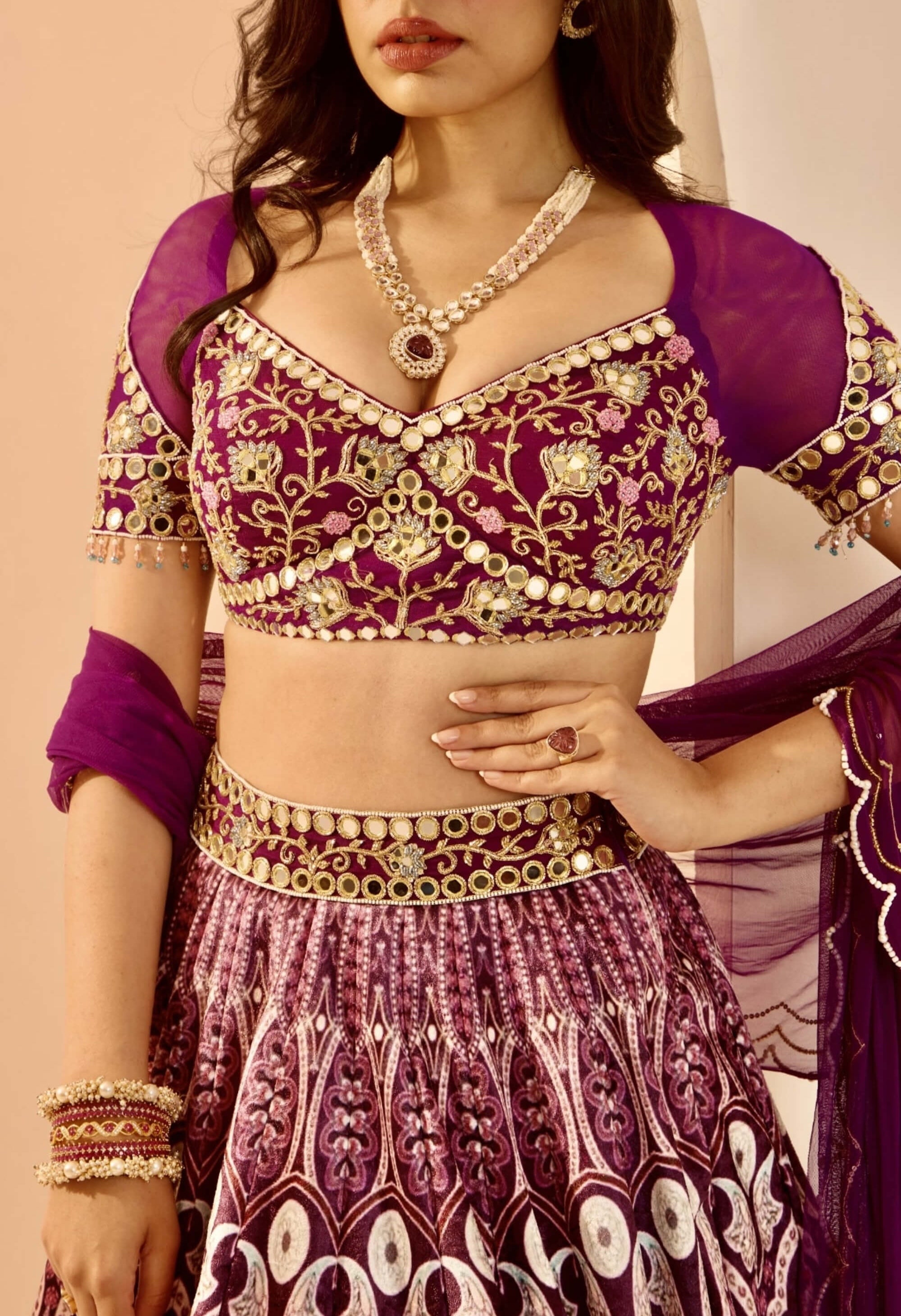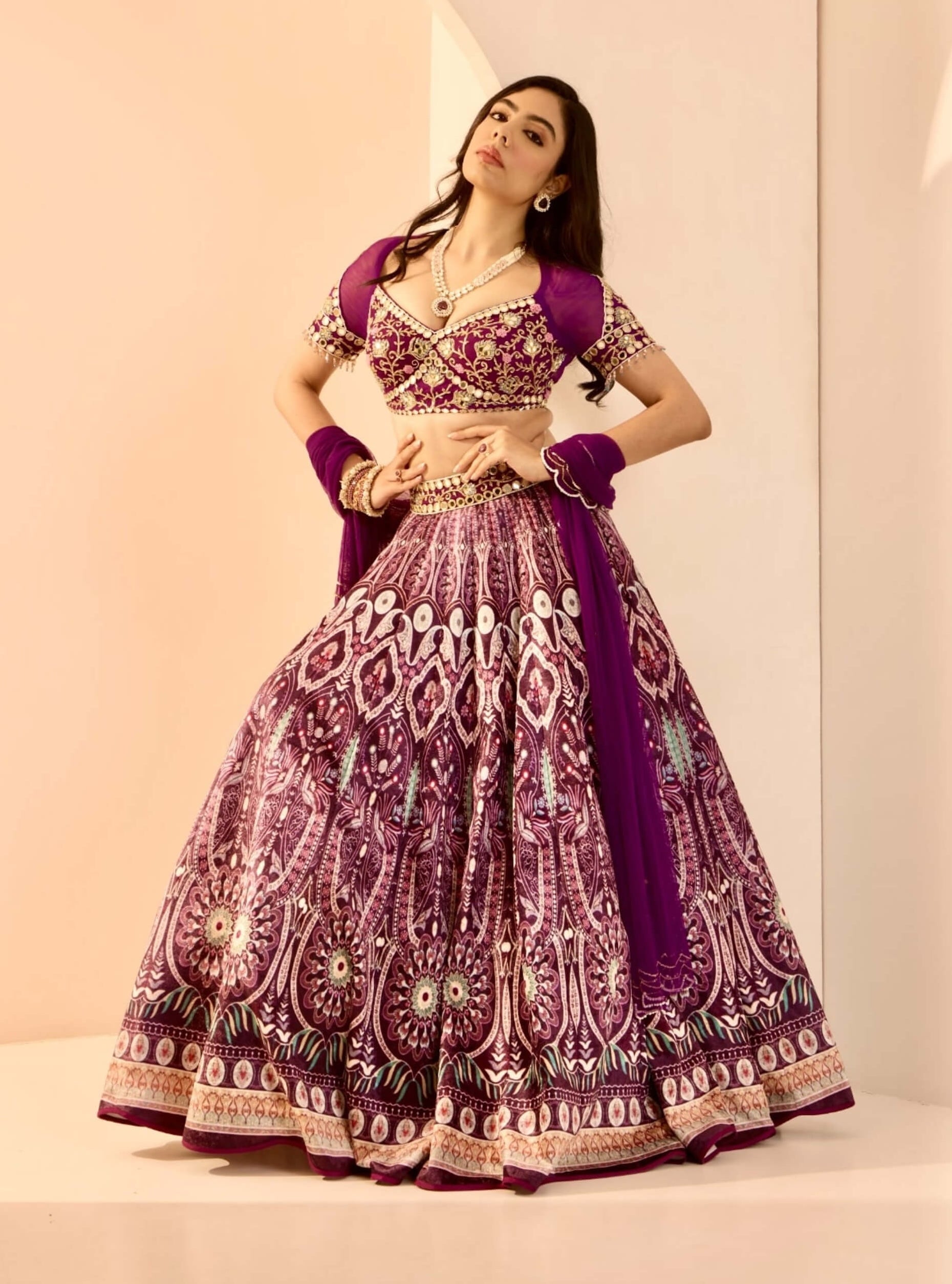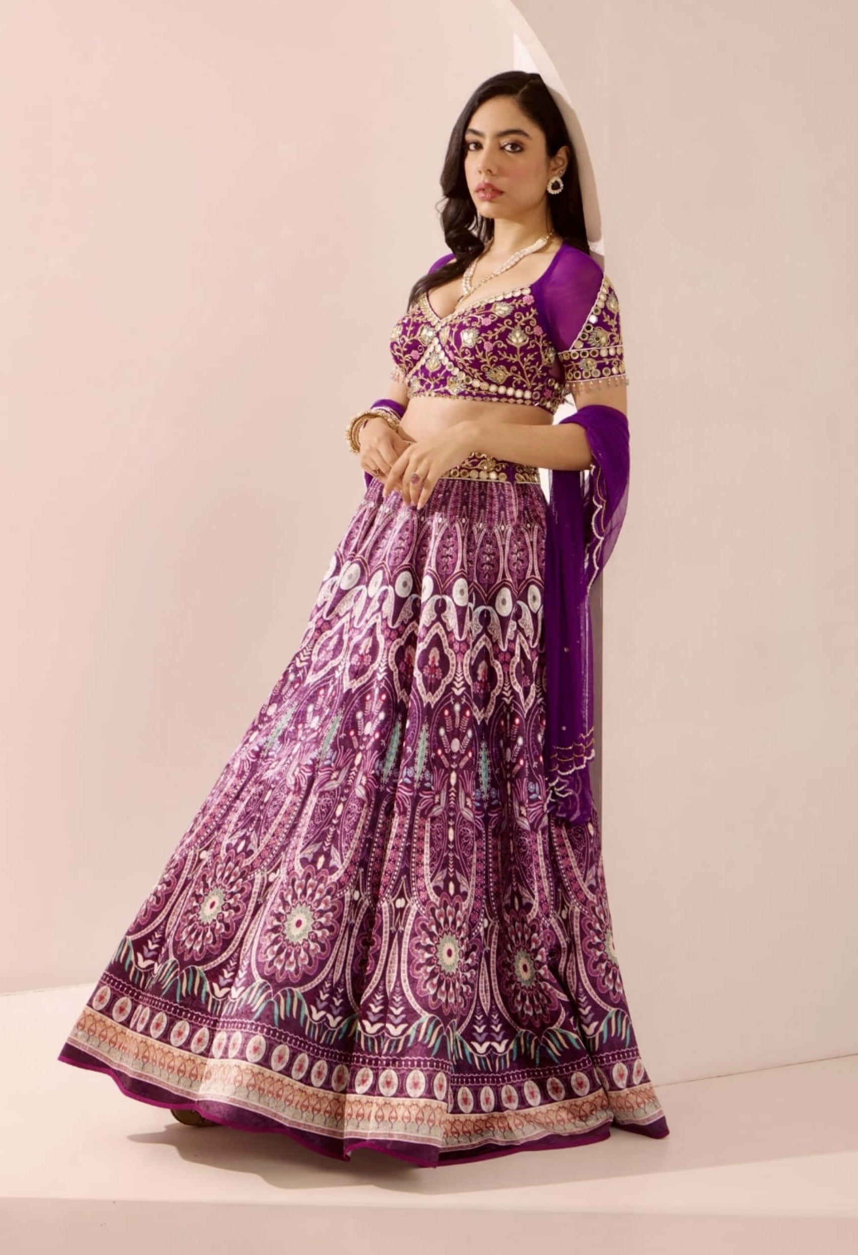Regal and radiant, the Purple Sitara Embroidered Lehenga Set captures the spirit of celebration with its intricate craftsmanship and luxurious silhouette. Adorned with detailed embroidery and set in a rich purple tone, this lehenga set is perfect for sangeets, receptions, or evening festivities. The flattering blouse and gracefully flared skirt create a striking presence, making it a standout piece in your festive wardrobe.