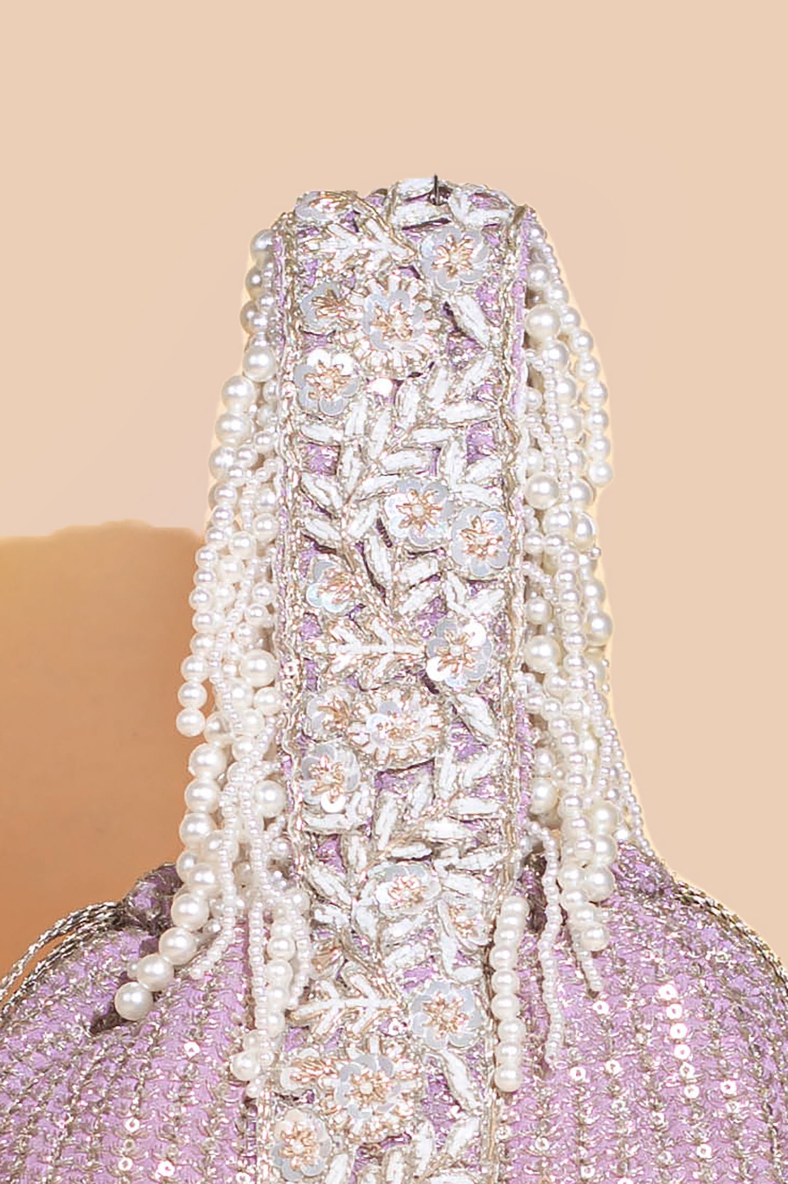 Elevate your festive look with our embroidered potli, crafted from luxurious georgette and poly silk. Featuring intricate net lace, woven gold thread drawstrings, and a hand-embroidered zardosi handle, this piece exudes elegance. Adorned with pearl fringes and tassels, itÕs the perfect accessory to complement your wedding or celebration ensemble with grace and sophistication.