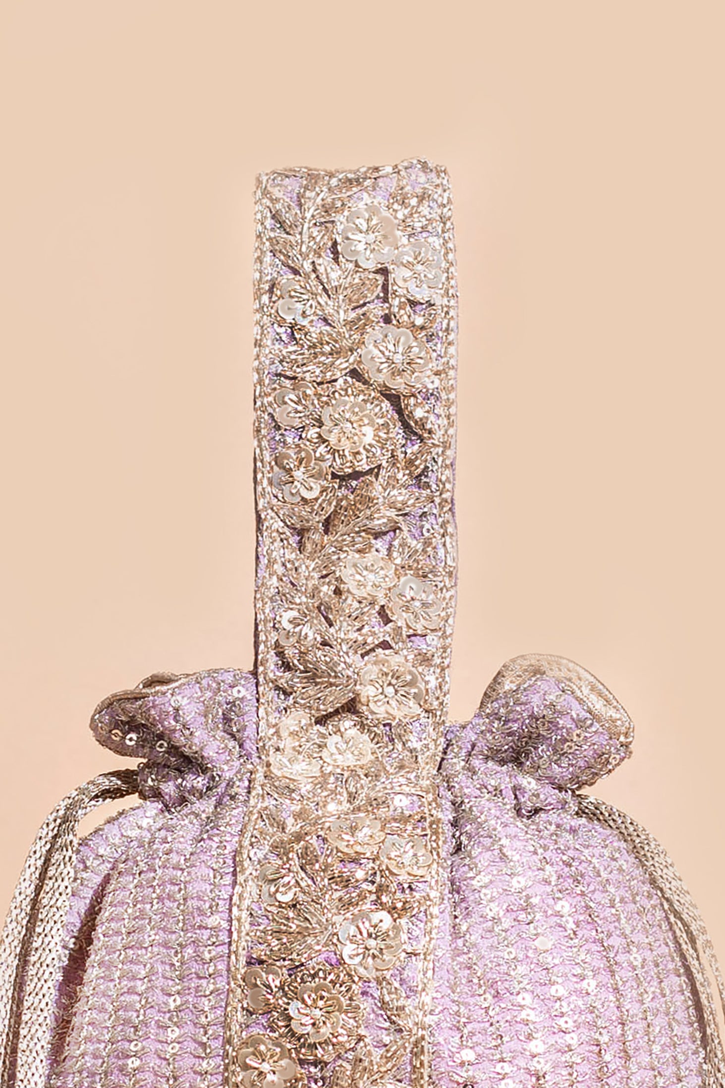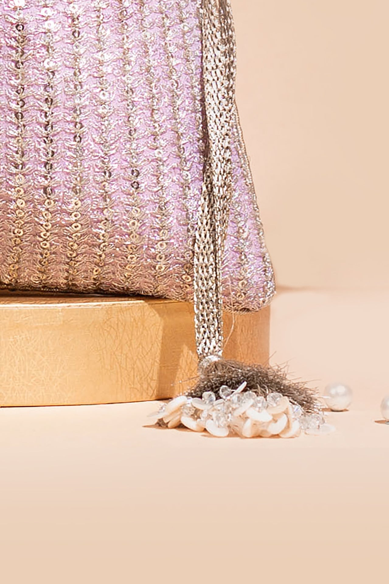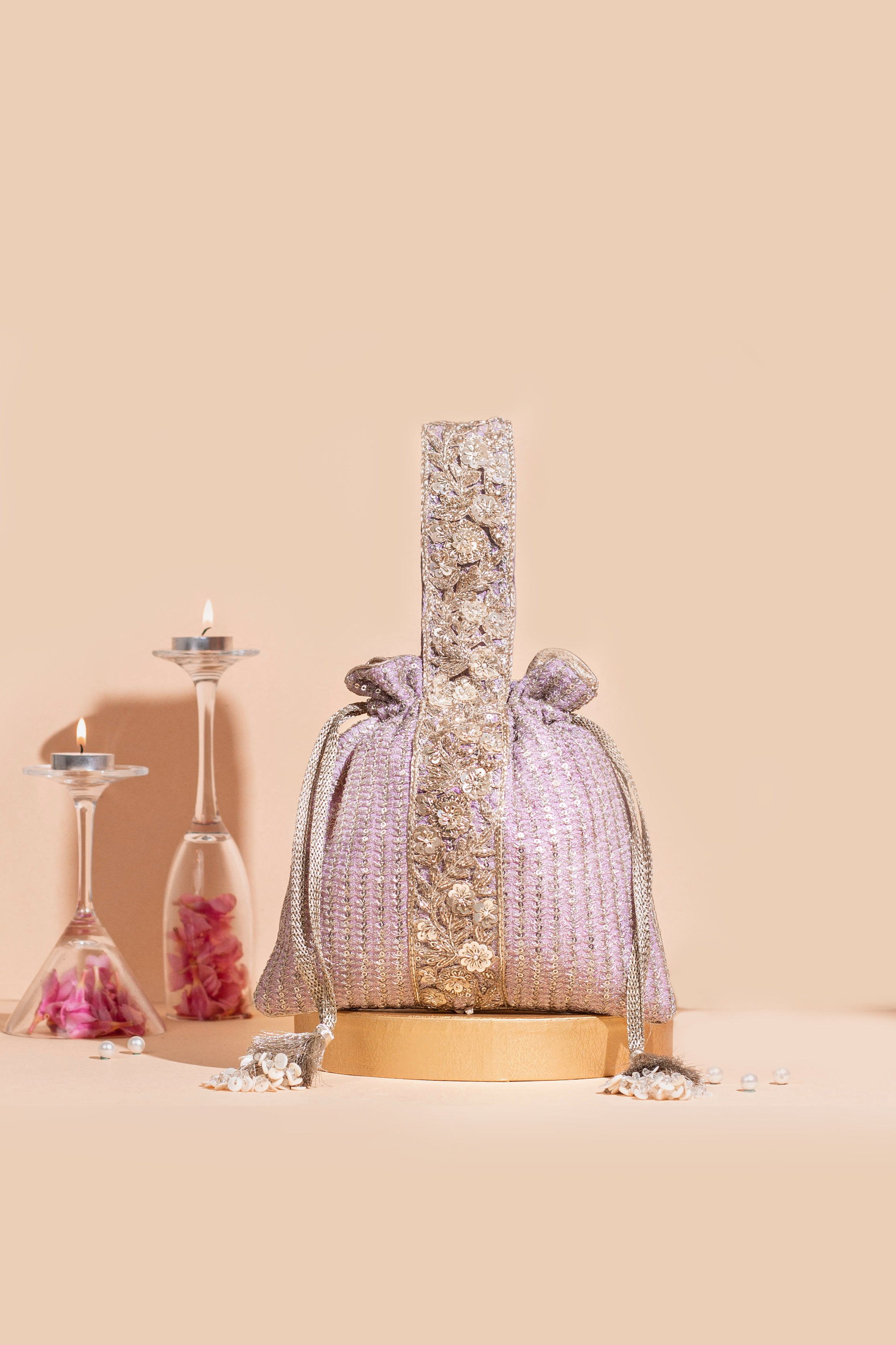 Crafted from embroidered georgette fabric with a poly satin lining, this exquisite clutch features woven golden thread drawstrings and a hand-embroidered zardosi handle. Adorned with elegant gold zari tassels, it adds a touch of sophistication and tradition to any festive or wedding ensemble, making it the perfect accessory for special occasions.