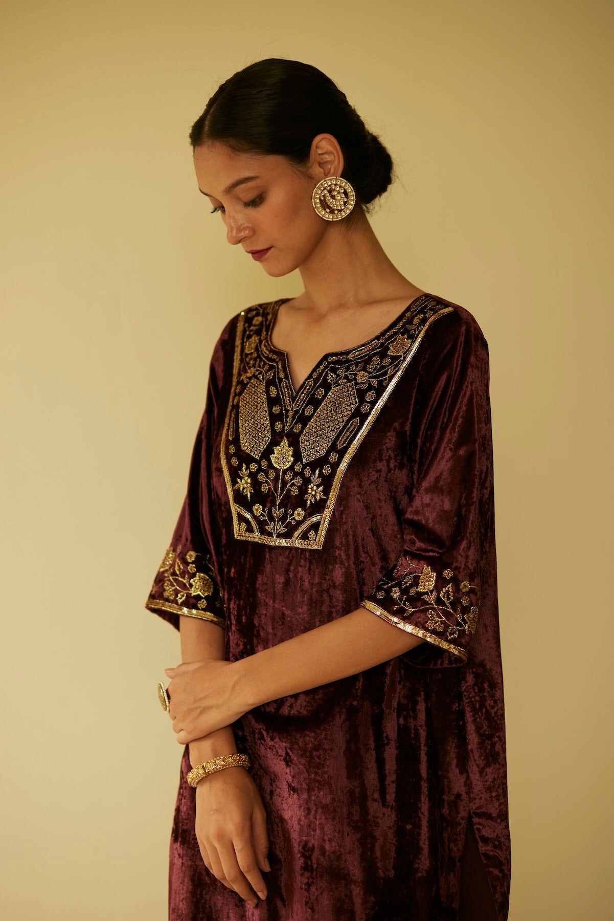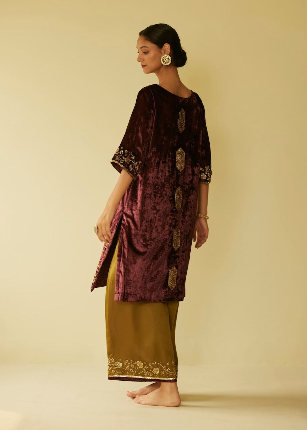 The purple meera kurta set offers a striking combination of elegance and richness. The kurta, crafted in luxurious velvet, exudes opulence and depth, while the accompanying pants made from smooth mushroom silk add a touch of sophistication and comfort. Together, these pieces create a beautifully balanced and refined look, ideal for formal events and special occasions.