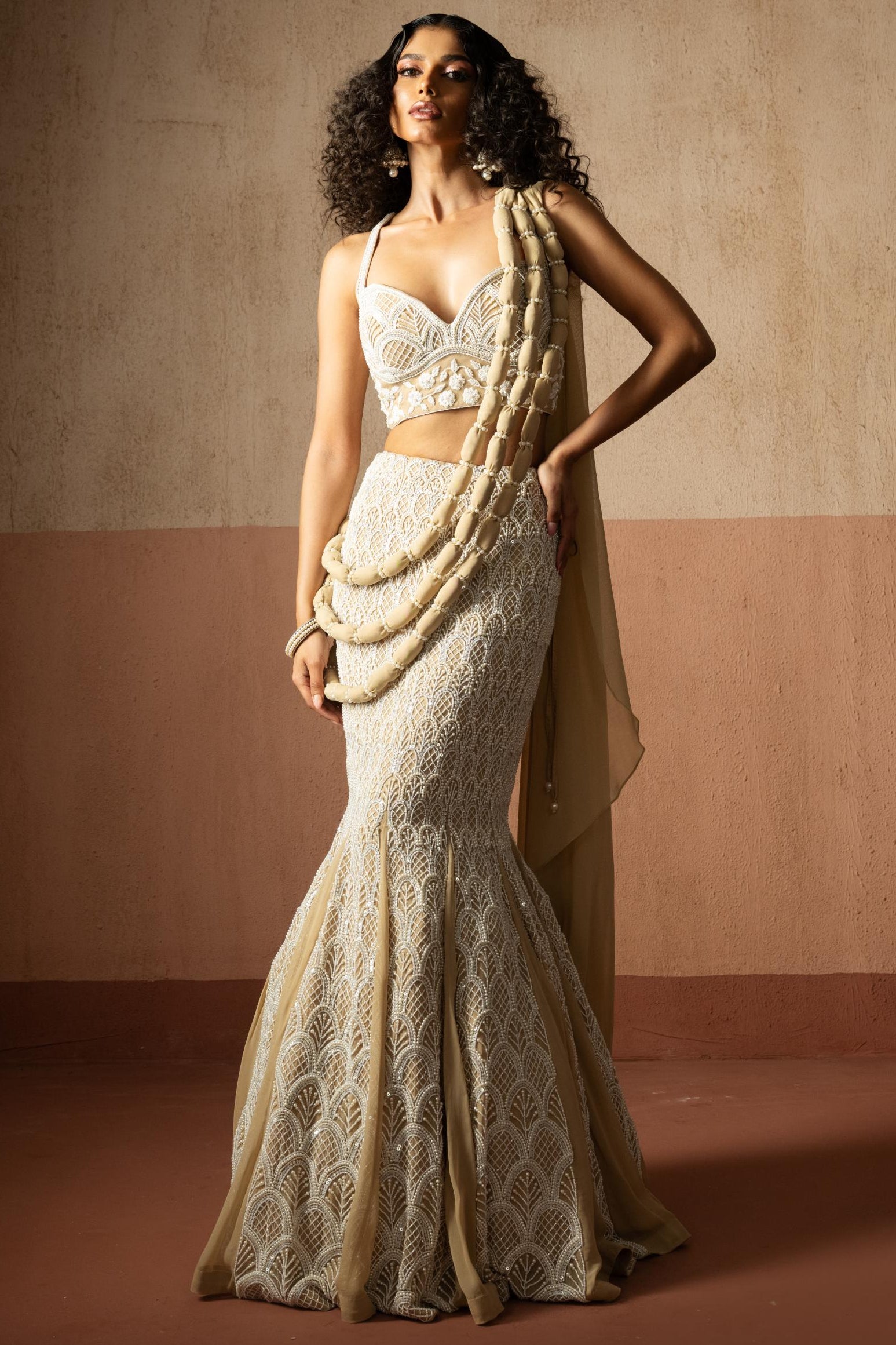 The Beige & Ivory Heer Concept Fishtail Drape Saree is a fashion-forward interpretation of classic draping. With its dual-tone palette and conceptual silhouette, this piece is perfect for women who love sophisticated experimentation. Ideal for cocktail nights, receptions, and designer-led celebrations, it offers sculpted structure with artistic movement.